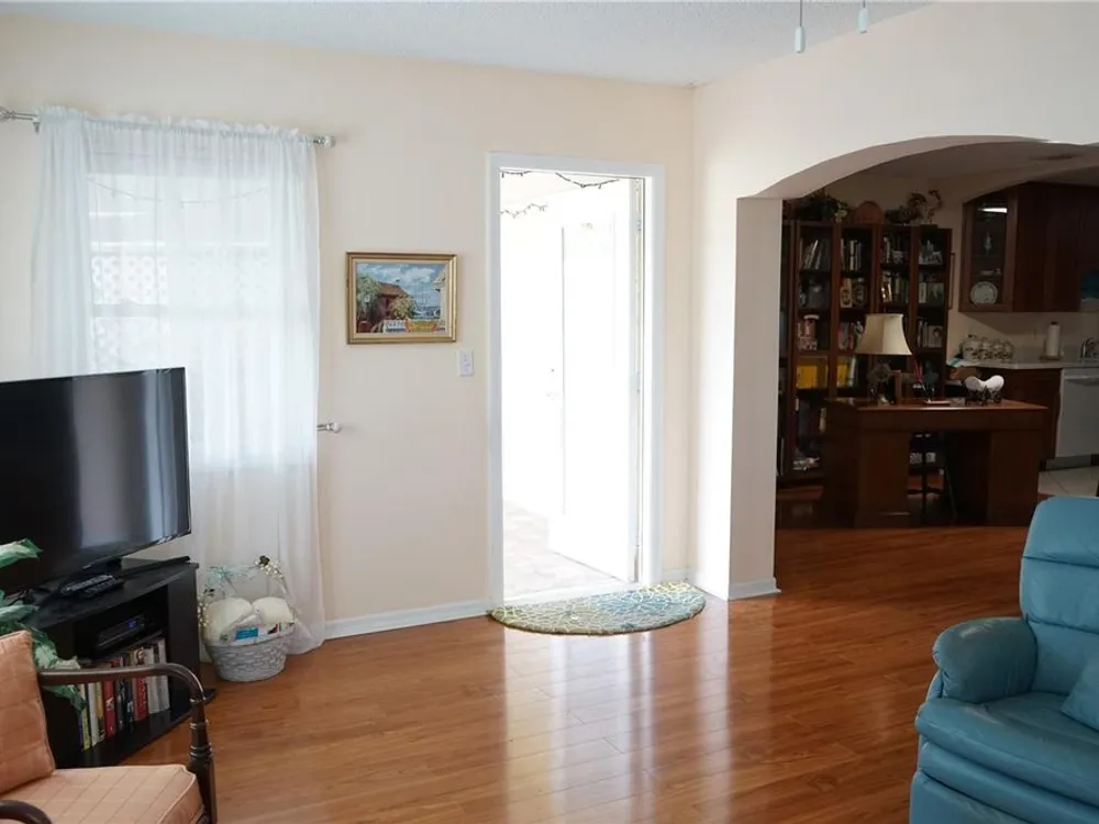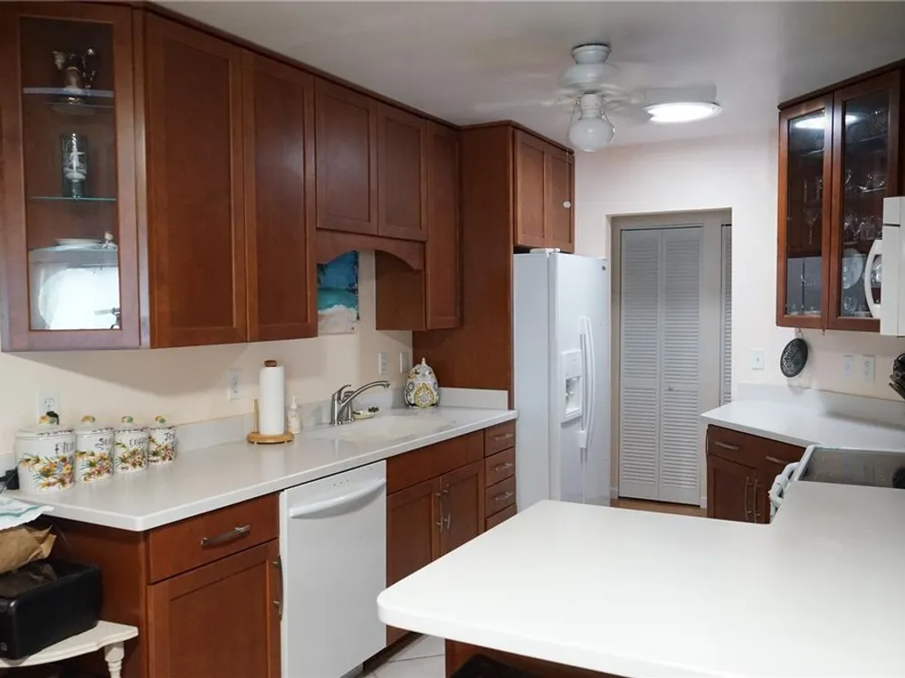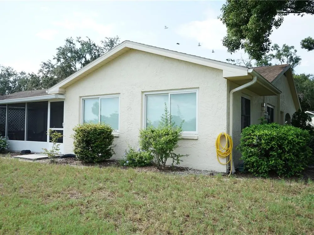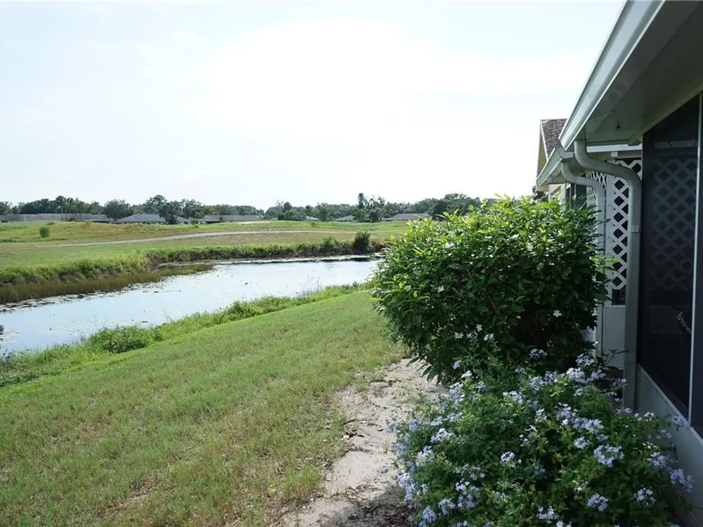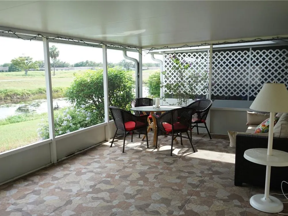 This attached home is located in Kings Point, one of Florida's best retirement communities where your month fee covers just about everything making life here easy. The home has CPVC pipes, water tank 2021, AC 2025, good breakers and some windows in 2011, You have a driveway long enough for 2 cars with one under the roof, There is a golf cart garage or use it for bikes and beach gear too. The front screened porch is nice and private with the flowering bushes then you enter into the foyer. The hallway to your right takes you to the galley style kitchen with nice cabinets and plenty of counter space. Loads of closets in the hallway along with the laundry area and the guest bedroom and full bath are here too. Taking the hallway straight you come to the dining room and the breakfast/office space at the end of the kitchen. There you'll find the owners bedroom and en suite bathroom with a walk in shower. The living room is at the back to enjoy the water and greenspace views with another screened porch the enjoy the breeze while watching the birds. This community has lots to offer and is within an hour of 3 airports and multiple beaches and entertainment for all ages.