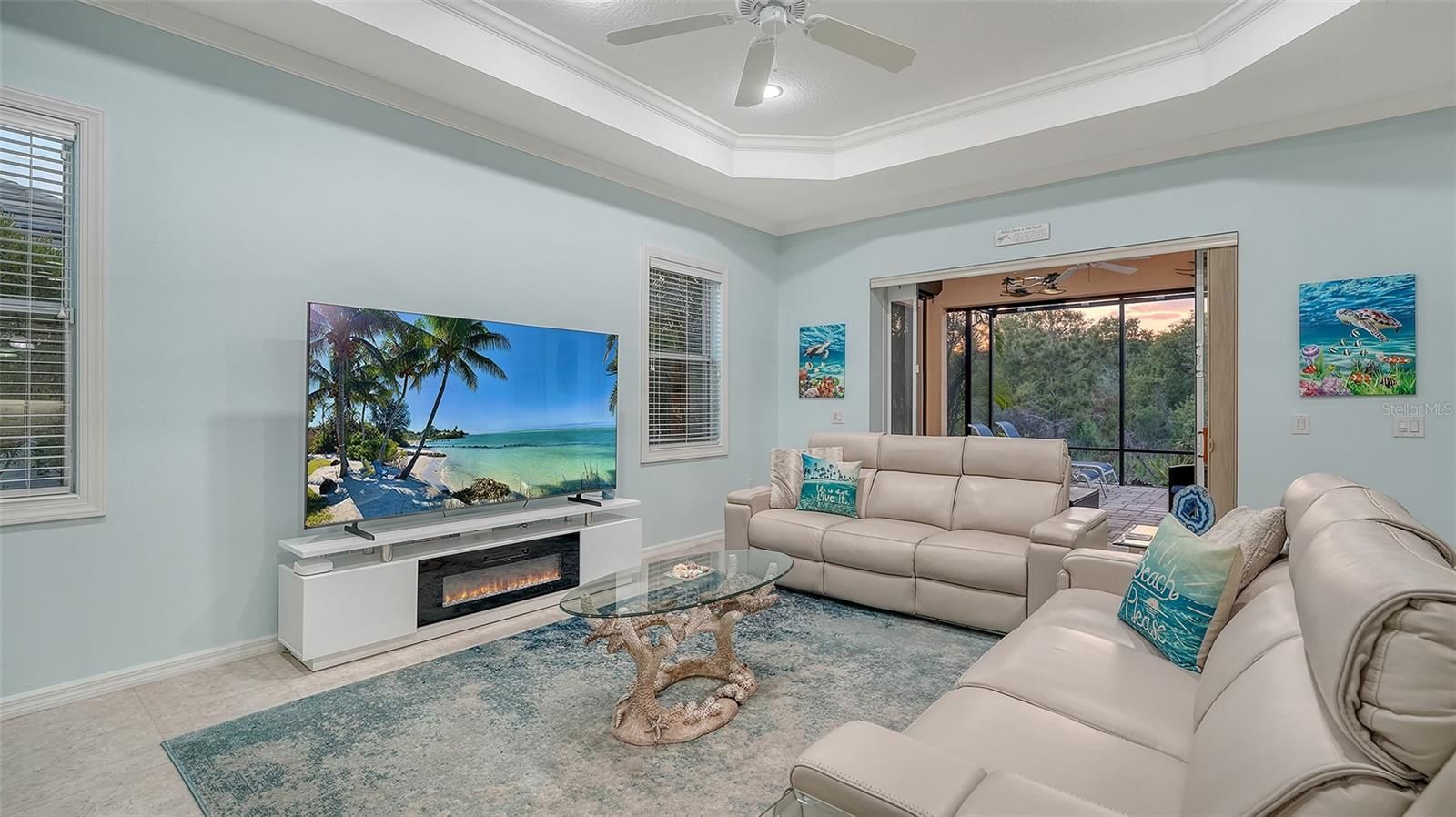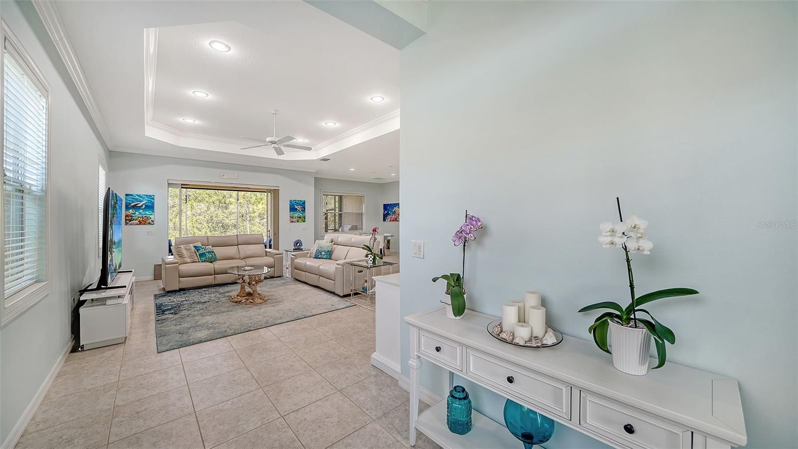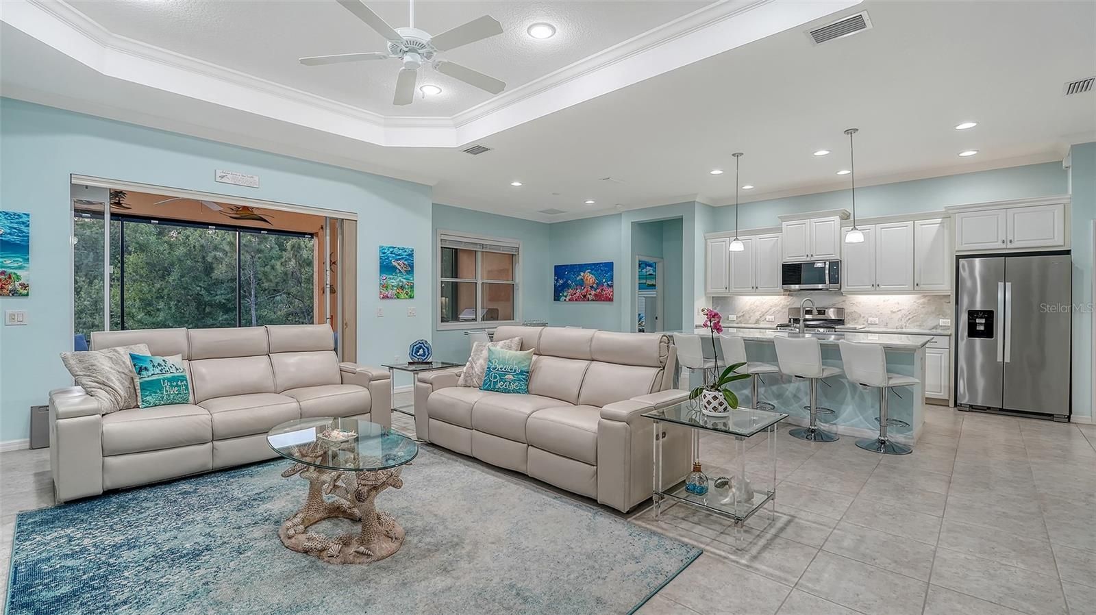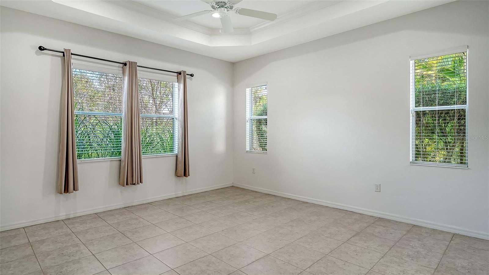 - Ceiling Fan(s), Crown Molding, High Ceilings, Kitchen/Family Room Combo, Living/Dining Room, Open Floorplan, Main Level Primary, Stone Counters, Tray Ceiling(s), Walk-In Closet(s)
