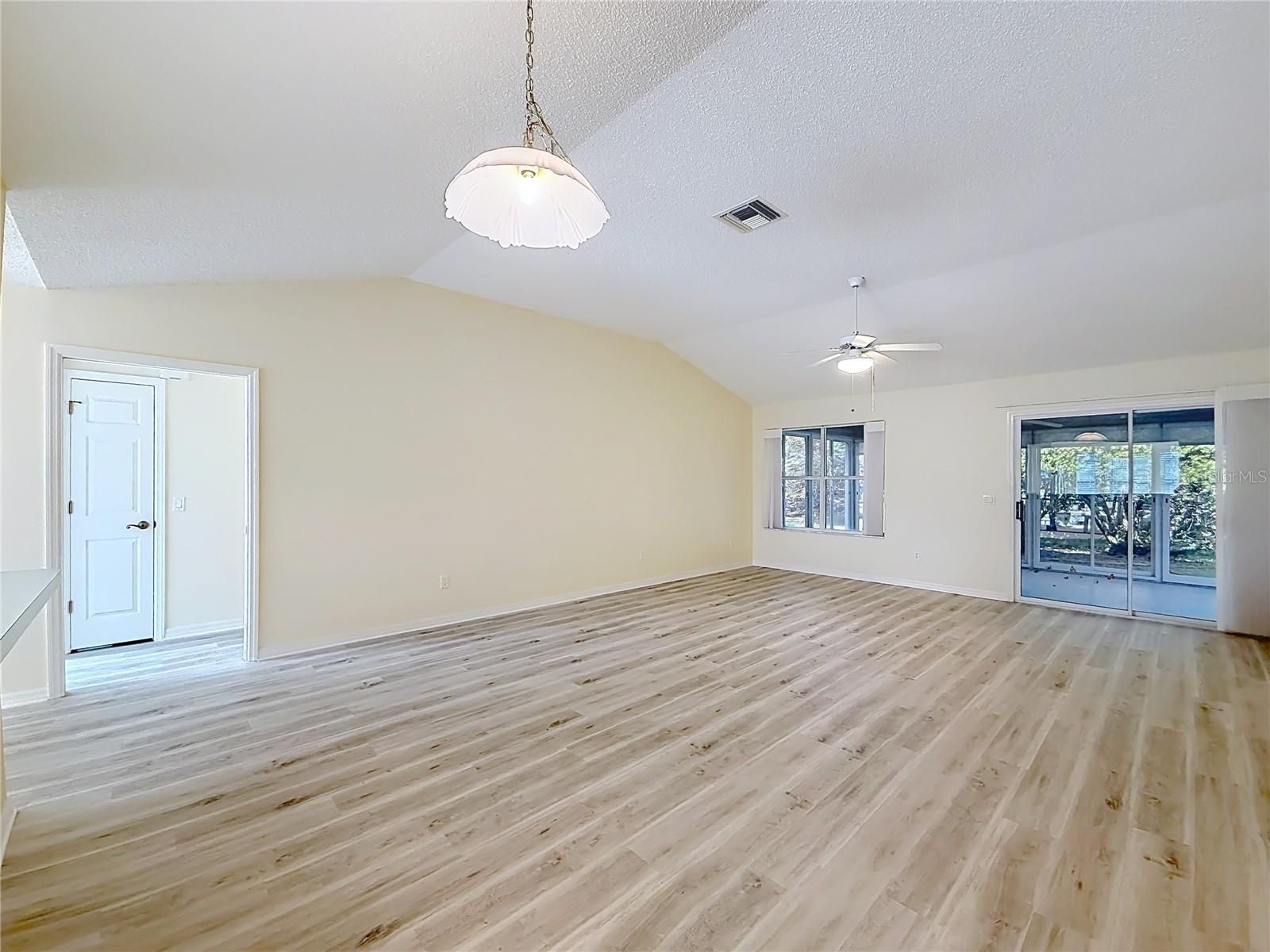 No Bond! This well-maintained 3-bedroom, 2-bath home offers effortless living on a spacious corner lot tucked within a quiet cul-de-sac, surrounded by neatly manicured landscaping in a park-like setting. Ideally positioned near both golf and nature, you’re just a short golf cart ride to multiple championship & executive courses, great shopping & restaurants, top flight medical centers, and the Villages Hospital. A stroll through the neighborhood reveals a peaceful setting, with golf fairways on one side and a large scenic pond on the other. The home sports a bright, welcoming entry opening into a central hallway with an expansive main living area straight ahead, a sizable kitchen to the right, and a separate hallway to the left leading to two guest bedrooms and a full bath. New luxury vinyl hardwood flooring was recently installed throughout! No carpeting! The large main living and dining area features vaulted ceilings and an open-concept layout, ideal for both everyday living and entertaining, with flexible options for seating and dining. A pass-through from the kitchen enhances the openness and connection between spaces. The generously sized kitchen is well-equipped with ample counter space and appliances, complemented by a cozy front dining area highlighted by bay windows and convenient access to the garage. A private hallway off the living area leads to the spacious primary master bedroom, offering a large walk-in closet and an en-suite bath with dual vanities and a glass-enclosed shower. On the opposite side of the home, two additional bedrooms provide excellent privacy—one featuring front-facing bay windows and the other overlooking the beautifully landscaped backyard—with a full bath in between. Sliding glass doors extend the living area into a large enclosed lanai/Florida room with tile flooring and floor-to-ceiling sliding glass panels on multiple sides. This space is filled with natural light and showcases expansive views of the surrounding greenery. The flexible design allows you to open the panels for fresh air or keep them closed for a more climate-controlled environment, creating a bright and comfortable space for relaxing or entertaining. From the lanai, step out to a small concrete patio—perfect for outdoor seating and grilling—set within a private yard framed by mature landscaping. The setting offers a fresh, open feel and a peaceful, garden-like atmosphere ideal for enjoying Florida living. READY TO MOVE-IN AND LIVE COMFORTABLY! CONVENIENTLY LOCATED TO EVERYTHING AND YET ON A PRIVATE CUL-DE-SAC WITH A LARGE CORNER LOT. A GREAT OPPORTUNITY AT A GREAT PRICE! YOU DON’T WANT TO MISS THIS JEWEL!