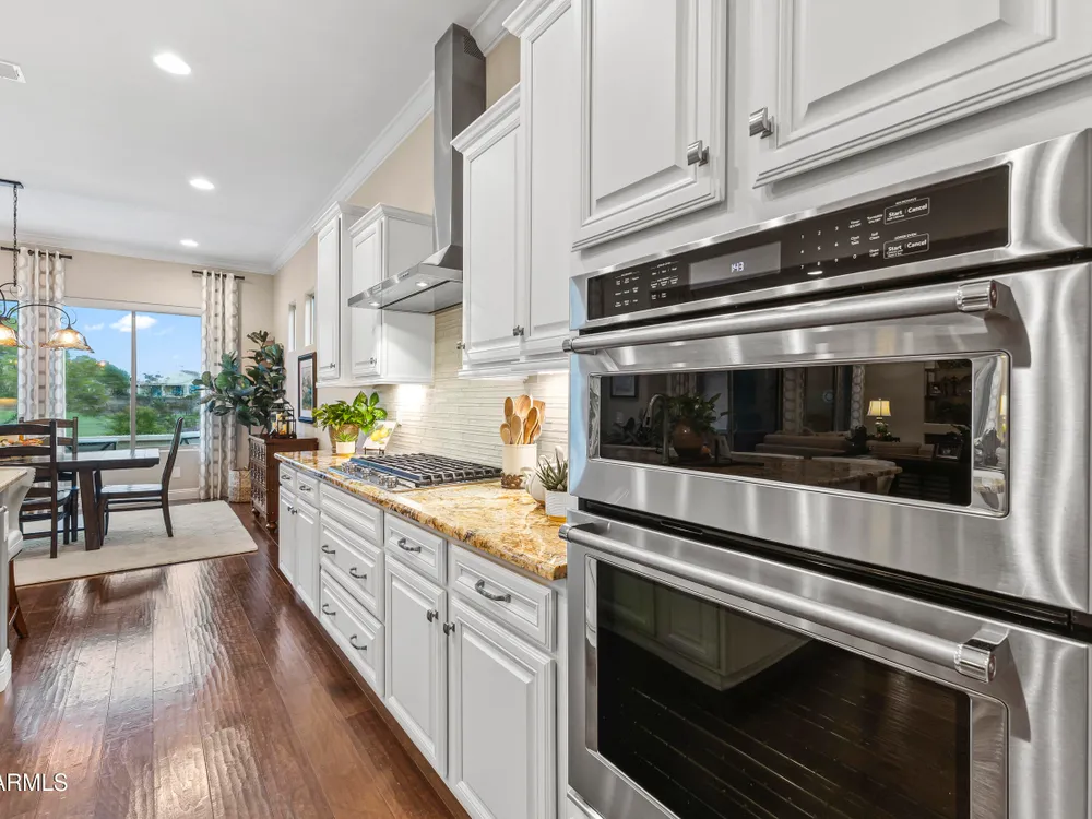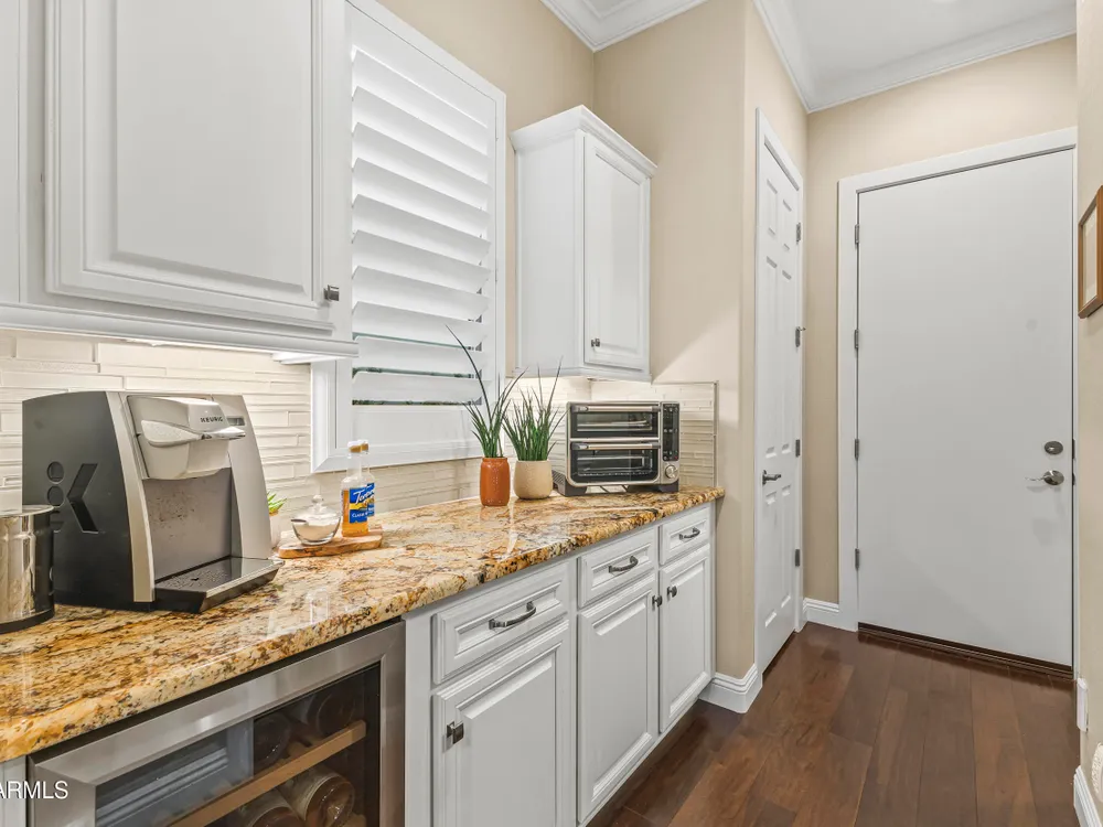 Discover your desert oasis on Lakes Hole #5 of the Troon Copper Canyon Golf Course. This 2,538 sq ft Endeavor on a quiet residential street shines with fresh 2024 upgrades. New interior paint, two-tone accents, 5'' baseboards, central vacuum, Delta touch-faucet and more. Elegant finishes include crown molding, coffered ceilings, hardwood plank flooring, plantation shutters, and an open concept kitchen with granite, butler pantry, wine fridge, and upgraded KitchenAid appliances. Outdoors, a travertine patio with fire pit frames golf and water views. Energy efficiency abounds with owned solar, whole-house soft water, and an EXTENDED, INSULATED, TEMPERATURE CONTROLLED-2 car garage with epoxy floors, cabinets, sink, plus separate golf cart garage. This is a desert oasis of comfort and style.