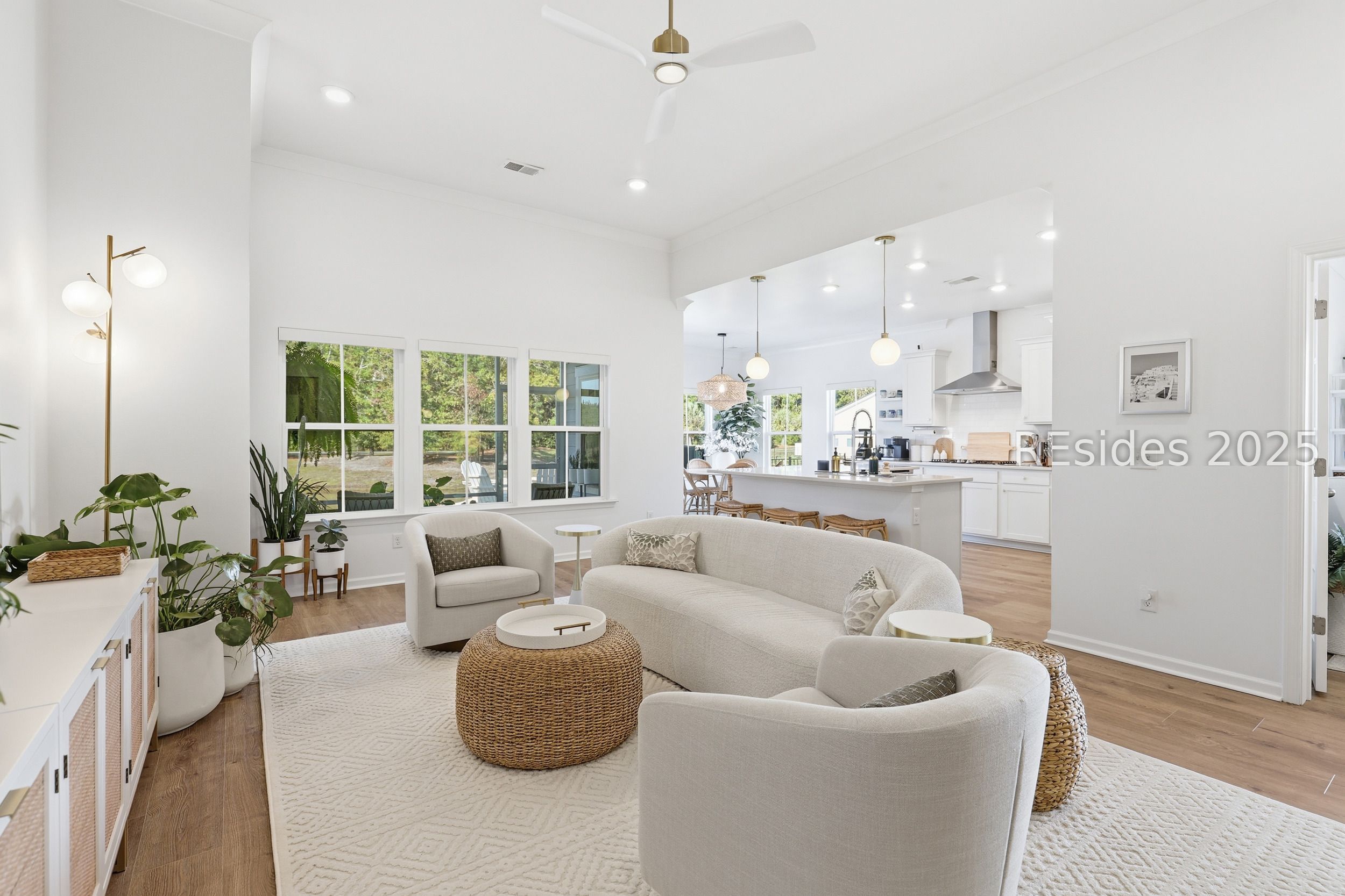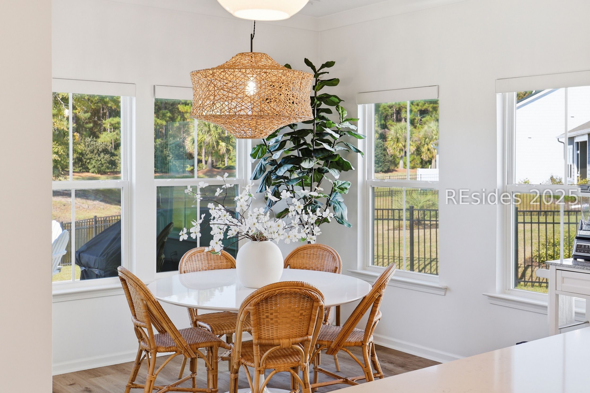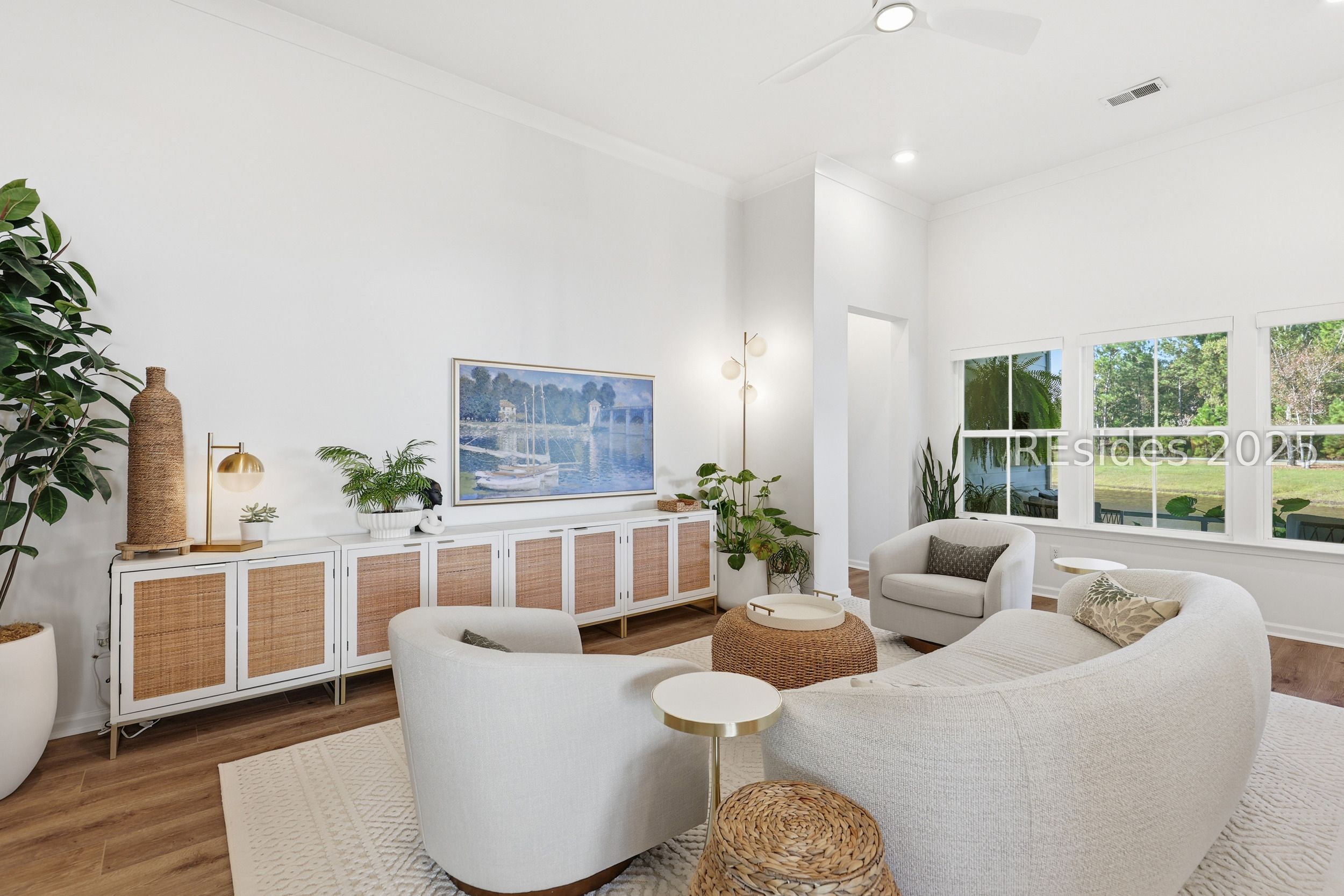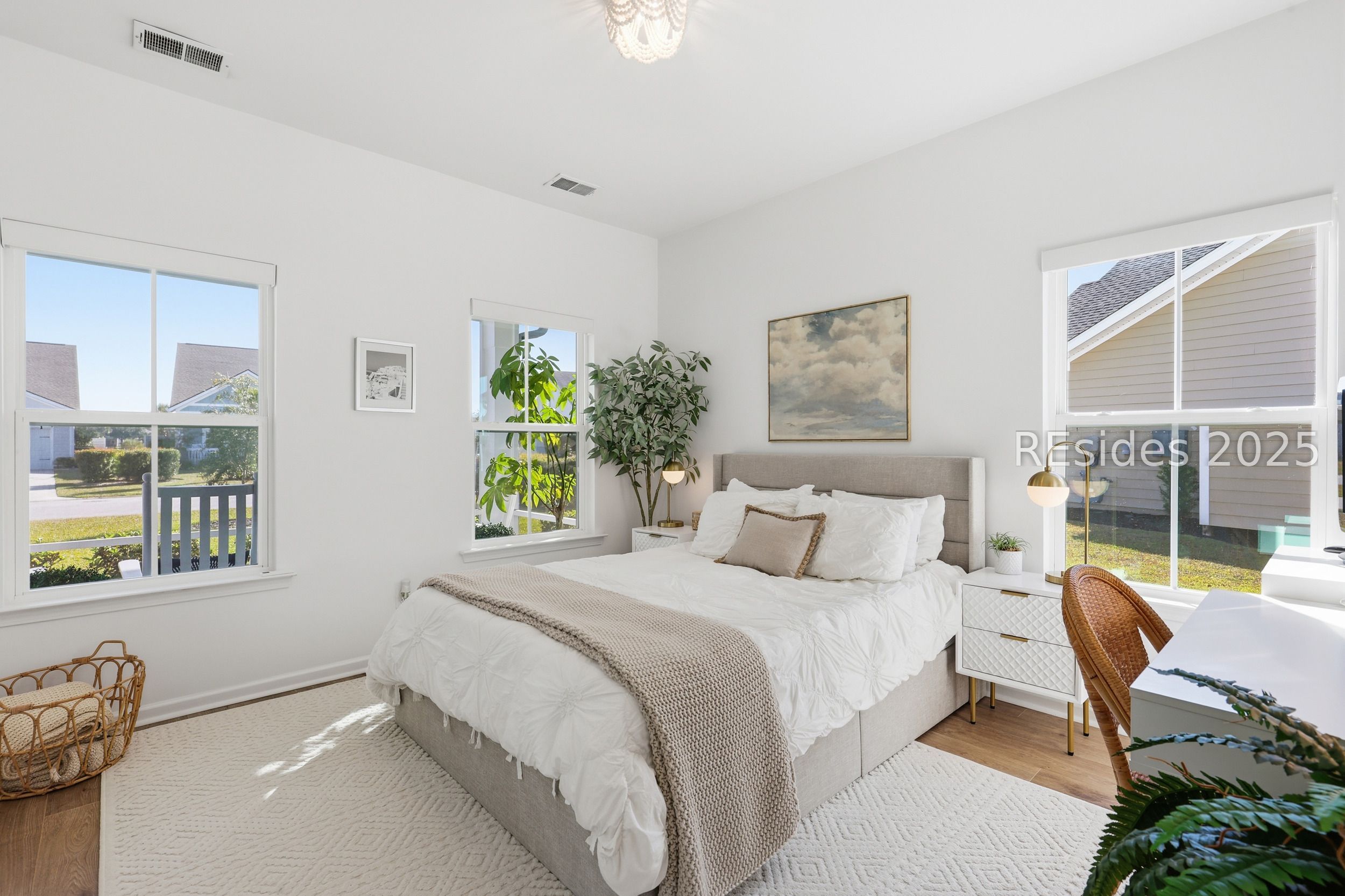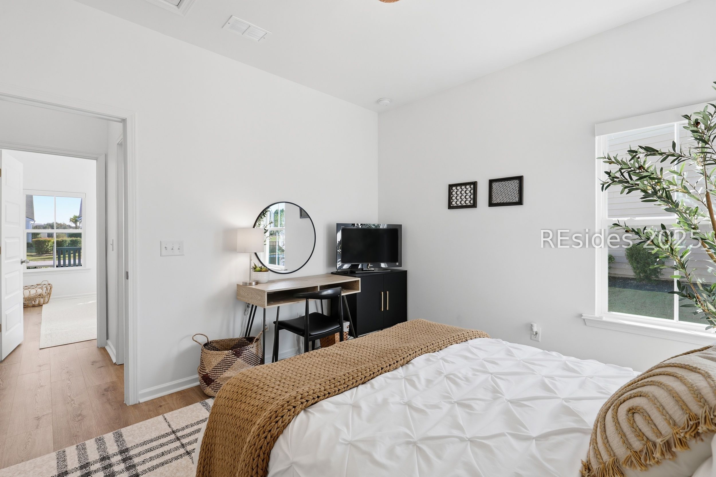 Enjoy lagoon and wooded conservation-easement views! Embrace the relaxed, Lowcountry lifestyle in this pristine 3 BR/2Bath Hilton Head Lakes home with Hardiplank siding, built in 2023 and better than new. Perfectly positioned on a quiet, gated cul-de-sac stree, this home offers an open layout filled with thoughtful upgrades - tall ceilings, crown moulding, gourmet kitchen, and a cozy office or den. You'll love the warm pine flooring, custom lighting, motorized blinds throughout and epoxy garage floors. High tech features include a Ring doorbell and Ring Security, front door smart lock, MyQ garage door opener and exterior garage light timer. Both front and back screened lanais make it easy to enjoy the Lowcountry breeze while sipping your morning coffee. The Public Golf Club at Hilton Head Lakes feautres a Tommy Fazio-designed 18-hole championship couse, a 36 acre practice facility, pool, fitness, social activites and a cafe. POA includes irrigation. Meticulously maintained - this one truly has it all!