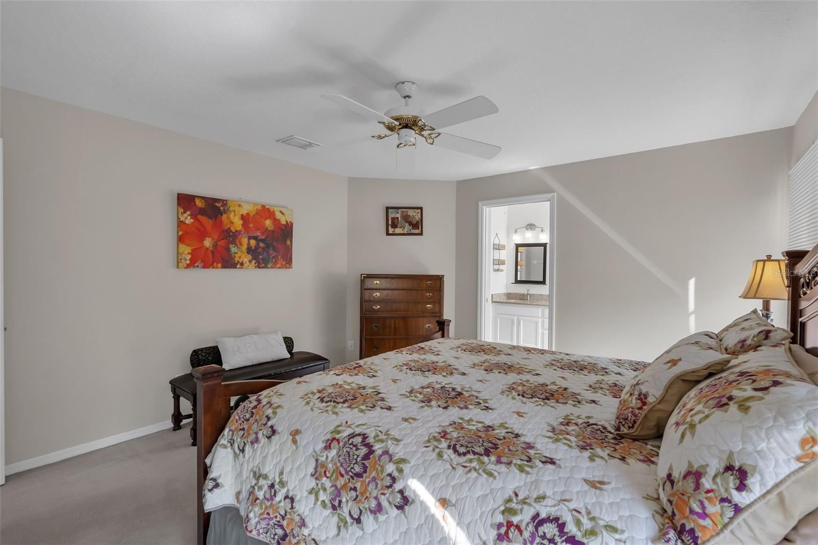 - Ceiling Fan(s), Eat-in Kitchen, Living/Dining Room, Main Level Primary, Split Bedrooms, Stone Counters, Thermostat, Walk-In Closet(s), Window Treatments