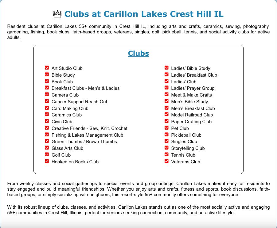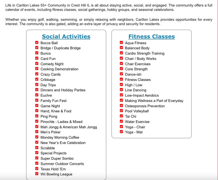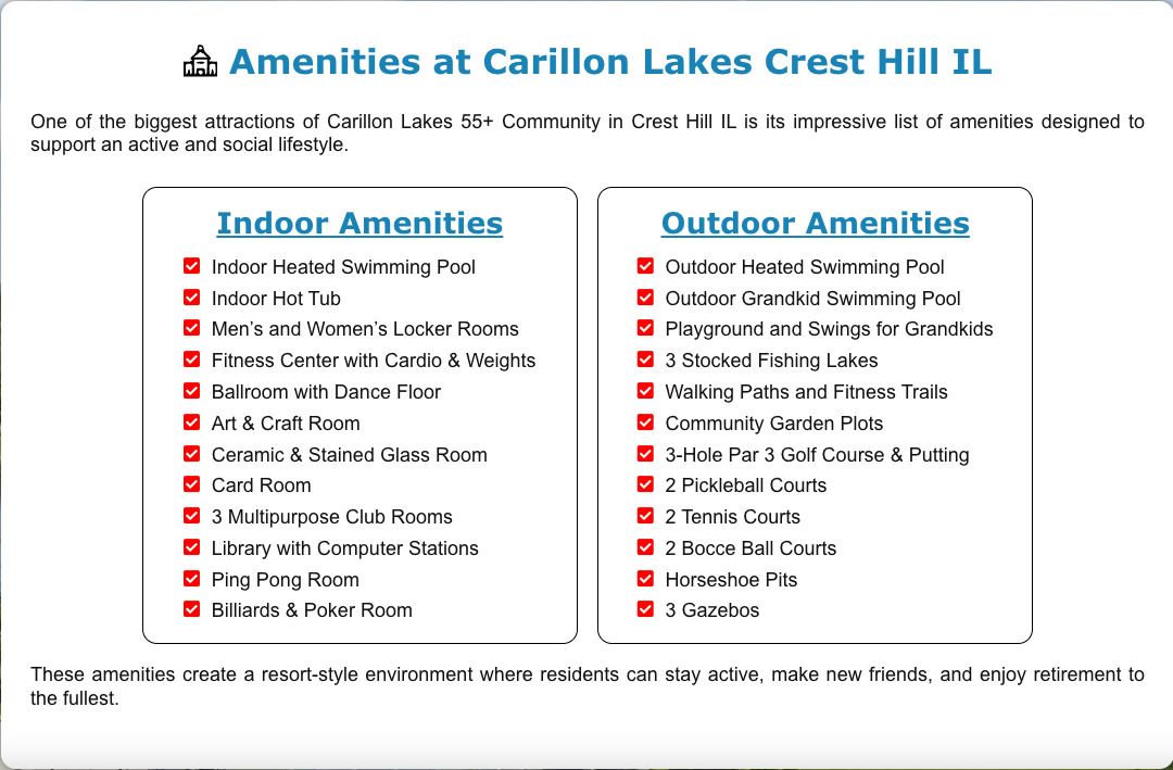 The following amenities are available to Carillon Lakes - Crest Hill, IL residents: