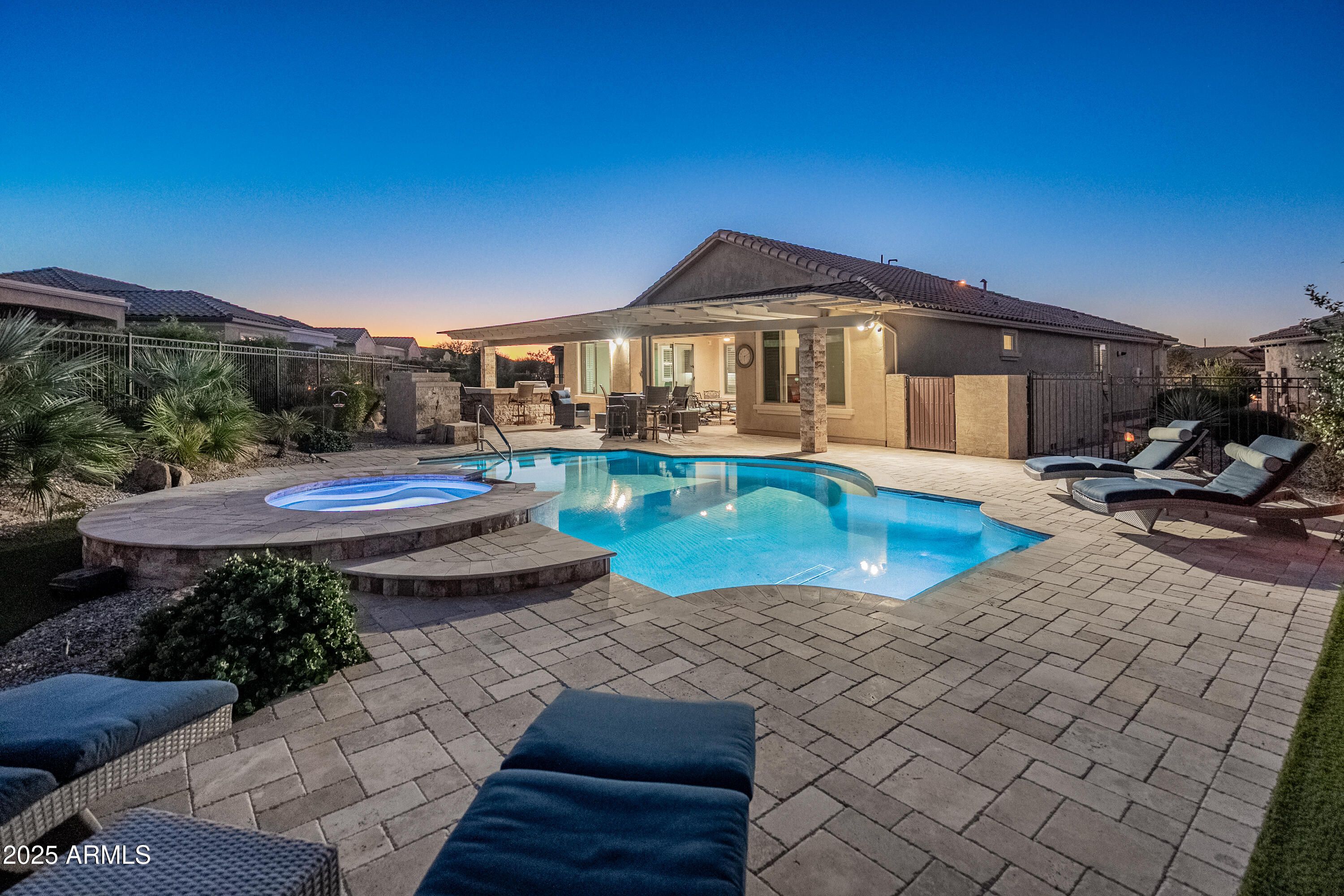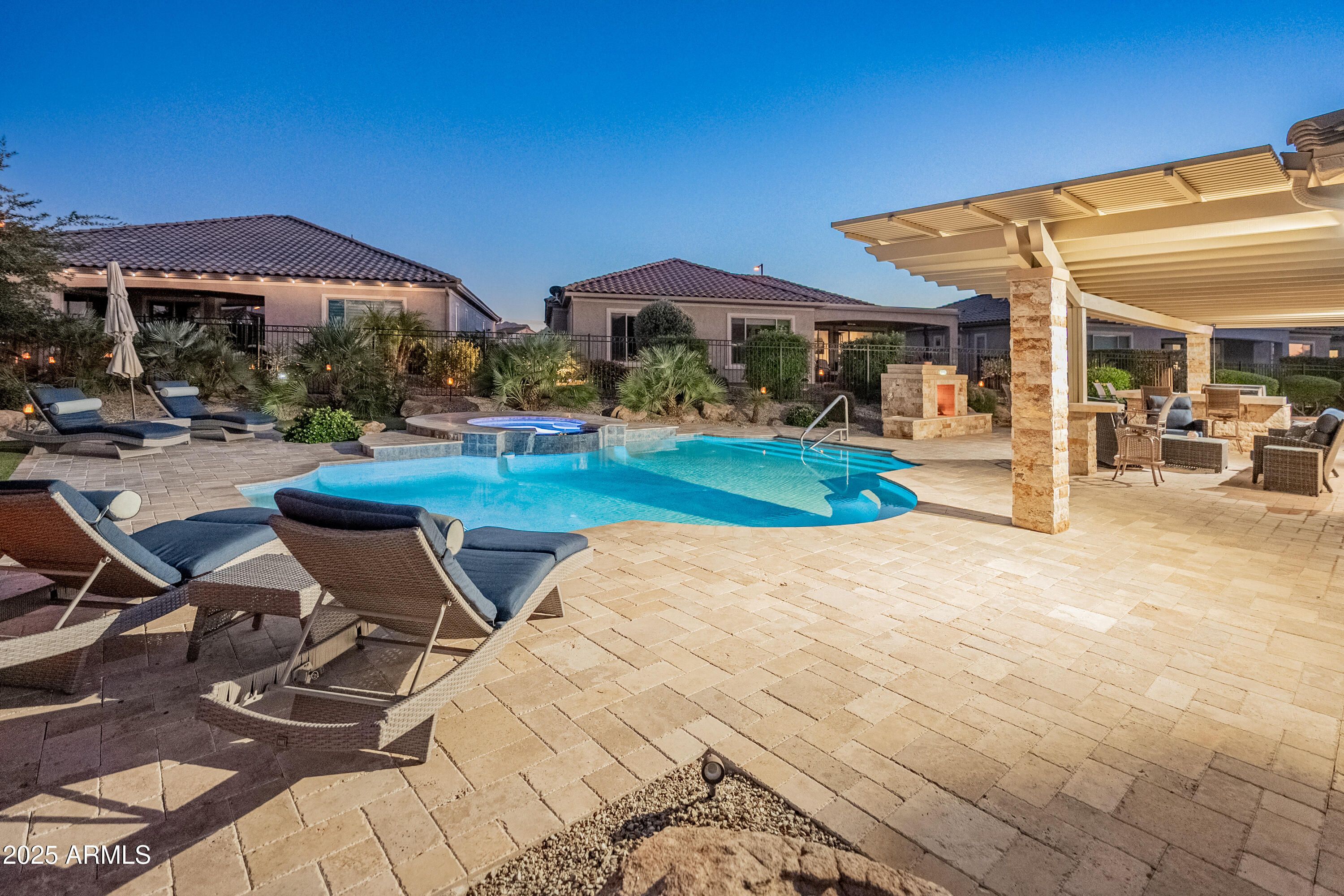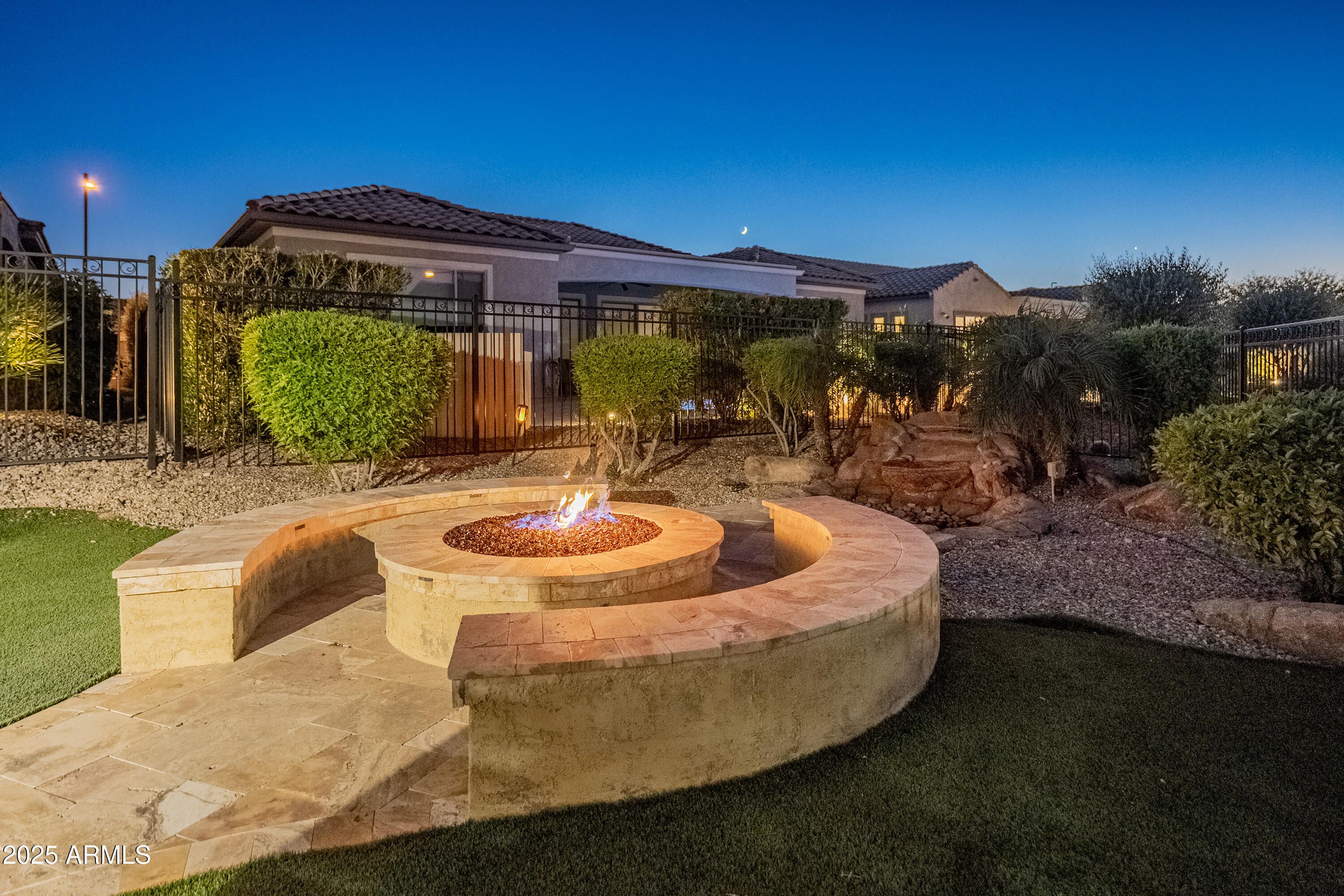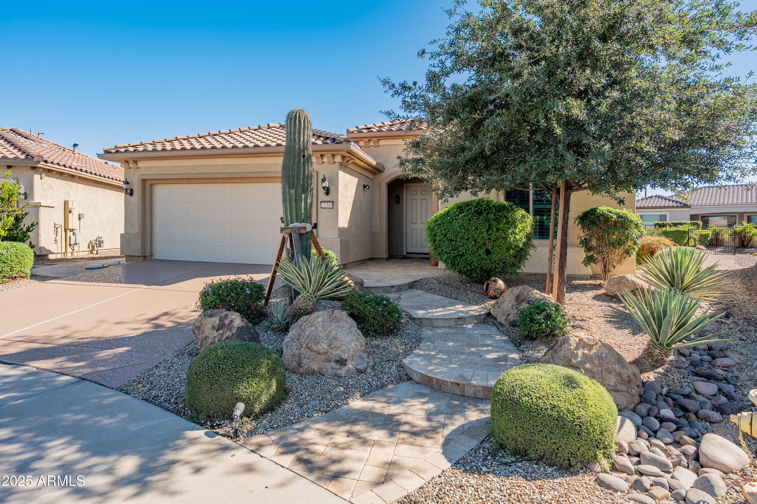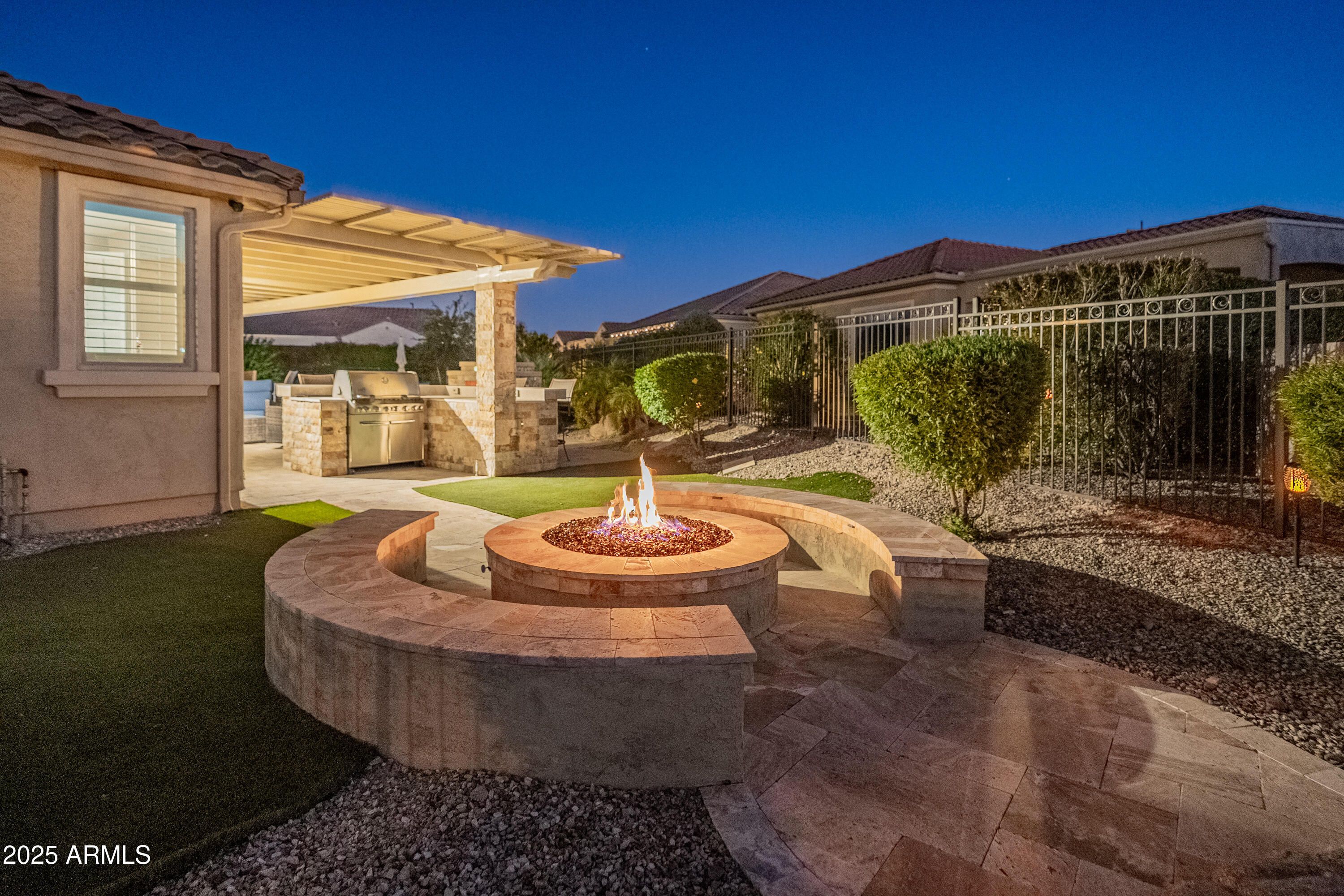 Exceptional Refuge floor plan perfectly situated on an oversized private cul-de-sac lot offering beauty, comfort & tranquility! This 3 Bedroom, 2.5 Bath home features an ensuite guest room, versatile Flex Room & a Chef's Kitchen w/ Granite Countertops, rich cabinetry & Stainless Steel appliances. Elegant tile flooring w/ marble accents & energy-efficient Owned Solar add style & savings. Step outside to a backyard that is truly an Oasis—a Heated Pool & Spa w/ soothing waterfall feature, Travertine paver decking & walkways, Built-in Grill Station, Fireplace & separate Fire-pit create distinct areas for entertaining, dining & relaxation. The Extended Pergola, lush desert landscaping, synthetic turf & ambient lighting transform evenings into pure resort living in Sun City Festival!
