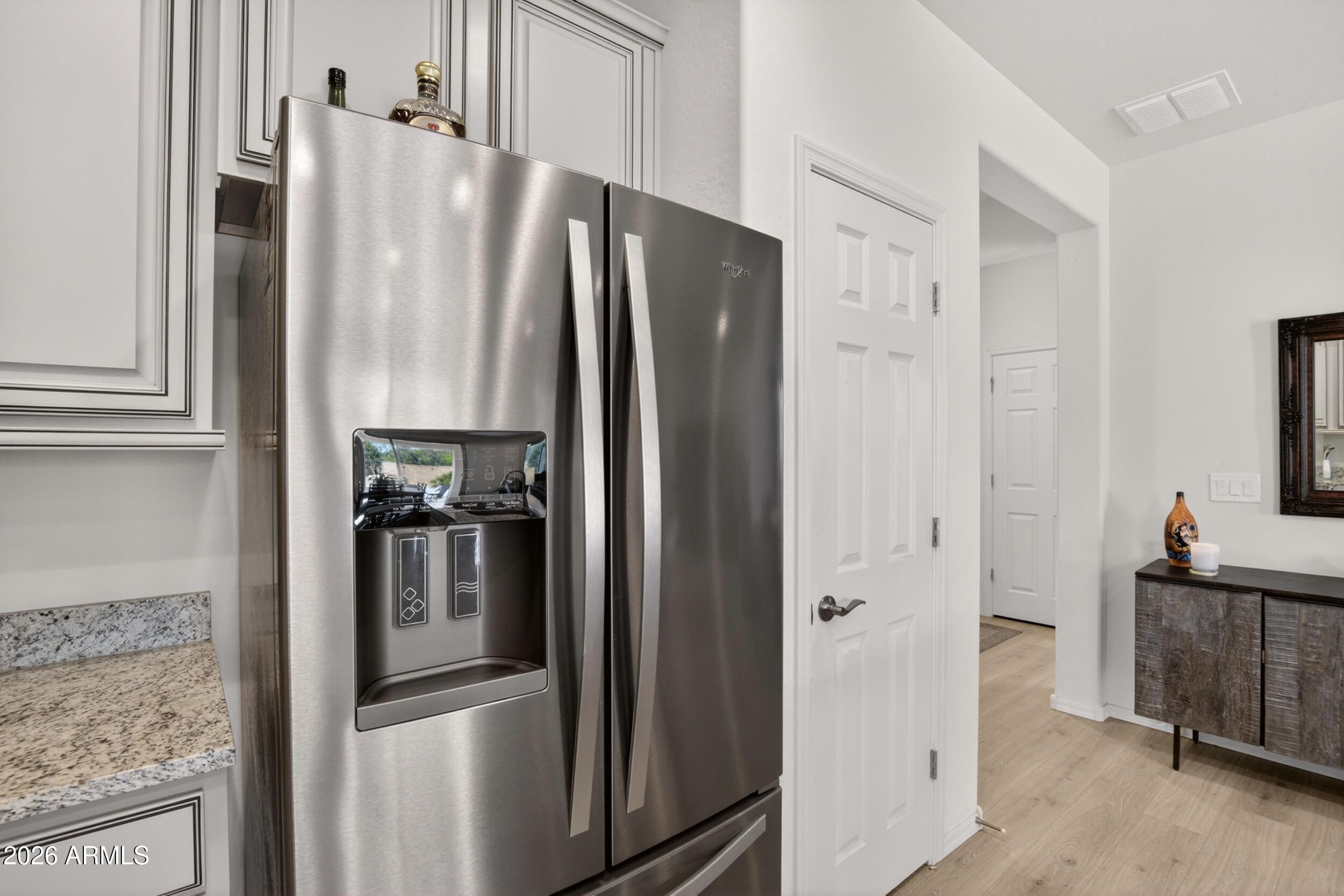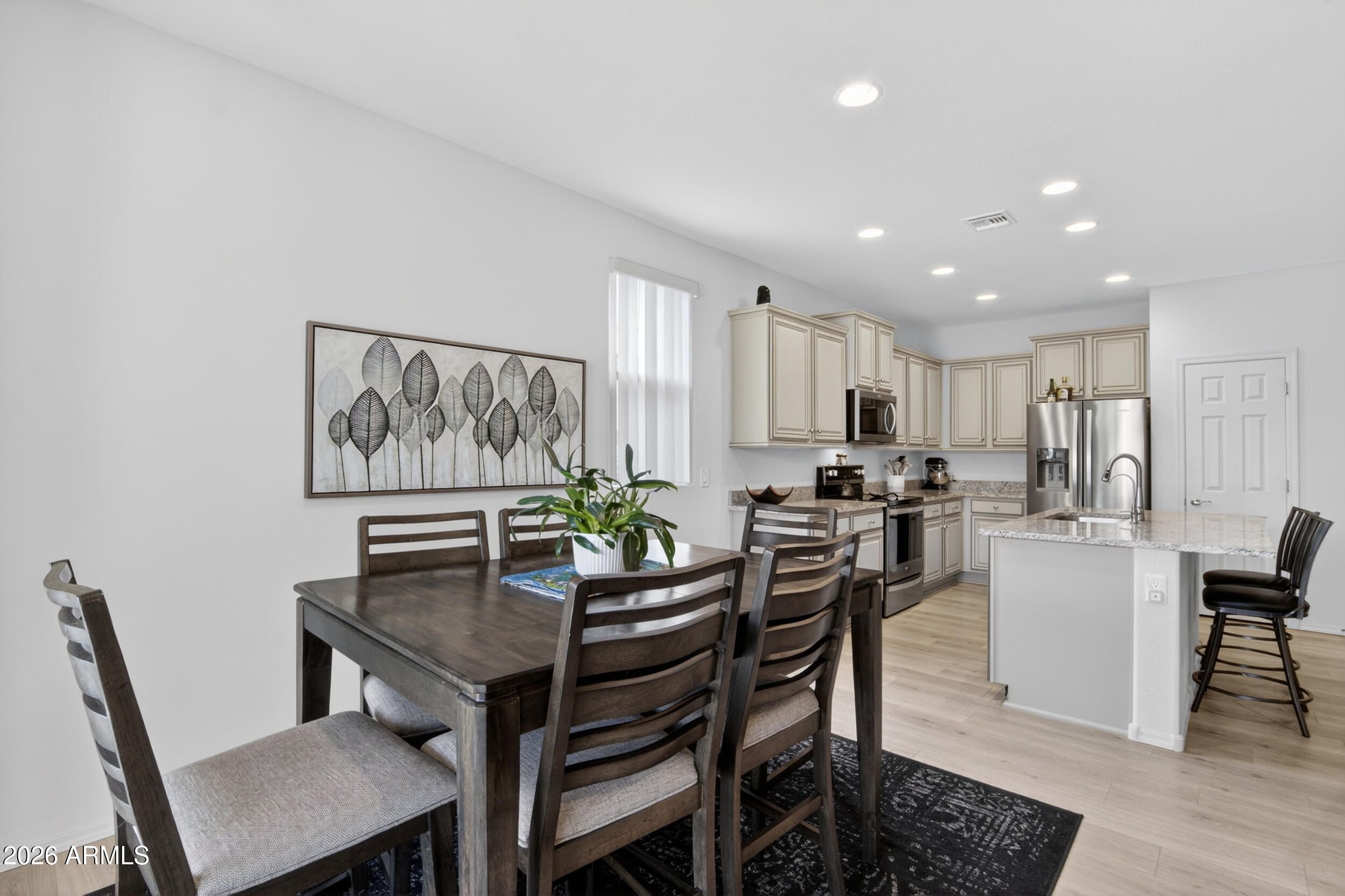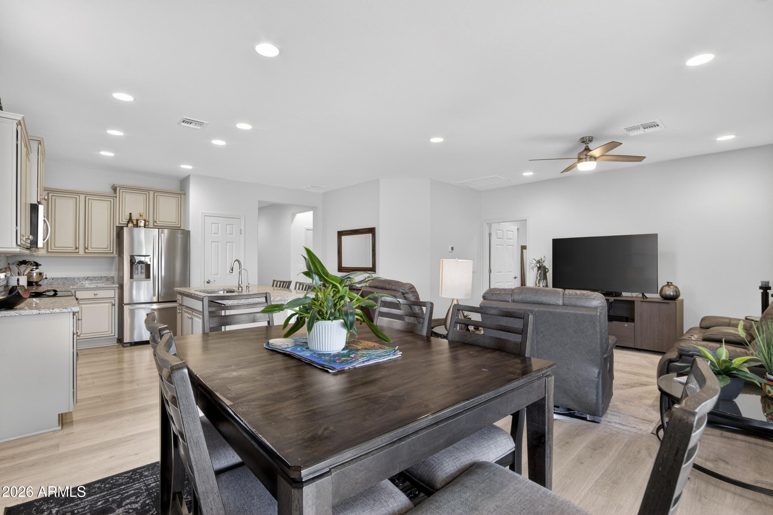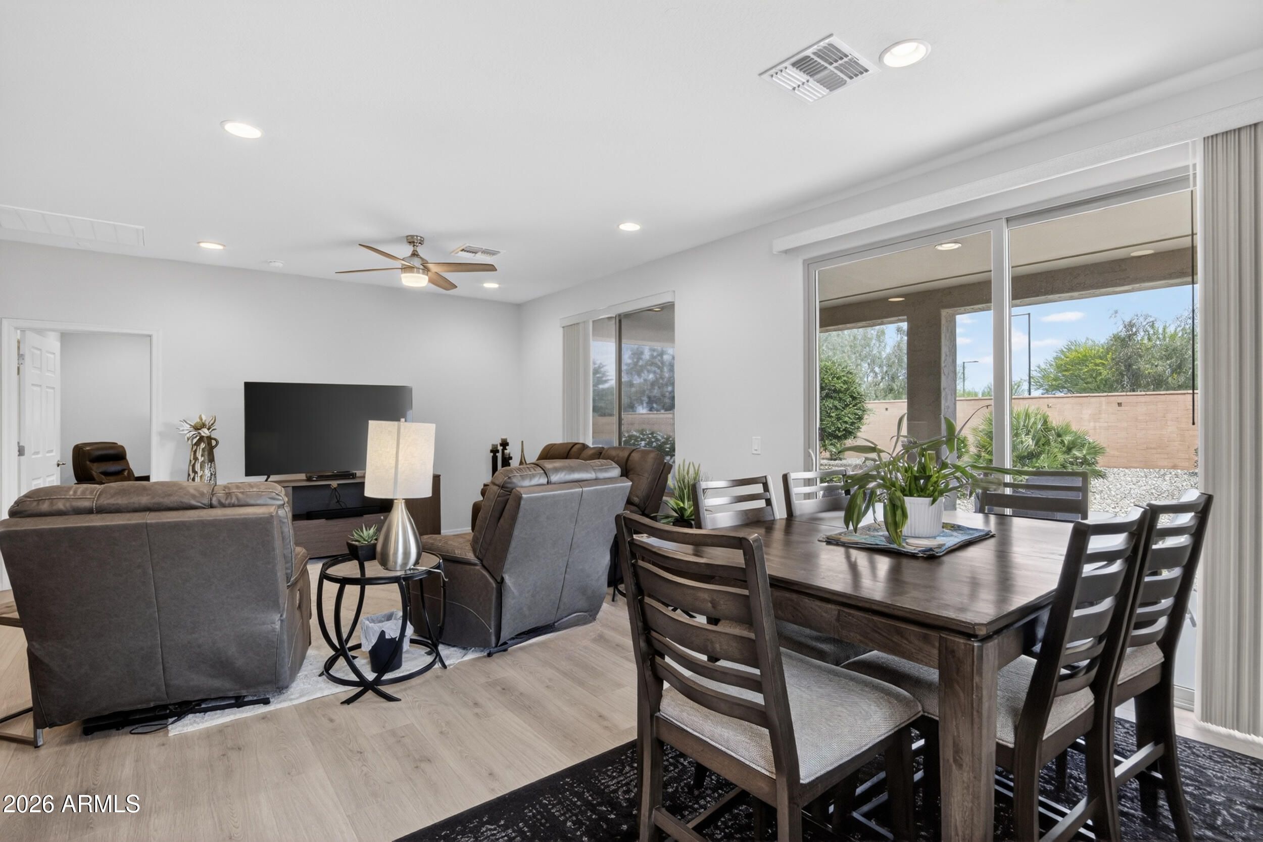 Beautifully maintained Traverse floorplan in Sun City Festival featuring a bright open layout and upgraded finishes throughout. The kitchen offers granite countertops, stainless steel appliances, upgraded cabinetry, and a large island that flows seamlessly into the dining and living areas, creating a comfortable and connected space. Split primary suite includes a spacious bedroom, dual sink vanity, and walk in closet. Additional highlights include a well sized laundry room and a 2 car garage with built in cabinets and workspace. Enjoy the extended covered patio and low maintenance desert landscaping in a private backyard designed for easy living. Located in Sun City Festival with resort style amenities including golf, pools, fitness center, and an active lifestyle. Sun City Festival is one of the Northwest Valley's premier 55+ active adult communities, designed for low maintenance living and a vibrant, social lifestyle. Residents enjoy access to two recreation centers featuring resort style pools and spas, state of the art fitness centers, group fitness studios, indoor walking track, and outdoor gathering spaces. The community offers a wide range of activities including pickleball, tennis, bocce ball, and numerous clubs, classes, and social events throughout the year. Golf enthusiasts will appreciate the 27 hole championship golf course managed by Troon Golf, offering scenic desert views and a top tier playing experience. Additional highlights include on site dining, arts and crafts studios, and hobby spaces such as a woodshop, creating opportunities to stay active, engaged, and connected. Sun City Festival is built around convenience, community, and lifestyle, offering residents the ability to enjoy an active and social environment with low maintenance living.