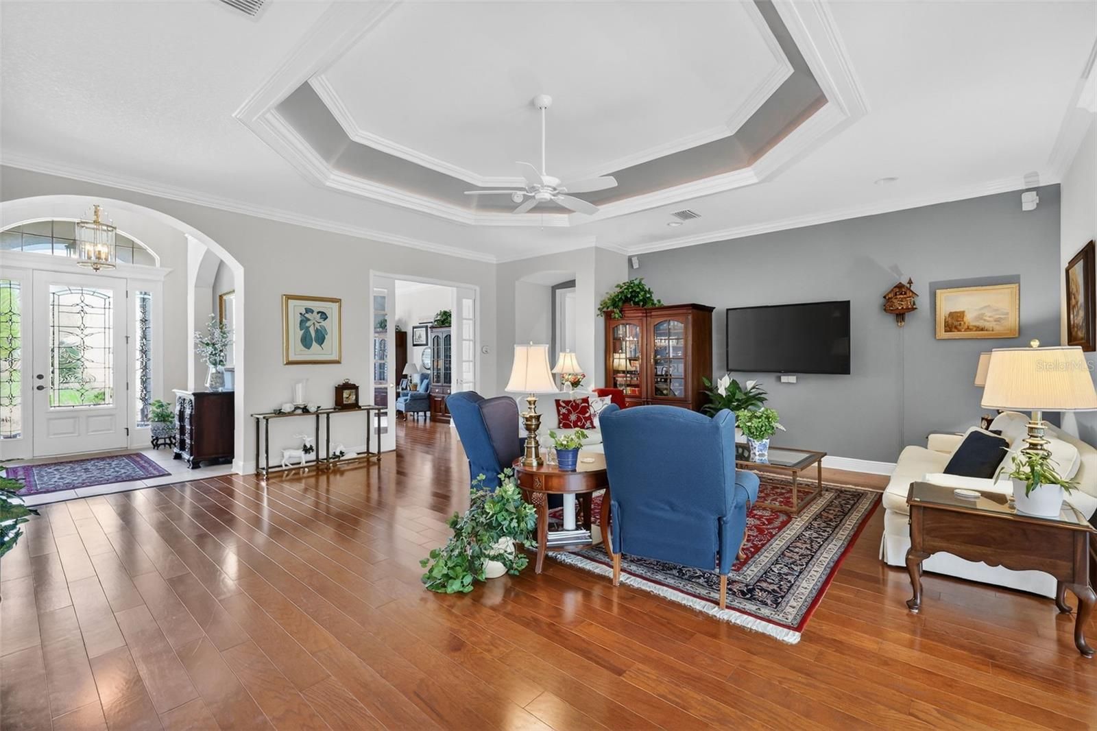 One or more photo(s) has been virtually staged. EXPERIENCE REFINED ELEGANCE in this EXQUISITE, EXPANDED 4-bedroom, 2-bath PREMIER Sanibel boasting an EXPANSIVE 36’ x 16’ FLORIDA ROOM and an OVERSIZED 868sf GARAGE and GOLF CART GARAGE. This STUNNING home sits on over 1/3-acre and offers unparalleled PRIVACY with MATURE REAR LANDSCAPING for your enjoyment in an ALL-PREMIER neighborhood in the highly sought-after Village of Pinellas! The exterior of this MAGNIFICENT home features ENHANCED, TIERED landscaping with STONED beds and a welcoming front PATIO with a seating wall that leads to a grand ARCHED ENTRY framed by a stately column. Designed for the discerning buyer, this home’s interior showcases impeccable craftsmanship, upscale finishes, and thoughtful architectural details with CUSTOM CROWN MOLDING, PLANTATION SHUTTERS, ARCHED DOORWAYS, and SOARING CEILINGS throughout! The ELEGANT chef’s kitchen features STAGGERED CHERRY cabinetry with ROLL-OUTS and GLASS accents, GRANITE countertops and backsplash, built-in DOUBLE PANTRY, STAINLESS appliances, DOUBLE wall oven and cooktop, UNDER- and OVER-counter lighting, large CENTER ISLAND, EAT-IN breakfast bar, and an adjoining dinette with a BAY WINDOW. A formal dining room, near the foyer, features WAINSCOTING, double windows, & an opulent chandelier. Entertain effortlessly in the ELEGANT living area showcasing GORGEOUS WOOD floors, a FABULOUS TRIPLE CROWN TRAY ceiling with ambient uplighting, Bose surround sound system, and FOUR-PANEL POCKET sliding glass doors that seamlessly connect to the EXPANSIVE Florida room with MINI-SPLIT. This INCREDIBLE space adds approximately 576sf of additional living area and features raised flush TILE PLANK flooring, an entertainment center with built-in ALABASTER cabinetry, GRANITE countertops, wine cooler, a PLETHORA of windows with convenient solar shades, and surrounding mature PRIVACY landscaping. A side French door leads to a rear PATIO providing the perfect spot for grilling or relaxing in the beautiful Florida weather! The LUXURIOUS primary suite is a true retreat, featuring rich WOOD flooring, a triple crown tray ceiling with ambient uplighting, and TWO CUSTOM walk-in closets. The spa-inspired ensuite bath offers DUAL wood vanities with granite, a Roman-style walk-in TILED shower, a large LINEN closet, and a private water closet. Two additional bedrooms are tucked behind a POCKET door for added privacy, each with tile flooring, high ceilings, and custom built-in closets. The second bath is beautifully appointed with a CHERRY vanity, GRANITE countertop, and a TILE walk-in shower. A versatile fourth bedroom, office, or den boasts a DOUBLE French door entry, bay window, WOOD flooring, and a custom built-in closet. The SPACIOUS laundry room boasts CHERRY cabinetry, shelving, and a BUILT-IN utility sink with GRANITE top. Completing the package is an OVERSIZED 28’ x 31’ 3-CAR + GOLF CART GARAGE with EPOXIED floors, built-in shelving and cabinetry, and attic access. The Village of Pinellas is IDEALLY LOCATED close to BOTH Brownwood Paddock Square and Lake Sumter Landing with live nightly entertainment; Evans Prairie and Bonifay Country Clubs and Championship Golf Courses; Eisenhower, SeaBreeze, and Colony Regional Recreation Centers; additional neighborhood swimming pools, pickleball, etc; and CR 466A and SR 44 with abundant shopping, restaurants, banks, medical, and more! PLEASE WATCH OUR WALK THROUGH VIDEO of this EXCEPTIONAL PREMIER HOME and CALL TODAY to schedule your private showing or virtual tour!