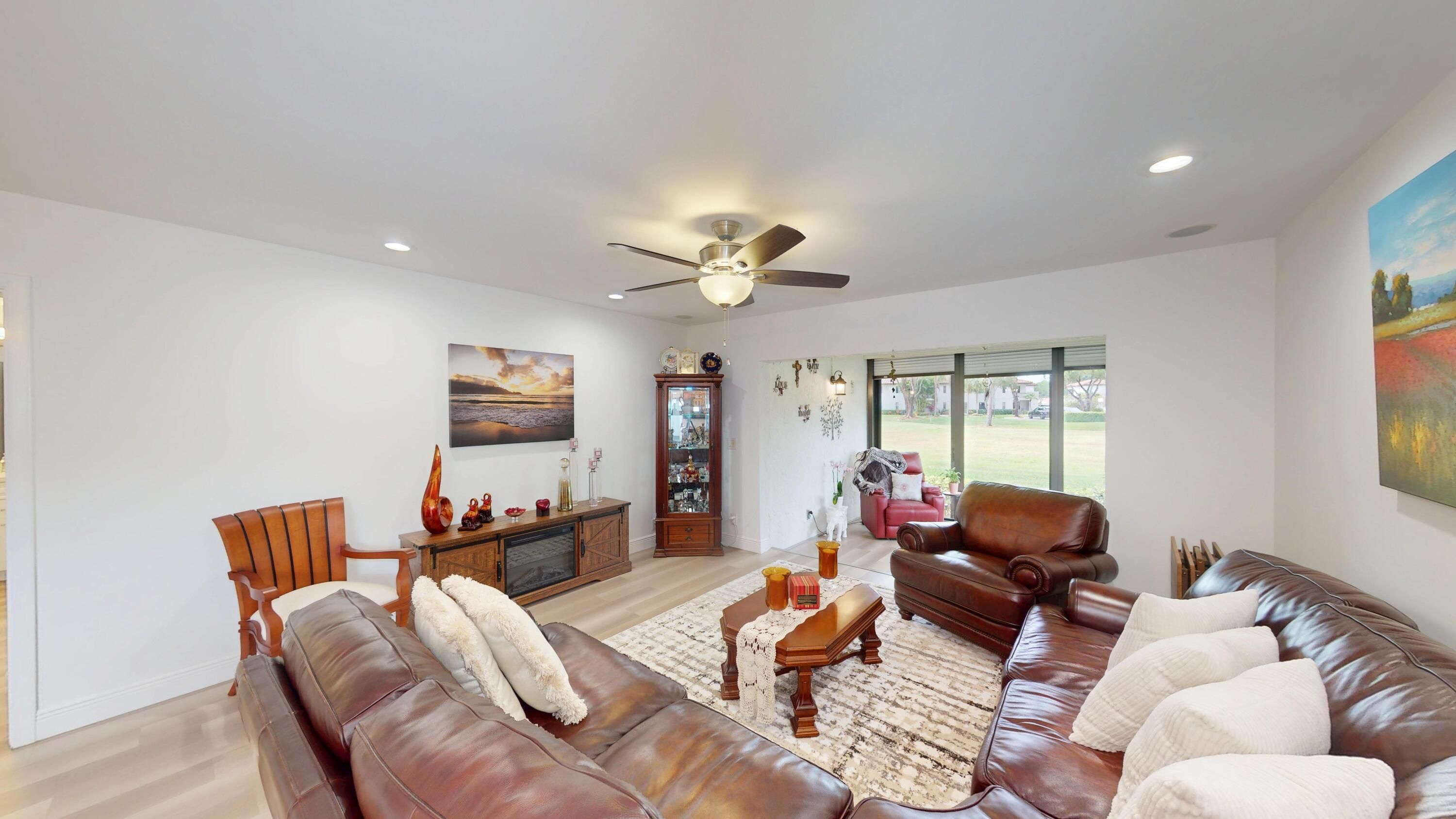 Welcome to this beautifully renovated corner unit, nestled in the highly sought-after Cypress section of Boca Lago. This exceptional home features a spacious, extended living area with a stunning view of the lush golf course, providing a serene and tranquil atmosphere.Step inside and be greeted by a brand-new kitchen, thoughtfully designed with white shaker cabinets, gleaming white quartz countertops, and stainless steel appliances. The kitchen also boasts an under-mount stainless steel sink and a French door refrigerator with an ice maker, perfect for entertaining. Throughout the home, you'll find gorgeous blonde laminate floors that exude warmth & sophistication.The updated bathrooms are equally impressive, featuring quartz countertops, new vanities, and trendy walk-in showers