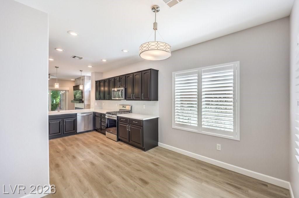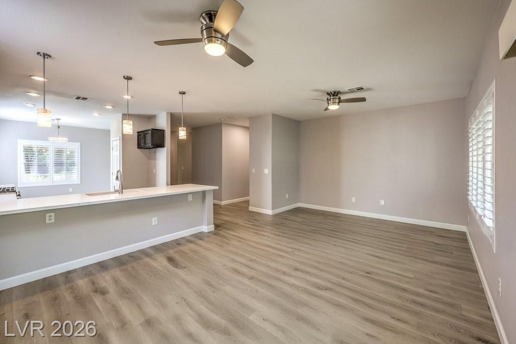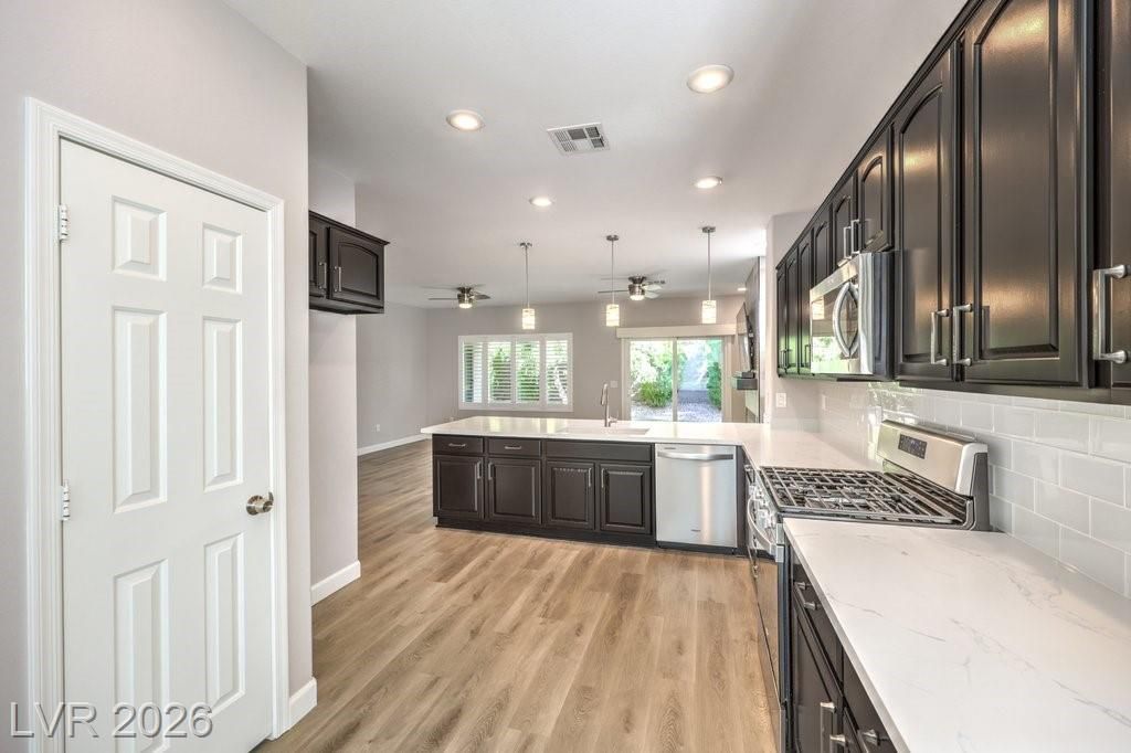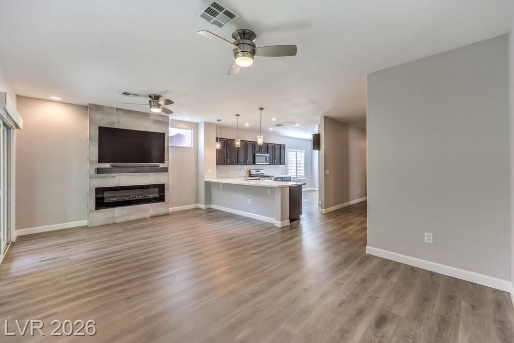 Step into modern luxury with this beautifully remodeled Delaware model, perfectly situated in the premier Sun City Anthem 55+ community. Boasting a contemporary flair with 9-foot ceilings, the interior features brand new carpet, waterproof plank flooring, two-tone paint, new lighting & fans, and dual tilt shutters. Dream kitchen includes custom quartz countertops and all-new stainless-steel appliances. Entertain in style by the sleek electric fireplace with mantle and designer tile accent wall, complete with a TV and soundbar. Both bathrooms are fully upgraded with sleek rectangle-tile shower enclosures, while the primary suite offers a spa-like, two-person jetted tub. Smart home features include an integrated home theater hub, smart thermostat, and EV-ready garage. The exterior is a private oasis, featuring new paint, 6-foot animal security fence, designer artificial turf, 11 shade trees, and a covered patio with privacy shade panels, all just steps from world-class club amenities.