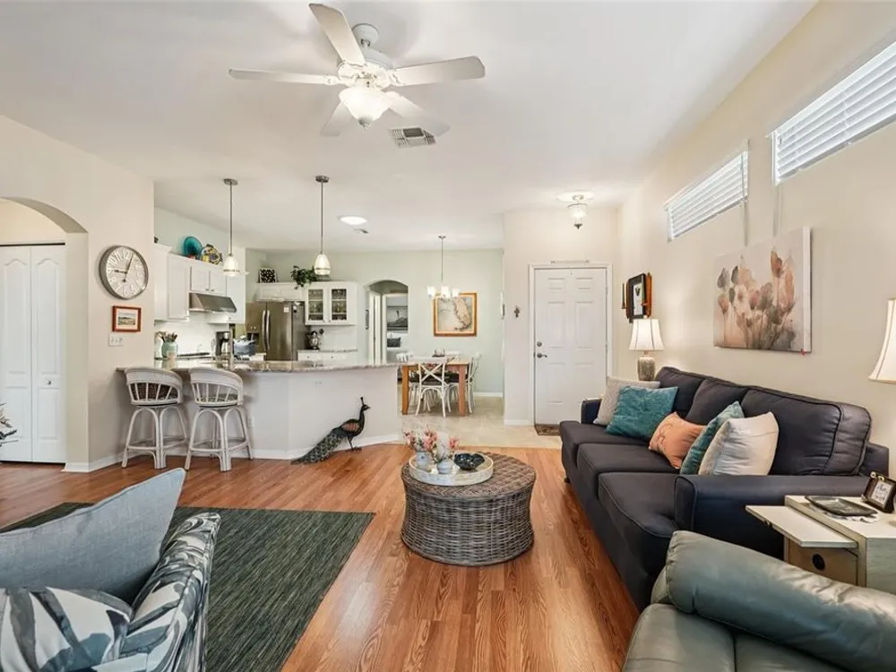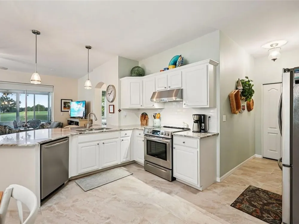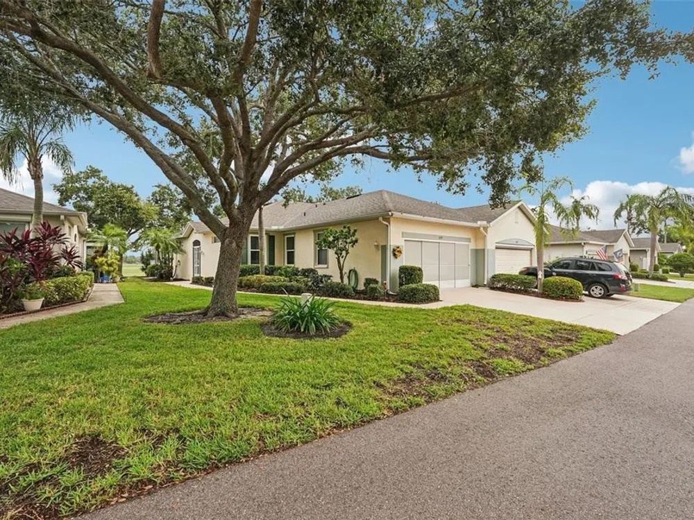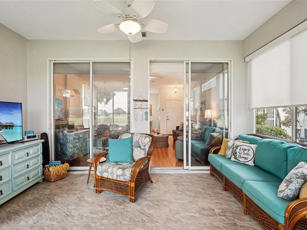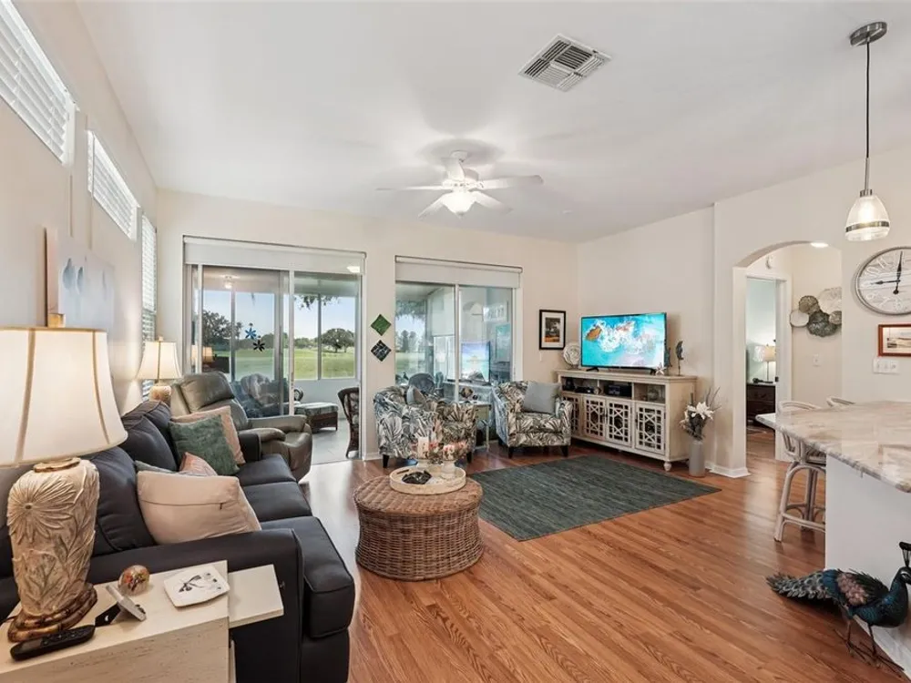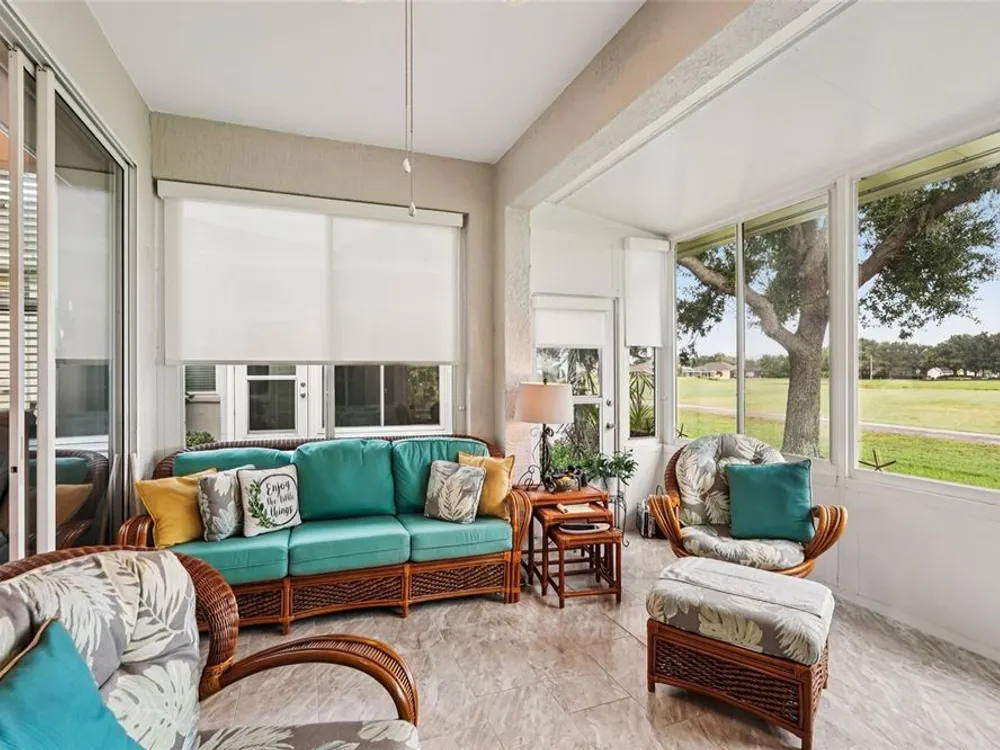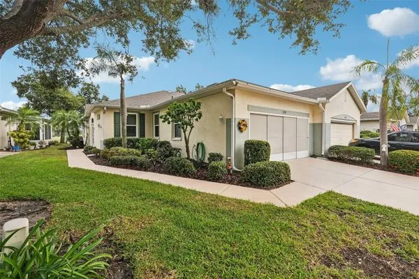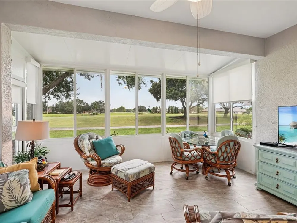 Step into style and comfort in this fully furnished 3-bedroom, 2-bath condo with a 2-car garage, located in the desirable Kings Point community! This spacious home features a side screened-in entrance for added convenience and outdoor enjoyment, along with stunning panoramic views of the golf course, visible through expansive sliding glass doors that open to a bright and airy Florida room. The open-concept kitchen, living, and dining areas flow seamlessly, creating the perfect space for entertaining or relaxing in style. The kitchen boasts stainless steel appliances, a breakfast bar, and ample cabinet space—ideal for both casual dining and hosting guests. Enjoy rich dark laminate flooring, soaring ceilings, and an abundance of natural light throughout. The spacious primary suite offers a private retreat with a beautifully updated ensuite bathroom, featuring a walk-in closet and a large walk-in shower. Both bathrooms are tastefully renovated with modern finishes. The third bedroom offers flexible use as a guest room, office, or den. Additional conveniences include a full laundry room/mudroom area with direct garage access and new windows less than 2 years old. You’ll love the gated community of Kings Point, which has amazing facilities, pools, clubs and events just waiting for you to enjoy. Located between Sarasota and Tampa, this home is perfectly positioned for a convenient ride to airports, great shopping, dining, and professional entertainment. With easy access to award-winning, sandy beaches, you’ll experience the best of all worlds—without the stress of big city life. Leave the hustle behind and embrace a new chapter in Sun City Center, Florida, the state's top-ranked and most affordable 55+ retirement community. Move-in ready and fully furnished — just bring your suitcase and start enjoying the Florida lifestyle!