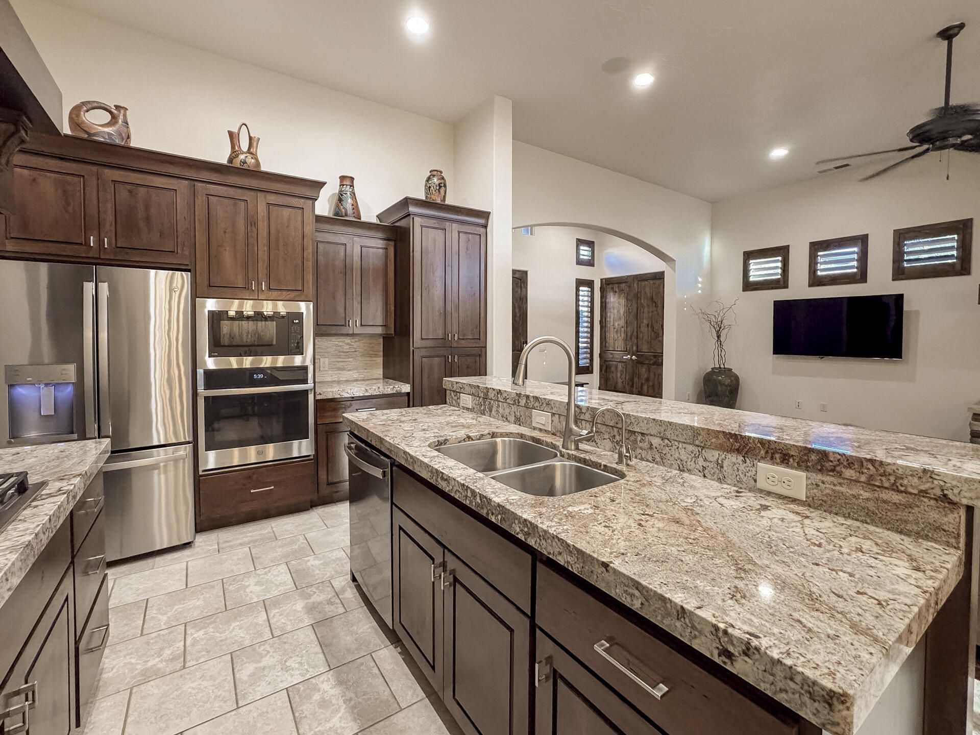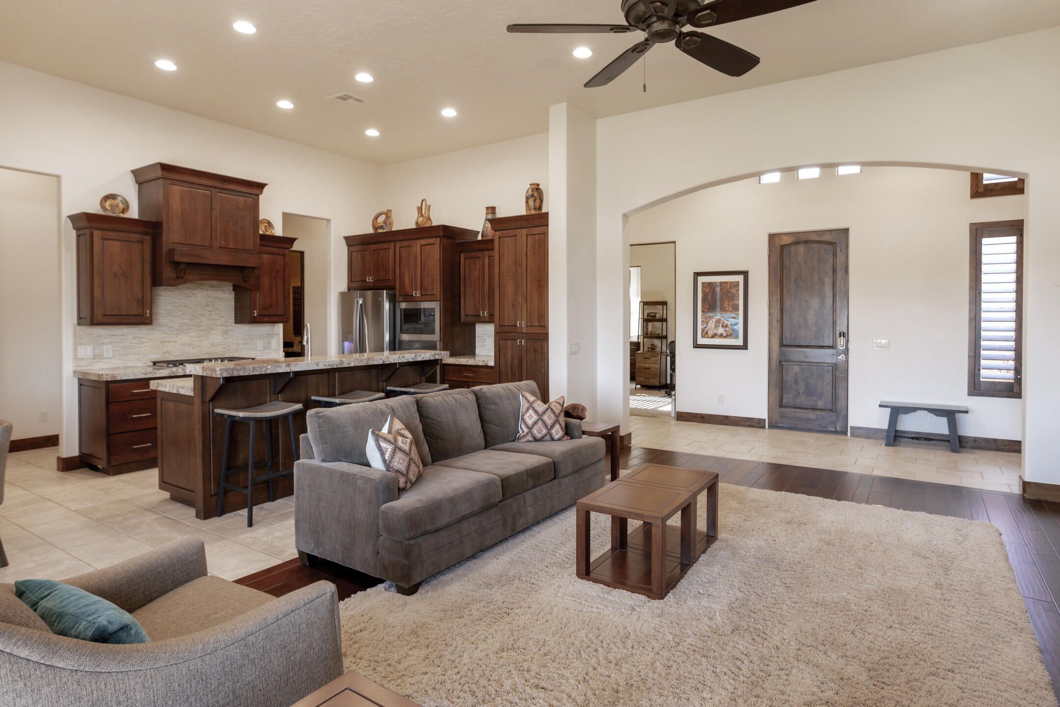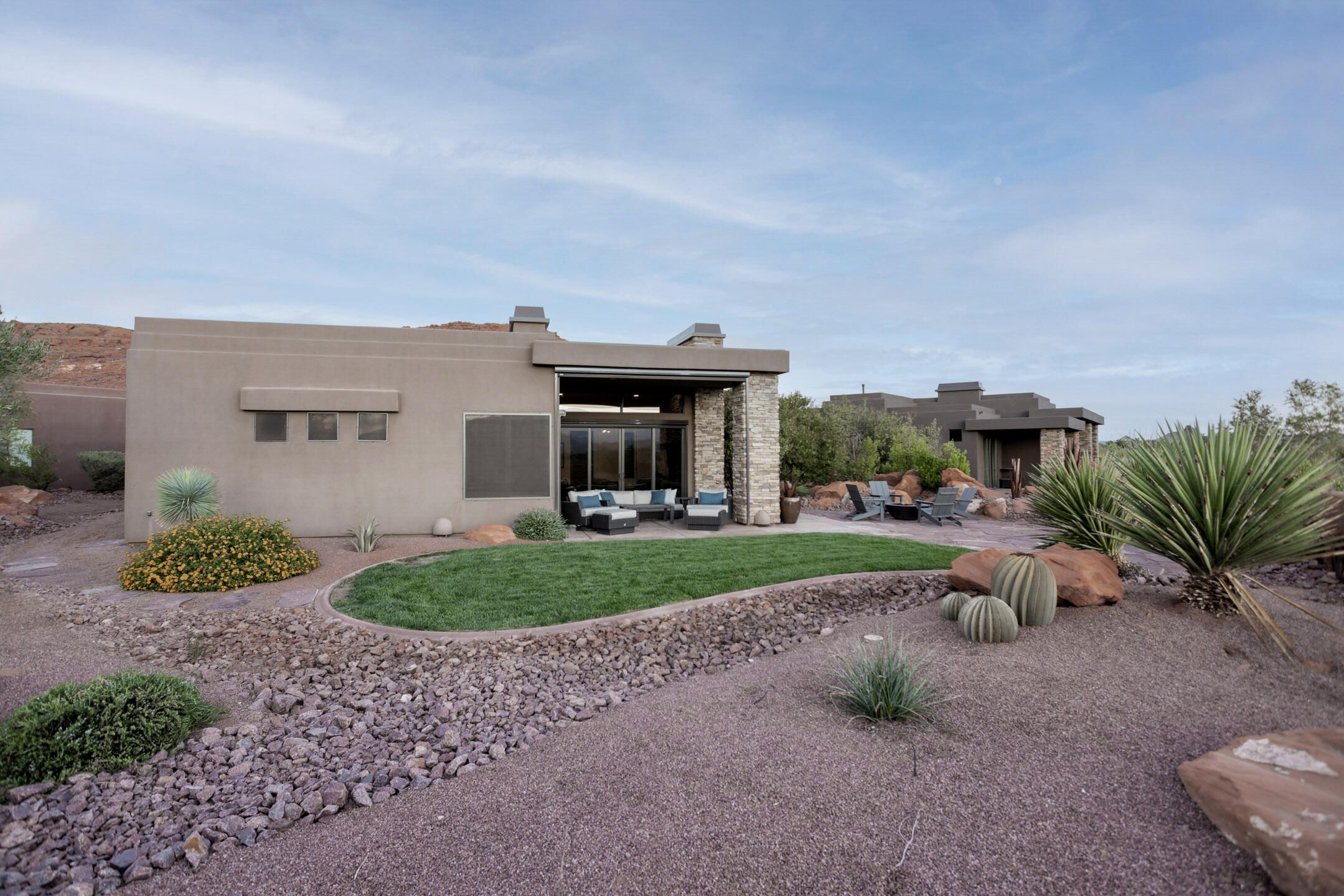 Welcome to this well-appointed home in the Escapes at Entrada, perfectly positioned to capture panoramic views of the lush golf course, glowing red mountains, and breathtaking western sunsets. The open layout blends comfort and style, offering seamless indoor/outdoor living ideal for entertaining. Modern features include motorized shades, reverse osmosis, a Control 4 lighting system, and an epoxy garage with storage. Relax on the patio surrounded by the beauty of the Southern Utah desert—watch the sky blaze with color as the sun sets over red cliffs, unwind by the fire pit, or enjoy peaceful mornings in the private courtyard with the casita nearby and Entrada's premier amenities just moments away. Furniture is negotiable with some exclusions.