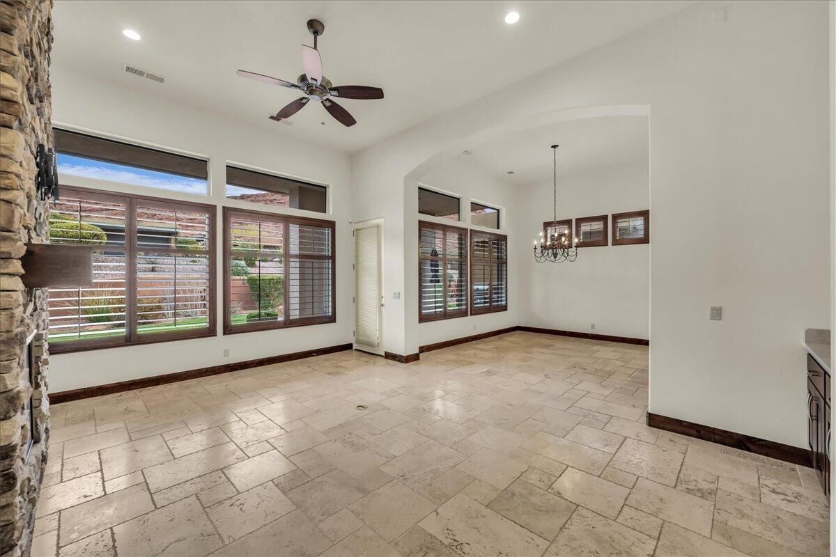 Set within one of Southern Utah's most prestigious gated golf course communities, Entrada at Snow Canyon. Surrounded by dramatic red rock landscapes and sweeping mountain views, the home blends timeless Southwestern architecture with elegant modern finishes. The open concept design is ideal for both everyday comfort and entertaining, featuring soaring ceilings, custom cabinetry, stone accents and expansive windows that invite natural light. The gourmet kitchen anchors the living space with generous counter space, high end appliances and a large island. The living room features a striking stone fireplace and ample room for entertaining. Outdoor living is equally impressive with a beautifully landscaped backyard, large patio, private courtyard to relax and enjoy the desert surroundings. Enjoy world glass golfing, access to Snow Canyon State Park, Black Desert as well as resort style HOA amenities that includes clubhouse, pool, fitness center, and pickleball courts. This exceptional home offers a rare opportunity to experience luxury living, privacy and breathtaking desert surroundings in on of the Southern Utah's most desirable communities.