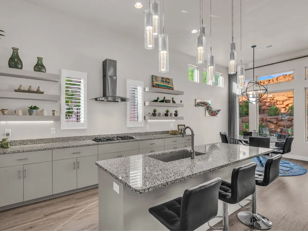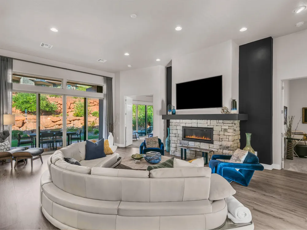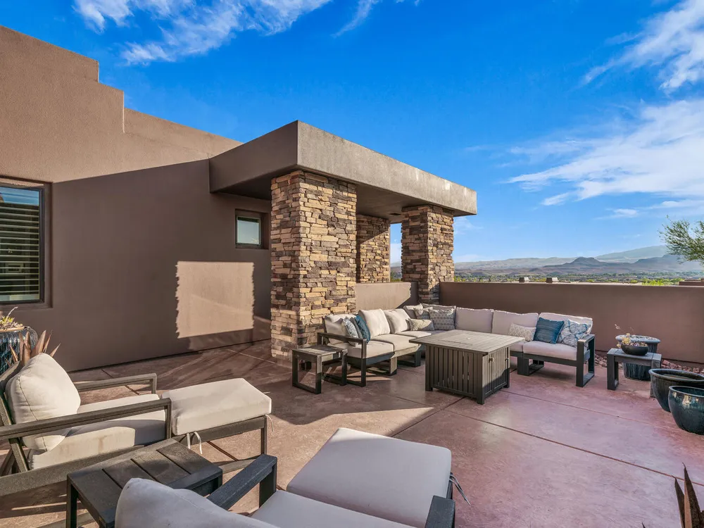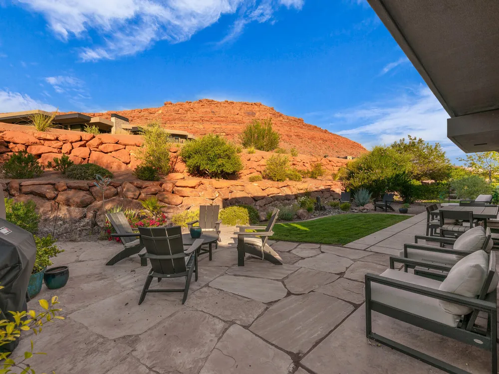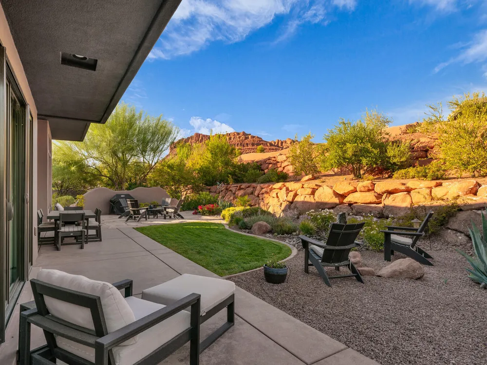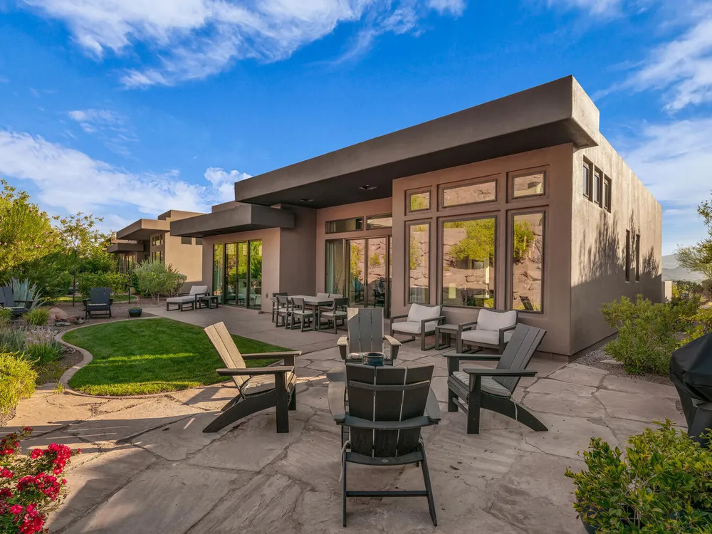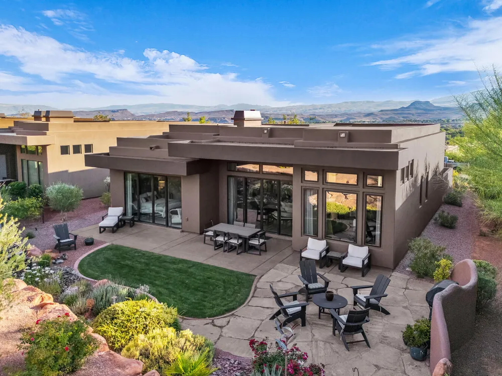 Experience sophisticated desert living in this exceptional contemporary home — the final residence constructed in this highly sought-after community. Designed to capture natural light and surrounding beauty, this immaculate property showcases clean architectural lines, open spaces, and designer finishes throughout. The private backyard is an entertainer's dream, featuring a new privacy wall, soothing water fountain, and multiple patio areas ideal for relaxation or gatherings — all set against the backdrop of breathtaking red rock views. Interior highlights include a newly added bar area, new flooring, and automated curtains and shades. The chef's kitchen boasts a new oven, new refrigerator, and gas cooktop, complemented by modern cabinetry and sleek surfaces. Additional updates include a newer water heater and freshly painted stucco exterior. Most furnishings are available for purchase separately, and Samsung Picture Frame TVs are included with the home. Third Bedroom has no closet. Seller is a licensed Realtor in Utah.