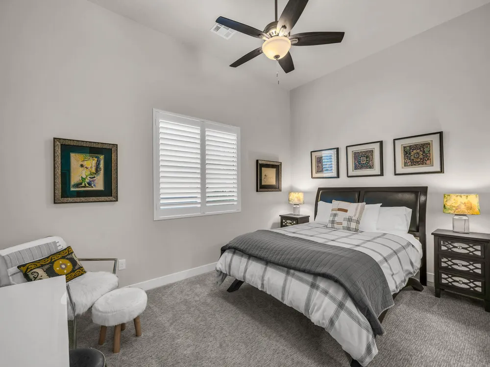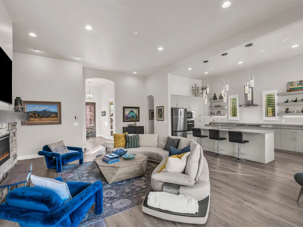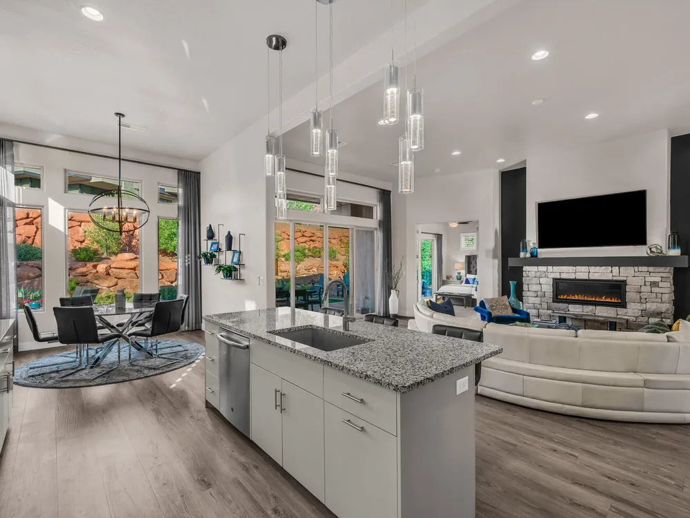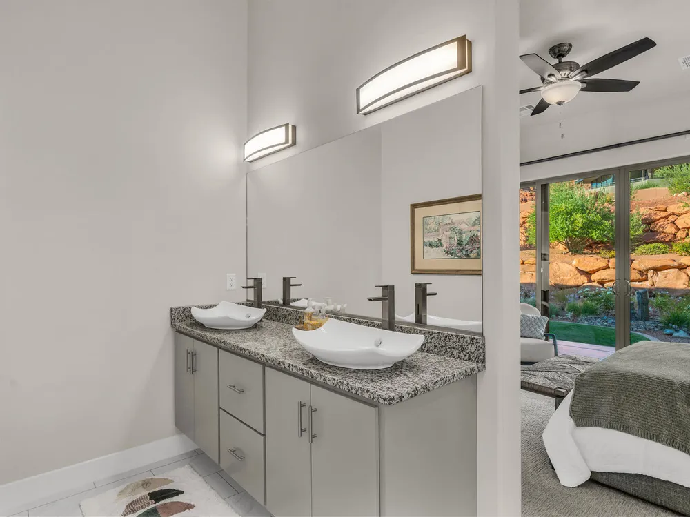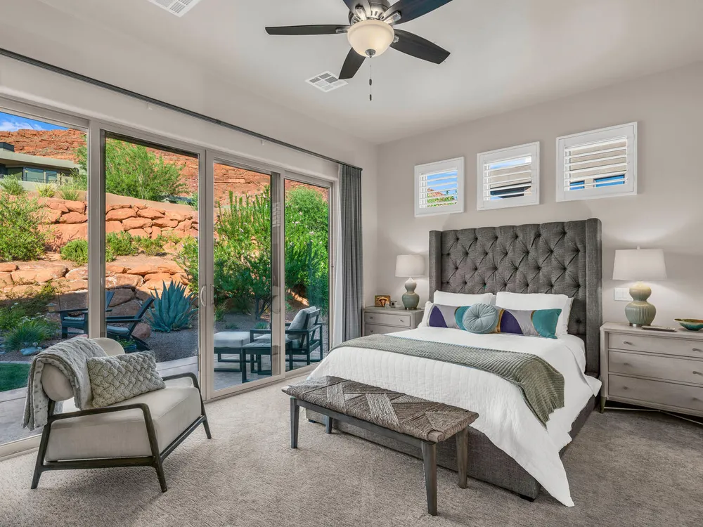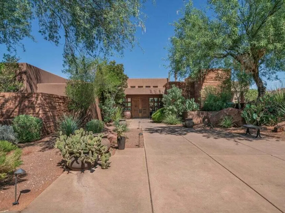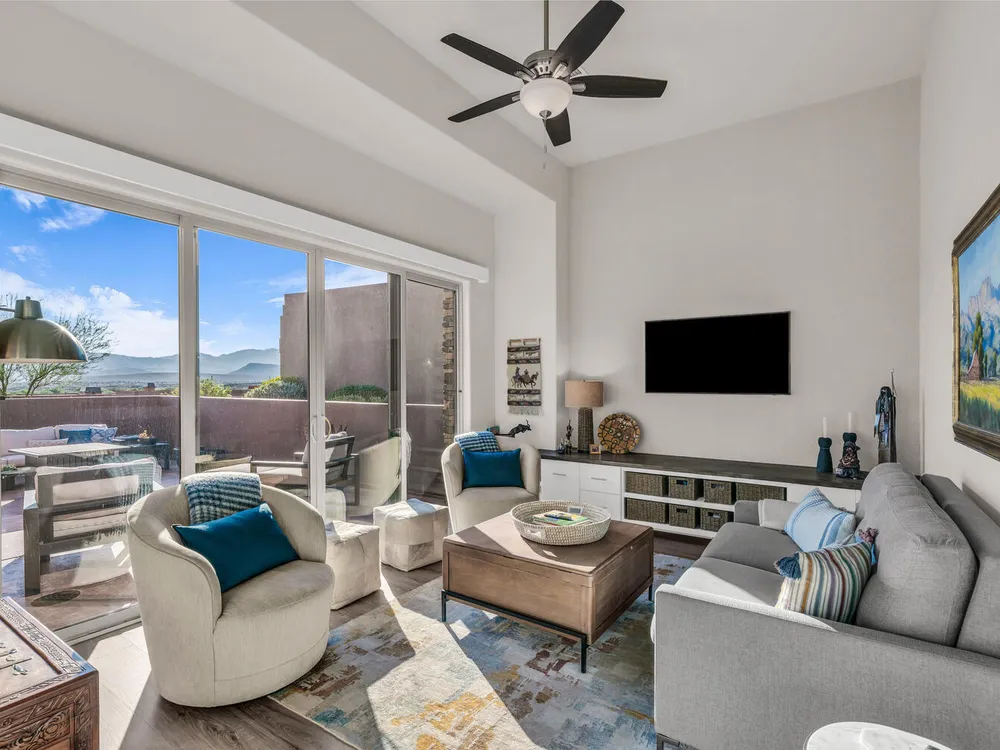 Experience sophisticated desert living in this exceptional contemporary home — the final residence constructed in this highly sought-after community. Designed to capture natural light and surrounding beauty, this immaculate property showcases clean architectural lines, open spaces, and designer finishes throughout. The private backyard is an entertainer's dream, featuring a new privacy wall, soothing water fountain, and multiple patio areas ideal for relaxation or gatherings — all set against the backdrop of breathtaking red rock views. Interior highlights include a newly added bar area, new flooring, and automated curtains and shades. The chef's kitchen boasts a new oven, new refrigerator, and gas cooktop, complemented by modern cabinetry and sleek surfaces. Additional updates include a newer water heater and freshly painted stucco exterior. Most furnishings are available for purchase separately, and Samsung Picture Frame TVs are included with the home. Third Bedroom has no closet. Seller is a licensed Realtor in Utah.