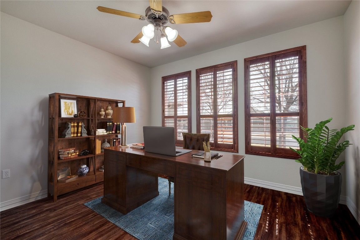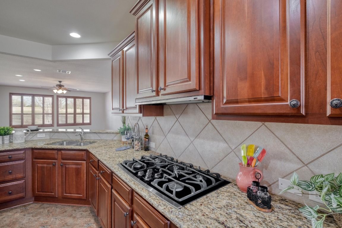 A charming Cumberland Hall floor plan home, perfectly positioned on the #9 fairway of Sun City's Cowan Creek Golf Course! Inside, you’ll find beautiful brown wooden plantation shutters throughout and an open layout that flows to a covered and extended back patio—ideal for relaxing or entertaining. Freshly painted in 2025, the home features elegant chair rail & crown molding, wood-look LVP plank flooring and granite countertops in the kitchen and bathrooms. The kitchen offers a center island, gas cooktop and recently updated built-in GE oven, microwave, and dishwasher (installed Dec 2024). A French door entry leads to a useful office space. The main bedroom boasts backyard and open area views. Two guest bedrooms (with fresh 2025 carpeting) share a convenient Jack-and-Jill bath, plus a handy powder room. Step outside to enjoy a north-facing, fully fenced backyard with an extended flagstone patio and arbor—perfect for soaking in the golf course views. All this AND, easy access to two of Sun City's four resident amenity and fitness centers!