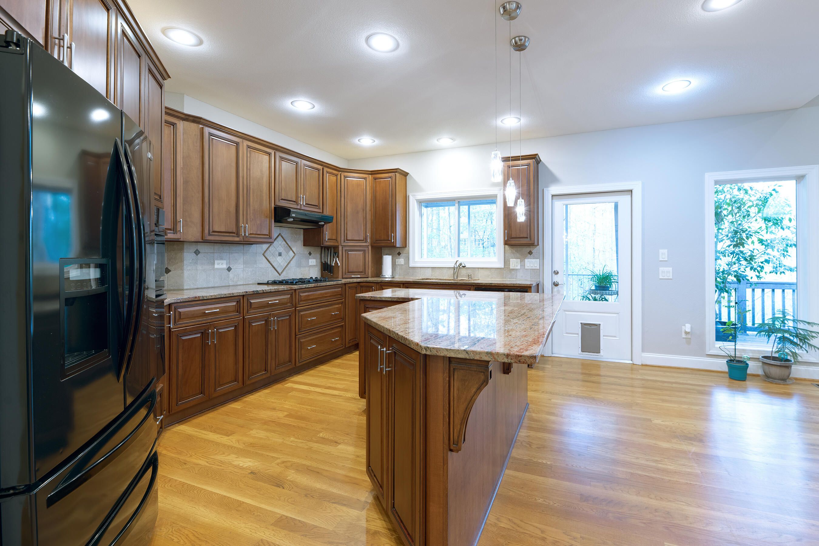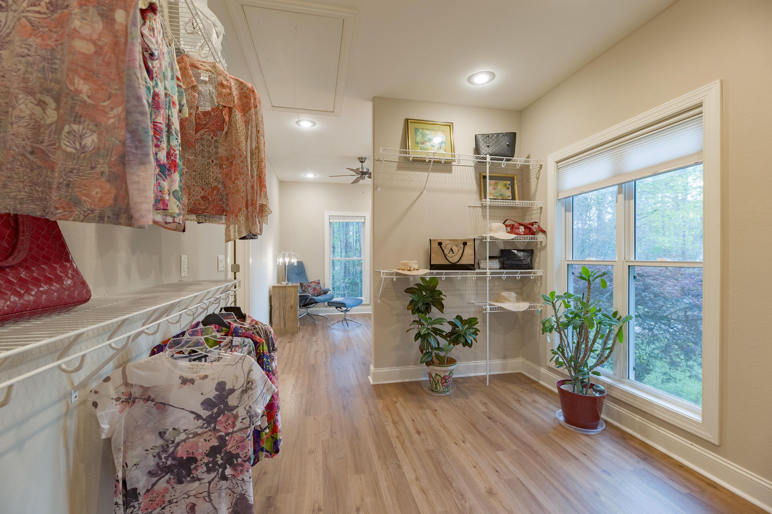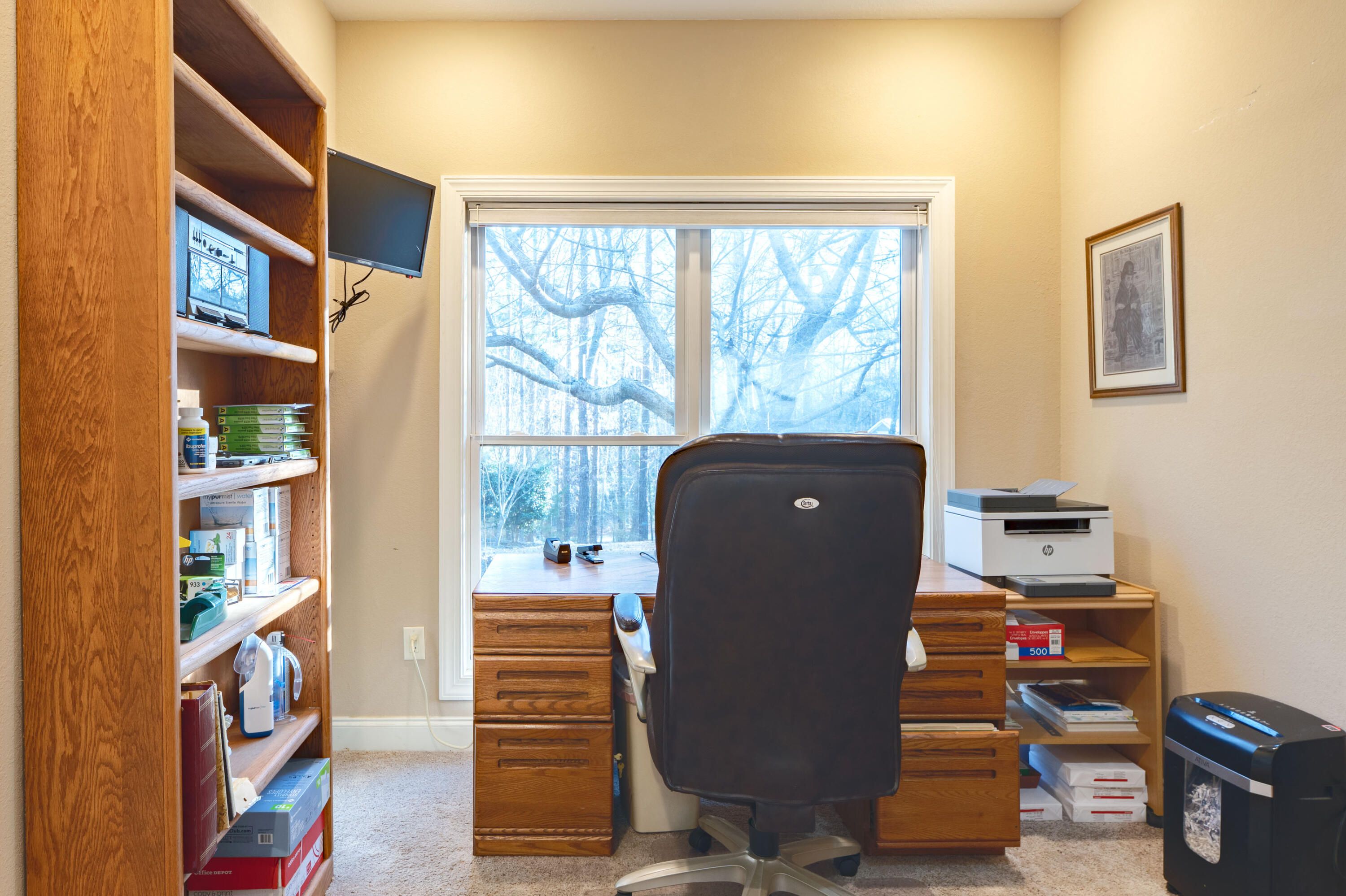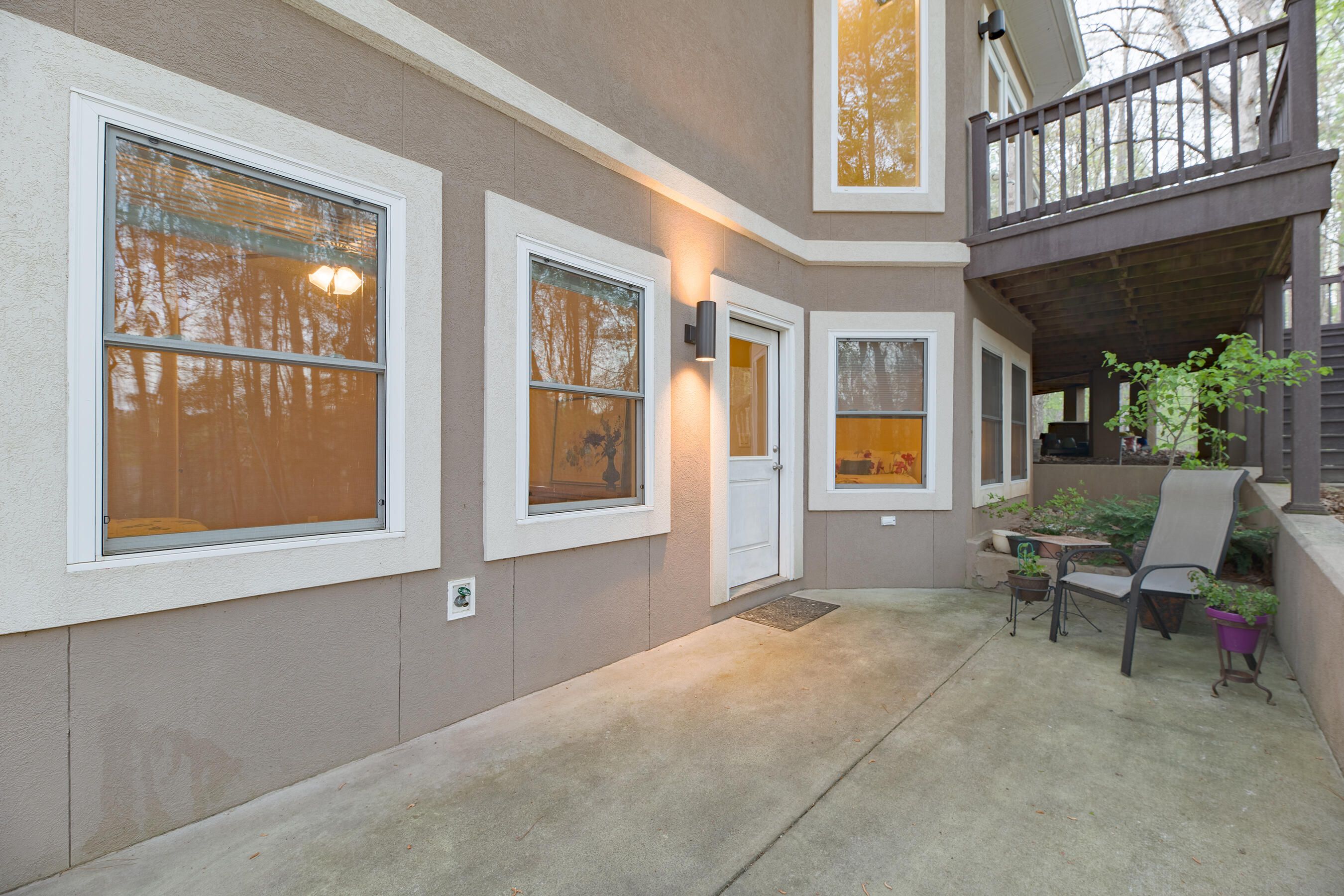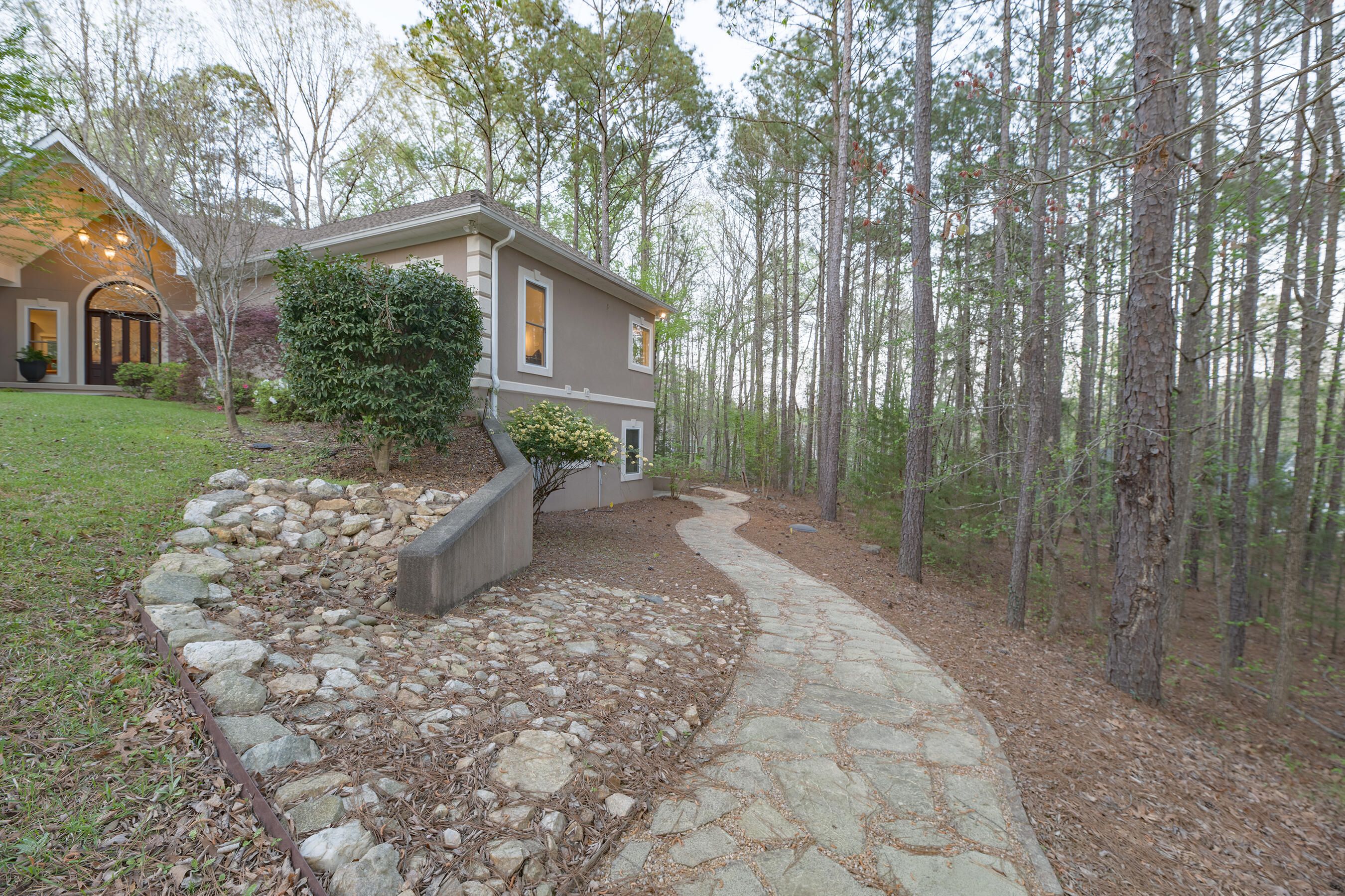 Welcome to this unique custom-designed, freshly painted home which features a grand open floor plan for entertaining, a primary bedroom suite on the main level with a walk-in closet, a spacious dressing room, home office, and the well-appointed bathroom which includes two vanities, a soaking tub, and custom tiled shower. The main level also includes a half-bath convenient for guests, a second home office, and spacious laundry room with an extended pantry. The open living area includes a built-in entertainment center, dining space, and a well-equipped kitchen with a large island. All kitchen appliances including the refrigerator, will remain for the new owner. Outdoor living space is easily accessible from the main level which features a screened-in porch and a deck that expands the full width of the house where you will enjoy the peaceful view of the wooded lot. Extra privacy and vegetative buffers are provided by 20 feet of common area on the left of the home, natural topography behind the home, and optional ownership of half the lot on the right side of the house. This extra half parcel is available for sale and has a written agreement with the neighbor who owns the other half. This home was designed with a lower level apartment to accommodate family, guests, or tenants. The apartment is equipped with a kitchen, washer & dryer hook-ups, two bedrooms, a full bathroom, a storage closet, exterior entrance, a private patio area and custom stone-paved walkway to the parking pad. Savannah Lakes Village neighborhood HOA includes membership access to the Recreation & Fitness Center, indoor and outdoor pools, hot tub, sauna, pickleball and tennis courts, two golf courses, walking trails, and restaurants.