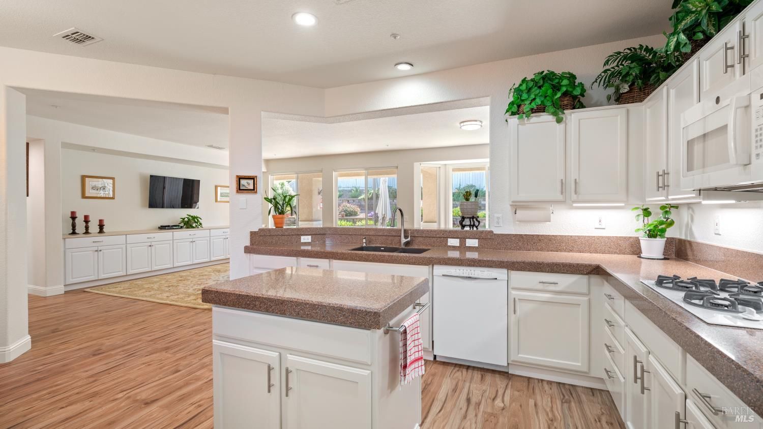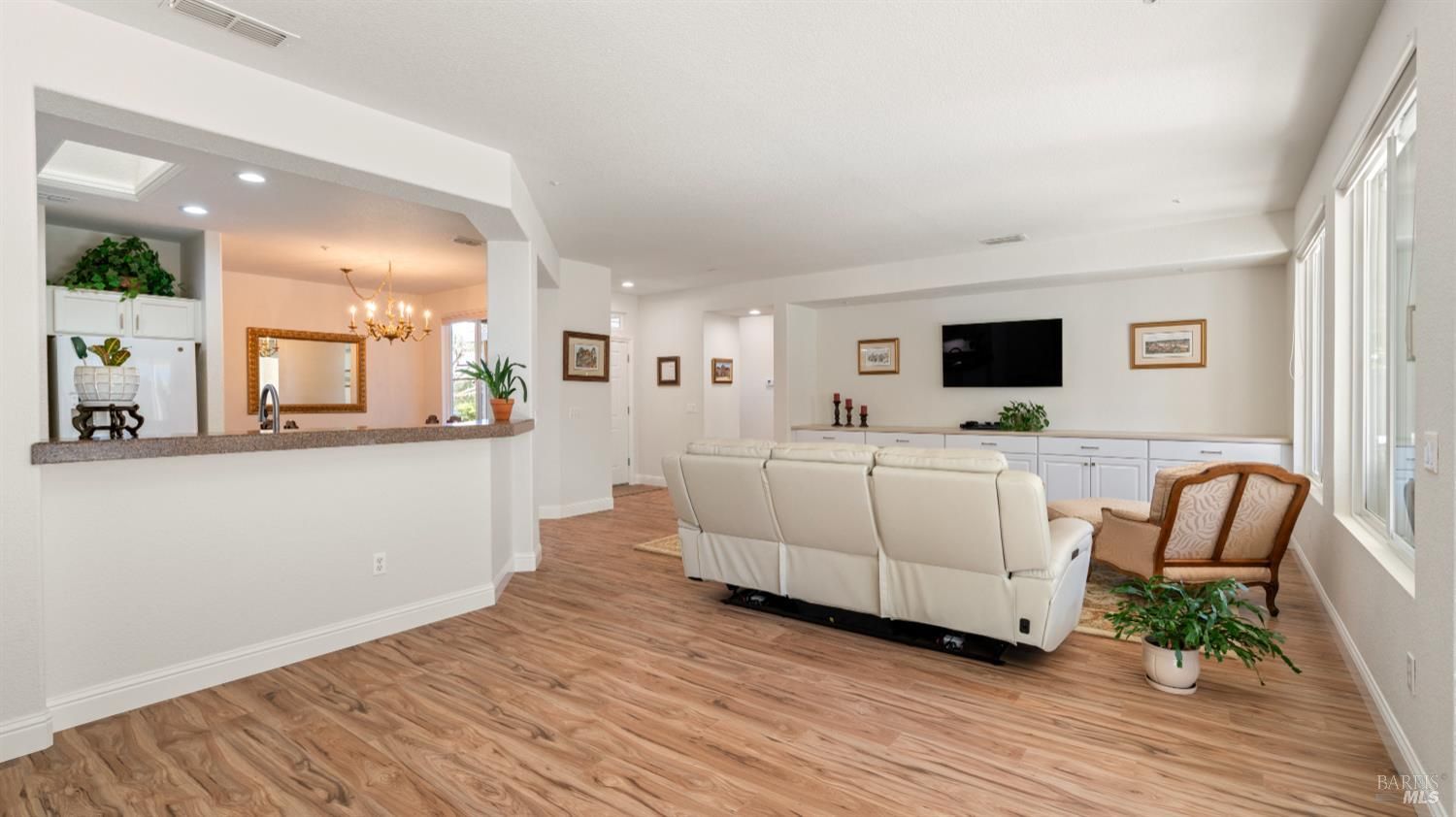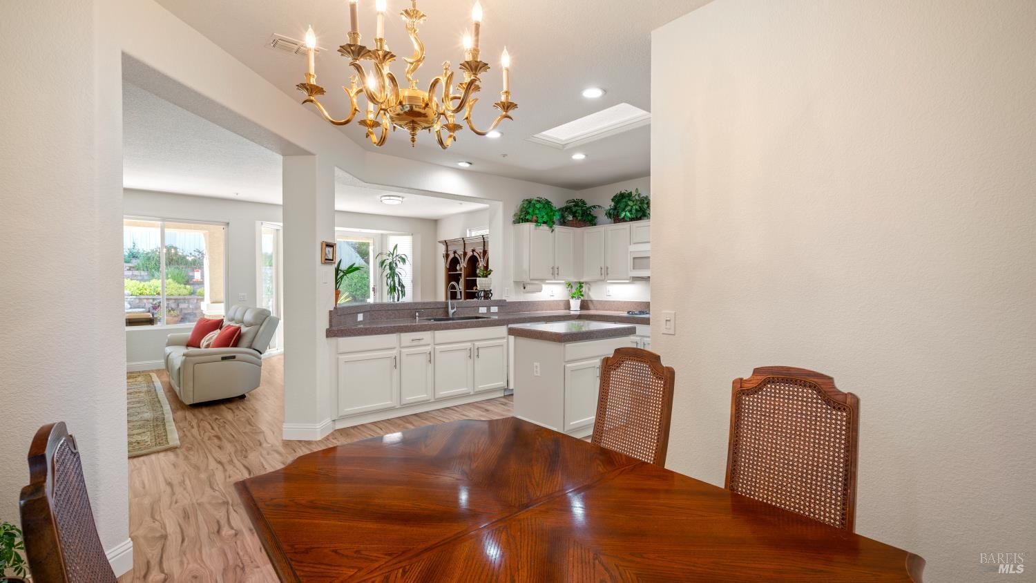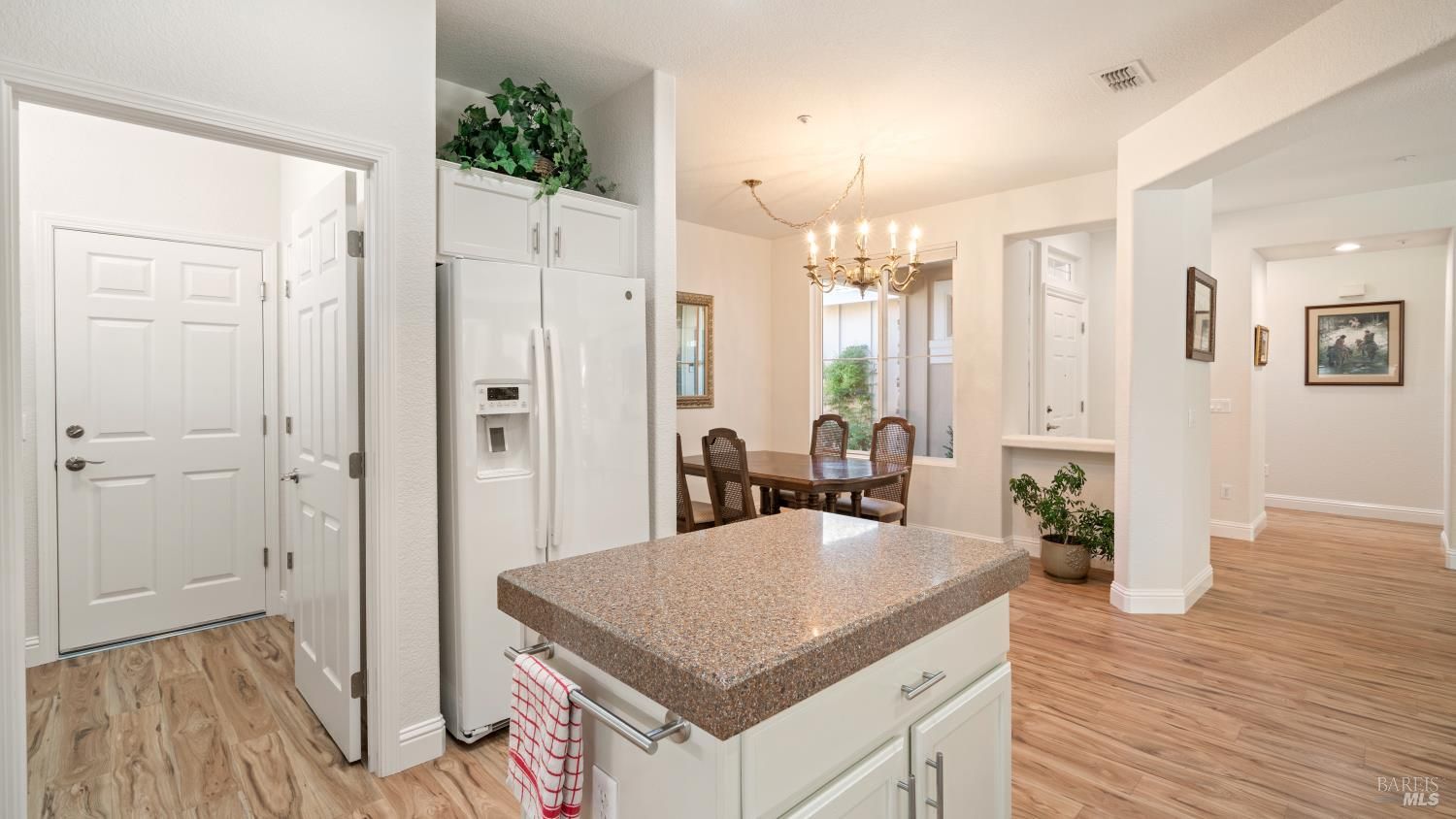 Located in the 55+ community of Clover Springs, this Calistoga model offers comfortable single-level living with a well-designed open floor plan and thoughtful updates throughout. With approximately 1,536 sq. ft., the layout is both functional and inviting, with spaces that work well for everyday living as well as visiting family and friends. Recent improvements give the home a fresh, cohesive feel, including painted interiors and cabinets, resurfaced countertops, luxury vinyl plank flooring throughout, refurbished blinds, updated lighting, and replaced bathroom fans. The kitchen opens comfortably to the main living area and includes granite countertops, ample prep space, and flows to the formal dining space. The primary suite has been updated with new bathroom counters and a remodeled walk-in shower, while the guest bath features updated fixtures. Additional improvements include new toilets, a bidet toilet seat, a new laundry sink, and added lighting in the garage. A former fireplace was removed to create a cleaner media center wall and a more functional living space. Outside, both the front and back yards have been improved with landscaping, drip irrigation, and weed cover for easier maintenance. The extended patio creates a welcoming outdoor area for relaxing, dining, or entertaining with mountains in the backdrop. Clover Springs residents enjoy access to a clubhouse, pool, spa, tennis courts, recreation area, and scenic walking trails, offering an appealing mix of activity and community.