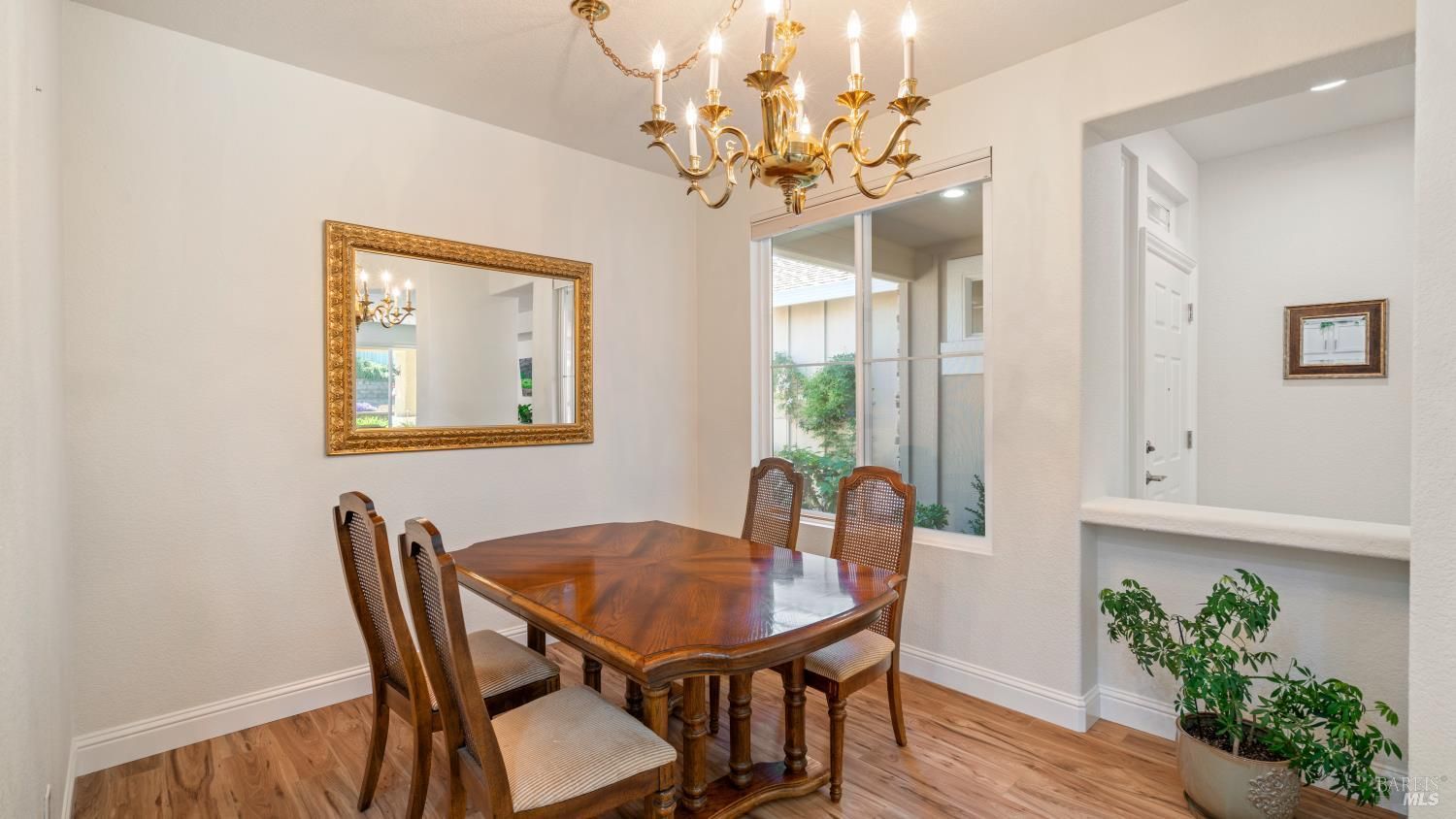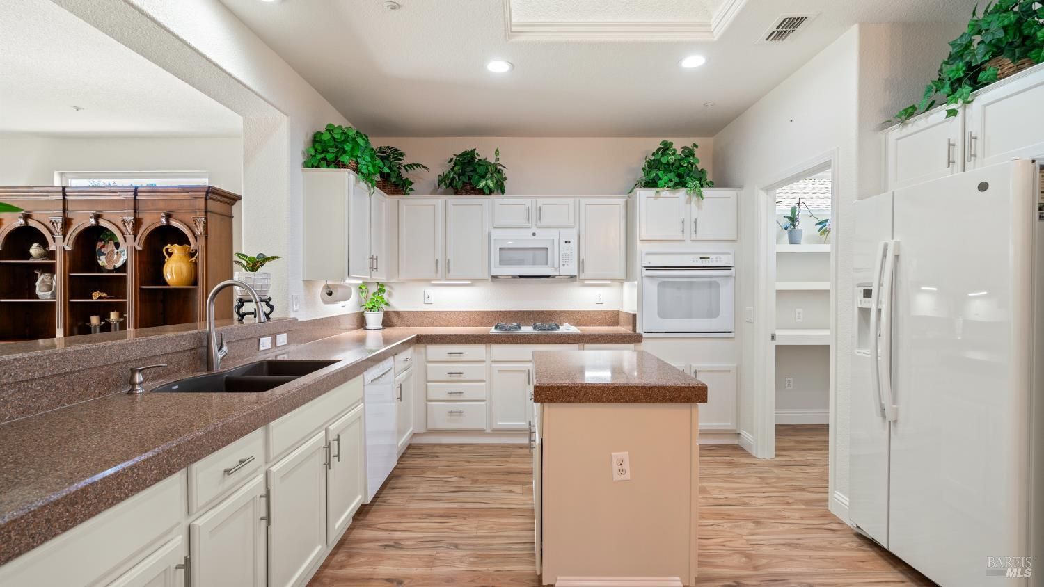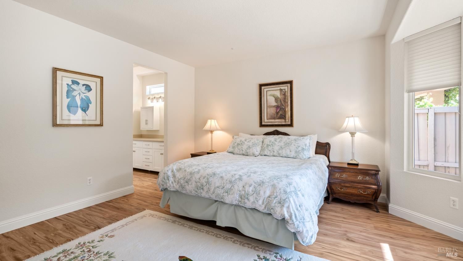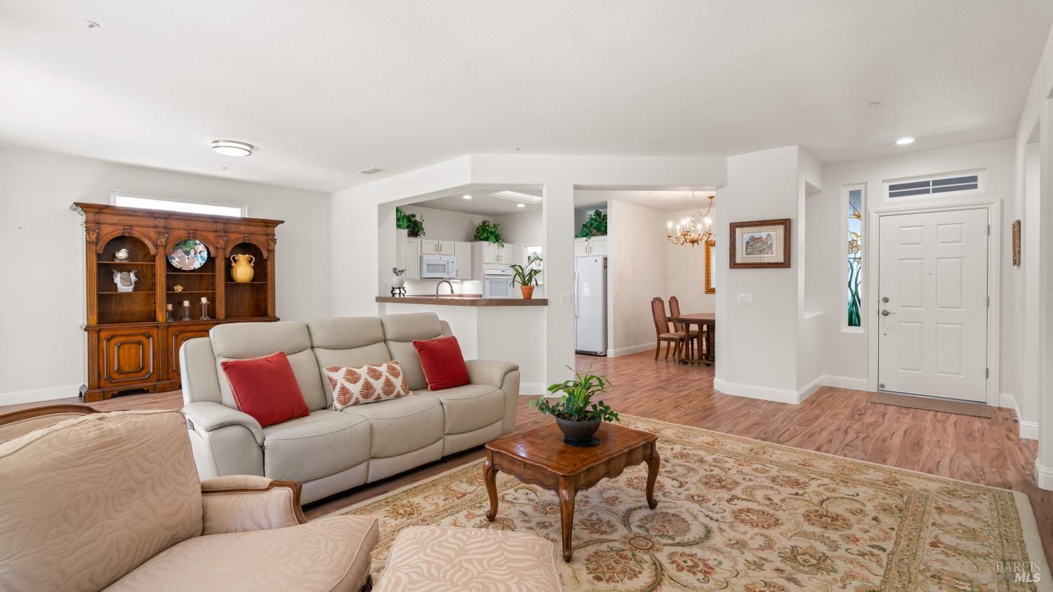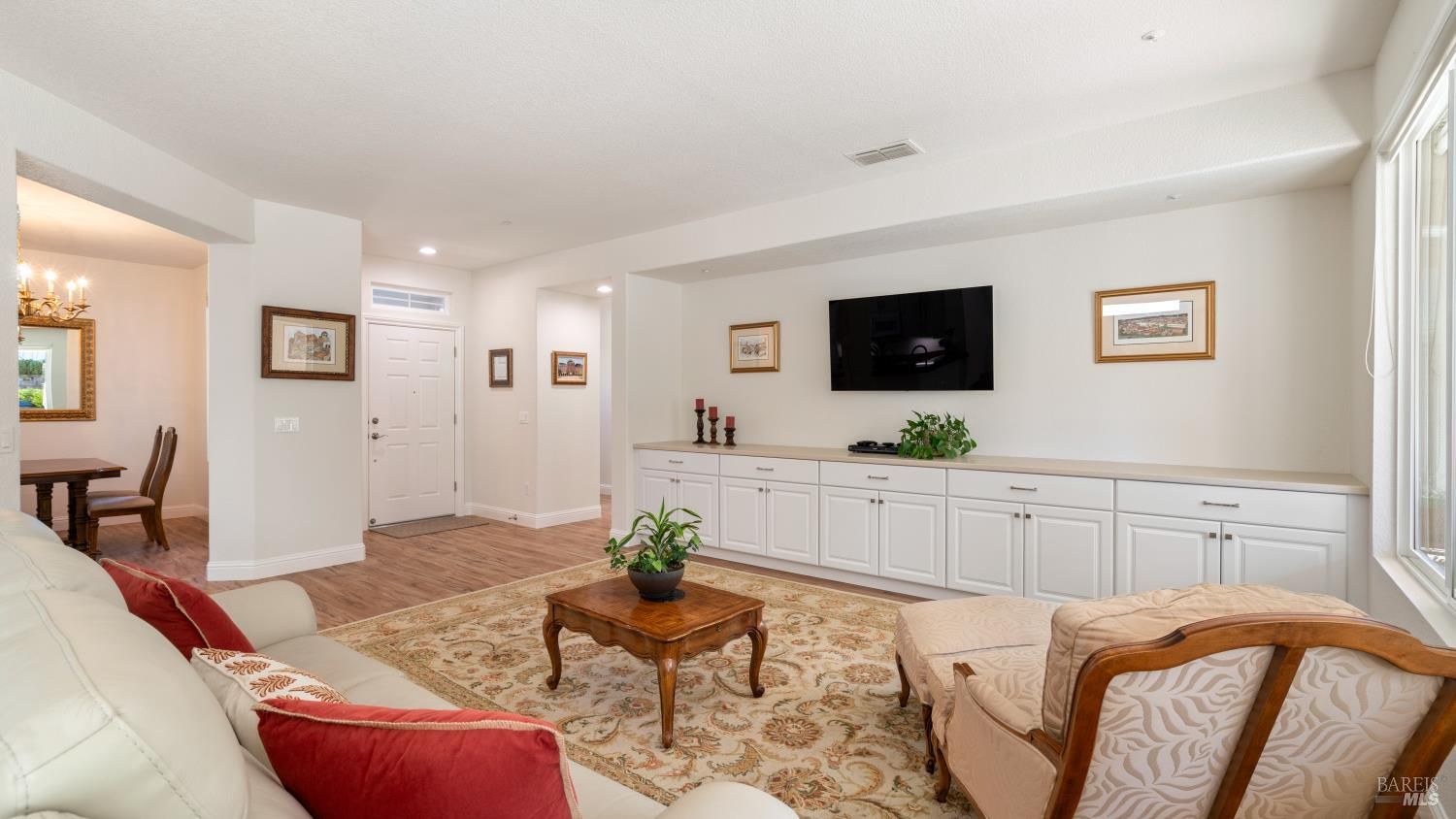 Located in the 55+ community of Clover Springs, this Calistoga model offers comfortable single-level living with a well-designed open floor plan and thoughtful updates throughout. With approximately 1,536 sq. ft., the layout is both functional and inviting, with spaces that work well for everyday living as well as visiting family and friends. Recent improvements give the home a fresh, cohesive feel, including painted interiors and cabinets, resurfaced countertops, luxury vinyl plank flooring throughout, refurbished blinds, updated lighting, and replaced bathroom fans. The kitchen opens comfortably to the main living area and includes granite countertops, ample prep space, and flows to the formal dining space. The primary suite has been updated with new bathroom counters and a remodeled walk-in shower, while the guest bath features updated fixtures. Additional improvements include new toilets, a bidet toilet seat, a new laundry sink, and added lighting in the garage. A former fireplace was removed to create a cleaner media center wall and a more functional living space. Outside, both the front and back yards have been improved with landscaping, drip irrigation, and weed cover for easier maintenance. The extended patio creates a welcoming outdoor area for relaxing, dining, or entertaining with mountains in the backdrop. Clover Springs residents enjoy access to a clubhouse, pool, spa, tennis courts, recreation area, and scenic walking trails, offering an appealing mix of activity and community.