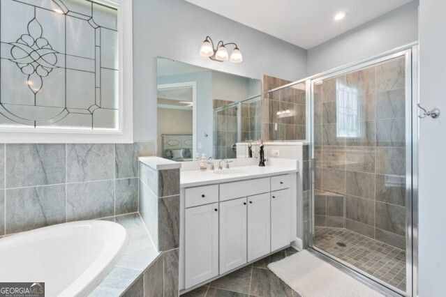 - Double Vanity, High Ceilings, Main Level Primary, Separate Shower, Soaking Tub, Split Bedrooms, Tile Bath, Tray Ceiling(s), Vaulted Ceiling(s), Walk-In Closet(s), Den, Family Room, Entrance Foyer