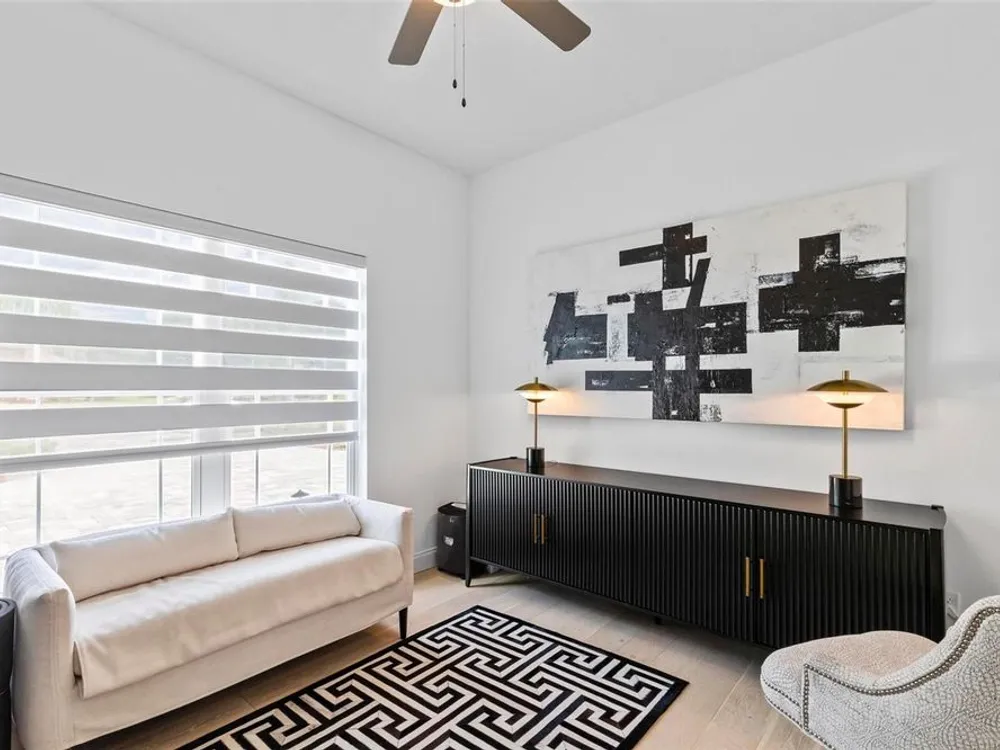 - High Ceilings, Open Floorplan, Main Level Primary, Solid Surface Counters, Solid-Wood Cabinets, Split Bedrooms, Thermostat, Walk-In Closet(s), Window Treatments