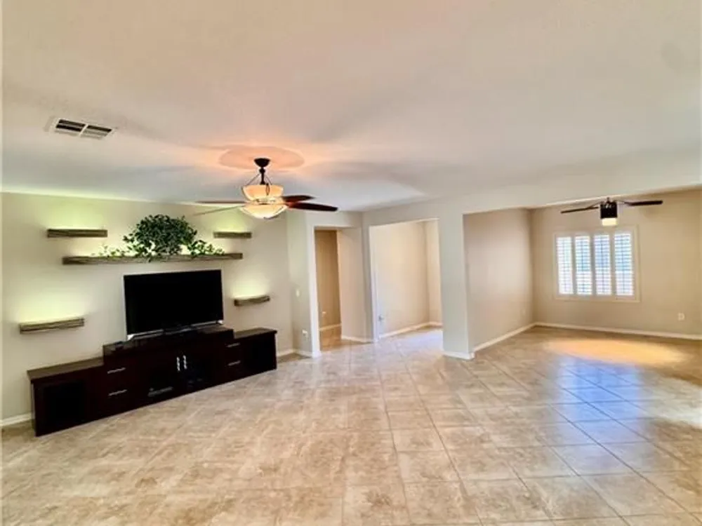 This home has it all inside and out! Beautifully landscaped front & backyard with palm trees, stamped concrete, custom lighting, solar screens, covered patio, stone table, BBQ grill, and privacy & views with no neighbor behind you. Step inside this Jackson floor plan that offers high ceilings and open space! The granite Kitchen with matching stainless steel appliances and breakfast bar that overlooks the living space is perfect for entertaining, living room comes w/ lighted wall shelving, TV & Entertainment Cabinet! Sunburst Shutters throughout the home and solar tubes in kitchen, laundry, and guest bathroom, AC was replaced 2024 has 10 yr warranty! Primary Bedroom has access to backyard and fits king size bed with ease, Bathroom double sink, separated tub & shower! Guest bedroom also fits king size bed, safe included, bathroom has Shower! Water softener & Filtration, Alarm, and much much more..... Well taken care of home