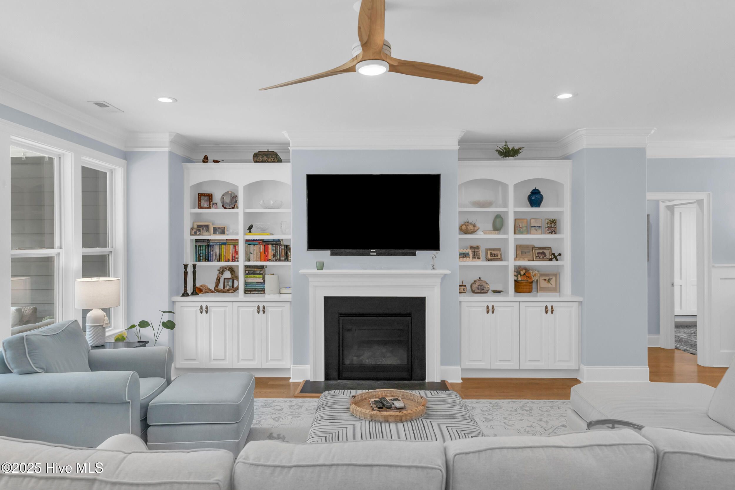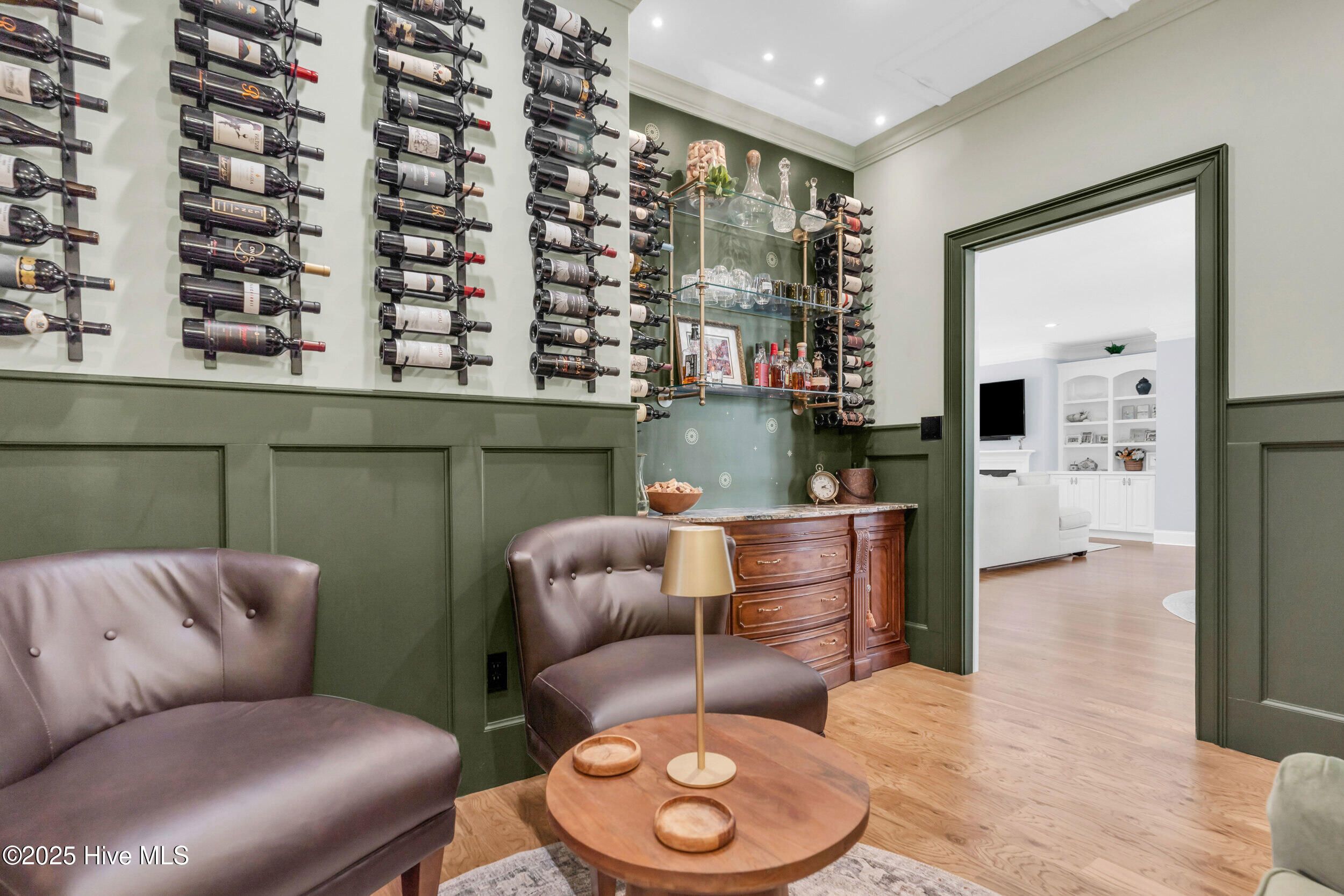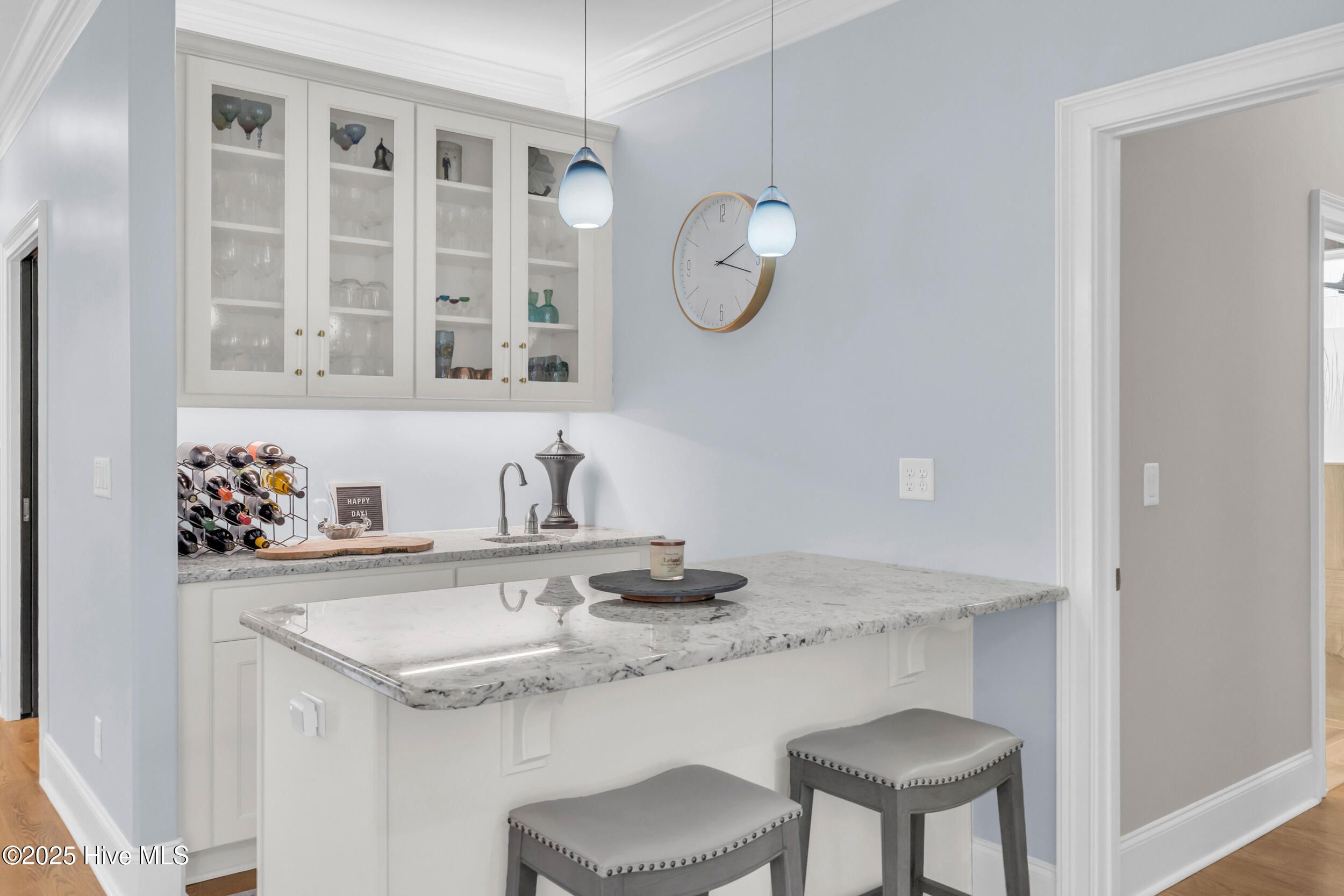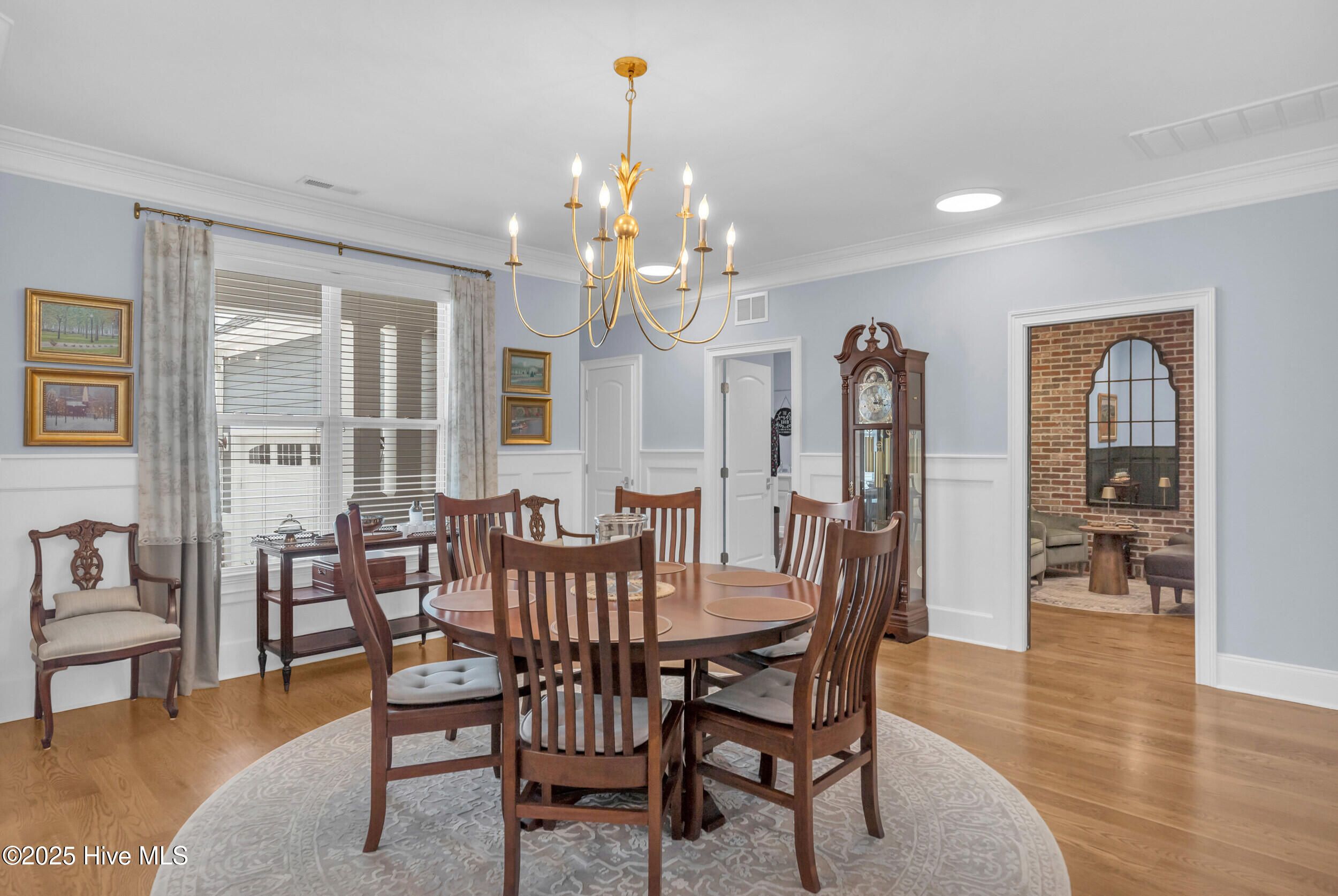 Welcome to this exquisite, one level, 3 bedroom home, where every detail has been thoughtfully designed for luxurious living. Situated on a private cul de sac backing up to serene water and pond views, this home offers an irreplaceable private retreat. Step inside to an open floor plan that is perfect for entertaining and everyday life. The main living areas are adorned with elegant crown moldings, wainscotting, and built in bookshelves, adding a touch of craftsman sophistication. Oak hardwood floors blend seamlessly into the heart of the home, the chef inspired kitchen, It features an oversized island with plenty of seating, gleaming granite counter tops, white cabinetry with pull out shelves and under cabinet lighting, stainless steel appliances, gas range, vented hood and lots of windows to take in the views. There is a custom designed unique wine room dedicated for relaxation and conversation. The wet bar is centrally located between the kitchen, wine room and main living room. The owners suite is spacious, and has a wall of windows to showcase the water views. It has a tray ceiling, walk-in closet, and a private en suite bathroom. The spa-like bathroom has a tiled walk-in shower, double sink vanity, framed mirror, recessed lighting and tile floors. There are two additional bedrooms, one featuring a Murphy bed from Southport Murphy beds and three additional bathrooms. Relax and Unwind on the porch, where the retractable screens and outdoor wired fans allow you to enjoy the fresh air and stunning views without a worry. There is a patio for outdoor dining and grilling and upgraded landscaping. Additional features include 2 car side loading garage, termite bond, large laundry room with wrap around upper and lower cabinetry, floored attic space, gutters, Ring system, hardiplank siding, and irrigation. You have to take time to experience this home and all it has to offer.