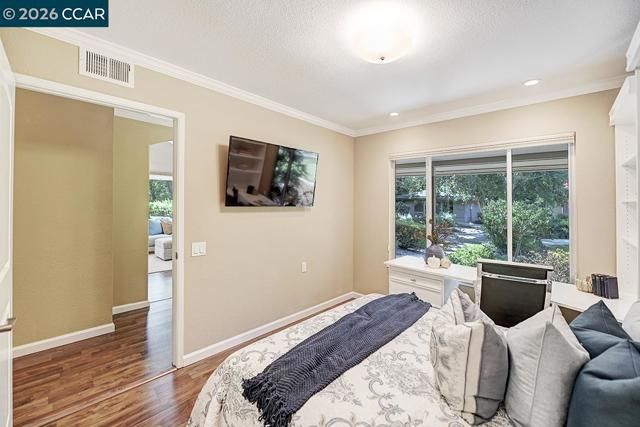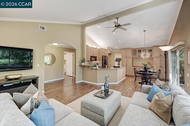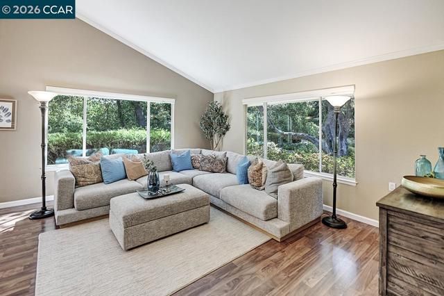Unique Rossmoor condo with dramatic pitched ceilings and a creekside setting near golf course and Gateway Community Center. The airy great room, walls of windows, three skylights, and serene green outlooks create a comfortable space that lives like a charming private cottage—your own corner of the world—yet close to amenities. Over 1,300 sq ft with luxury vinyl plank flooring, crown molding, and smooth ceilings. Updated kitchen with solid-surface counters, gas range, pull-outs, and pantry. “New” heating, A/C and water heater. New skylights. Both baths feature dual sinks; the primary suite offers two walk-in closets. Only one shared wall—rare for this model—offers enhanced privacy. Enjoy Rossmoor’s 55+ lifestyle with golf, pools, 10 miles of trails, parks, fitness center, clubs, art studio, concerts, dances, music, gaming (Bridge/Mah Jong), dog park, events, and more. Jump in and join in!