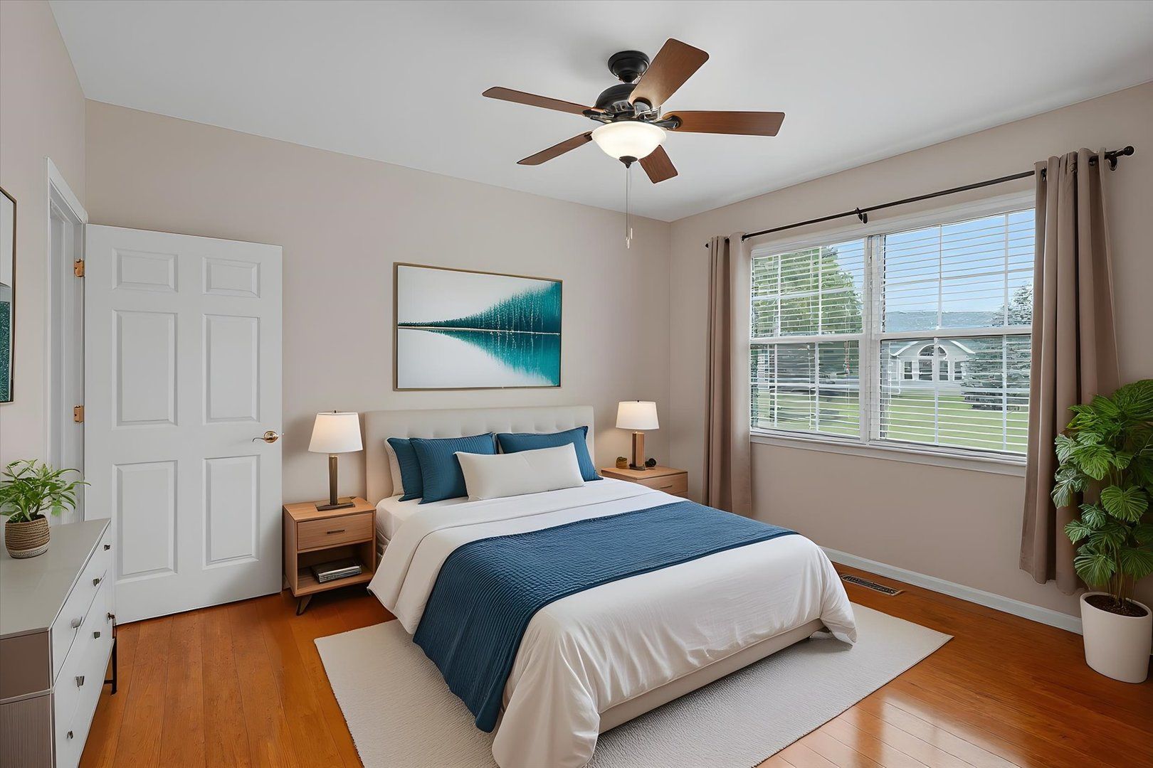 Welcome to this 2-bedroom, 2-bath ranch townhome in the sought-after 55+ community Carillon Lakes. Beautiful hardwood floors create a luxurious feel throughout the dining room, living room, and bedrooms. White trim and classic white 6-panel doors with brushed nickel lever handles add a fresh, modern touch throughout the home. The spacious living room features a vaulted ceiling, two skylights that fill the space with natural light, and views of open space. The open floor plan leads seamlessly into the kitchen with tile floors, stainless steel stove, dishwasher, refrigerator, microwave, an under-sink reverse osmosis system, and a cozy eating area with bay window. Step outside to enjoy the private patio with a privacy fence and peaceful views. The primary suite offers hardwood floors, a ceiling fan, walk-in closet, and a private bath with walk-in shower and grab bars. The second bedroom also features hardwood floors and a large bay window. This guarded, gated community offers resort-style living with a clubhouse, indoor and outdoor pools, fitness room, Pickle Ball, Bocce Ball, 3-hole golf course with putting green, ponds, fishing, and an auxiliary pool for visiting guests under 18. Major updates include: furnace & A/C (2019), water heater (2020), washer (2021), garage door opener (2022), reverse osmosis system (2022), roof (2024), and gutters (2024) garbage disposal (2025). Move-in ready and low maintenance, this home combines comfort, convenience, and community.