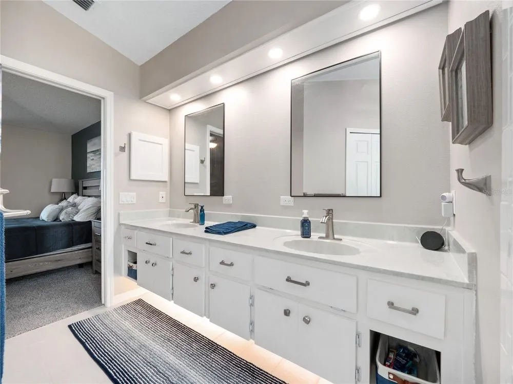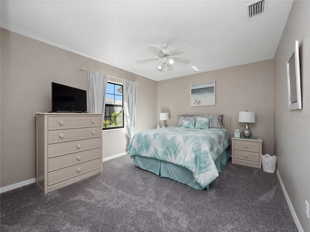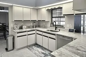 - Ceiling Fan(s), Eat-in Kitchen, High Ceilings, Kitchen/Family Room Combo, Open Floorplan, Main Level Primary, Solid Surface Counters, Split Bedrooms