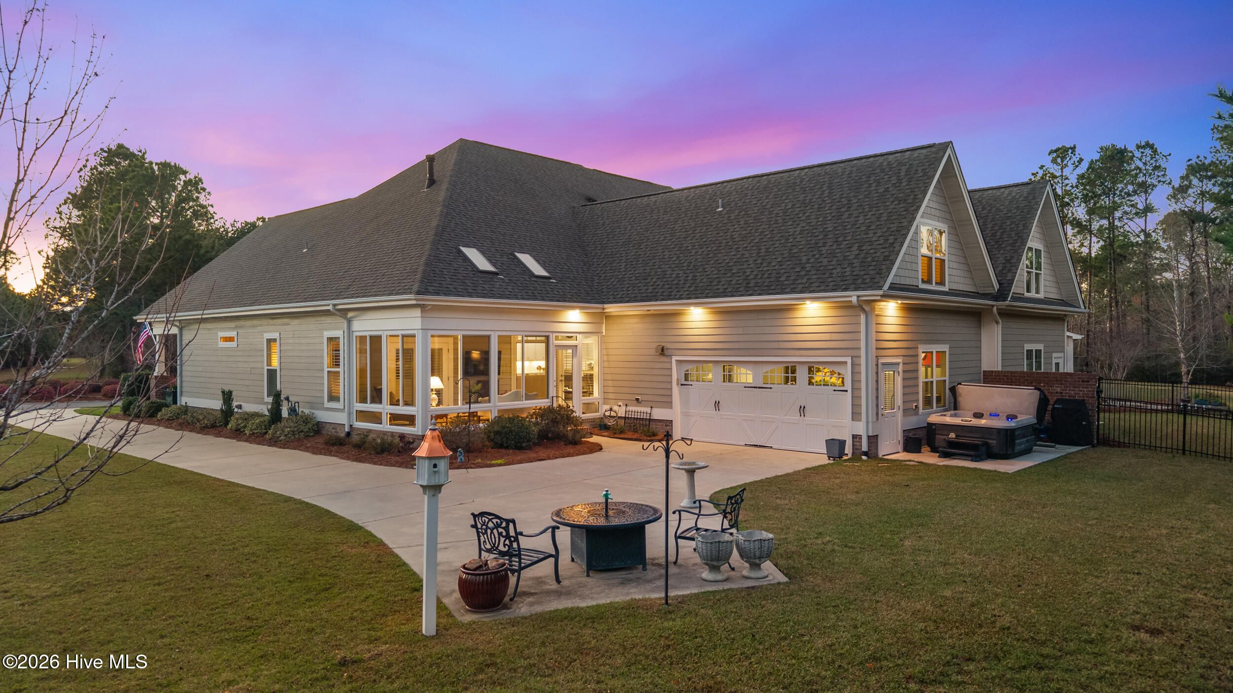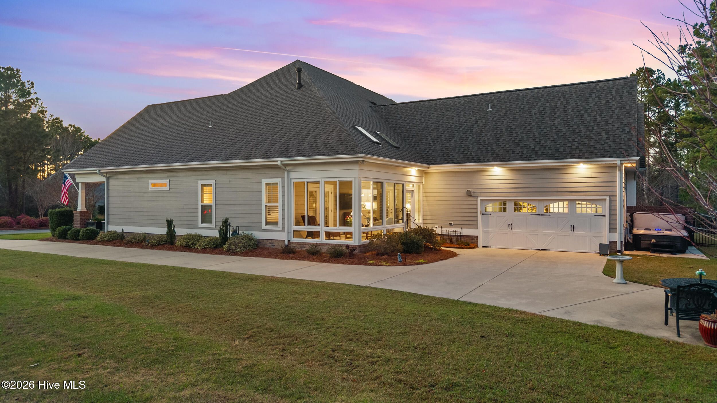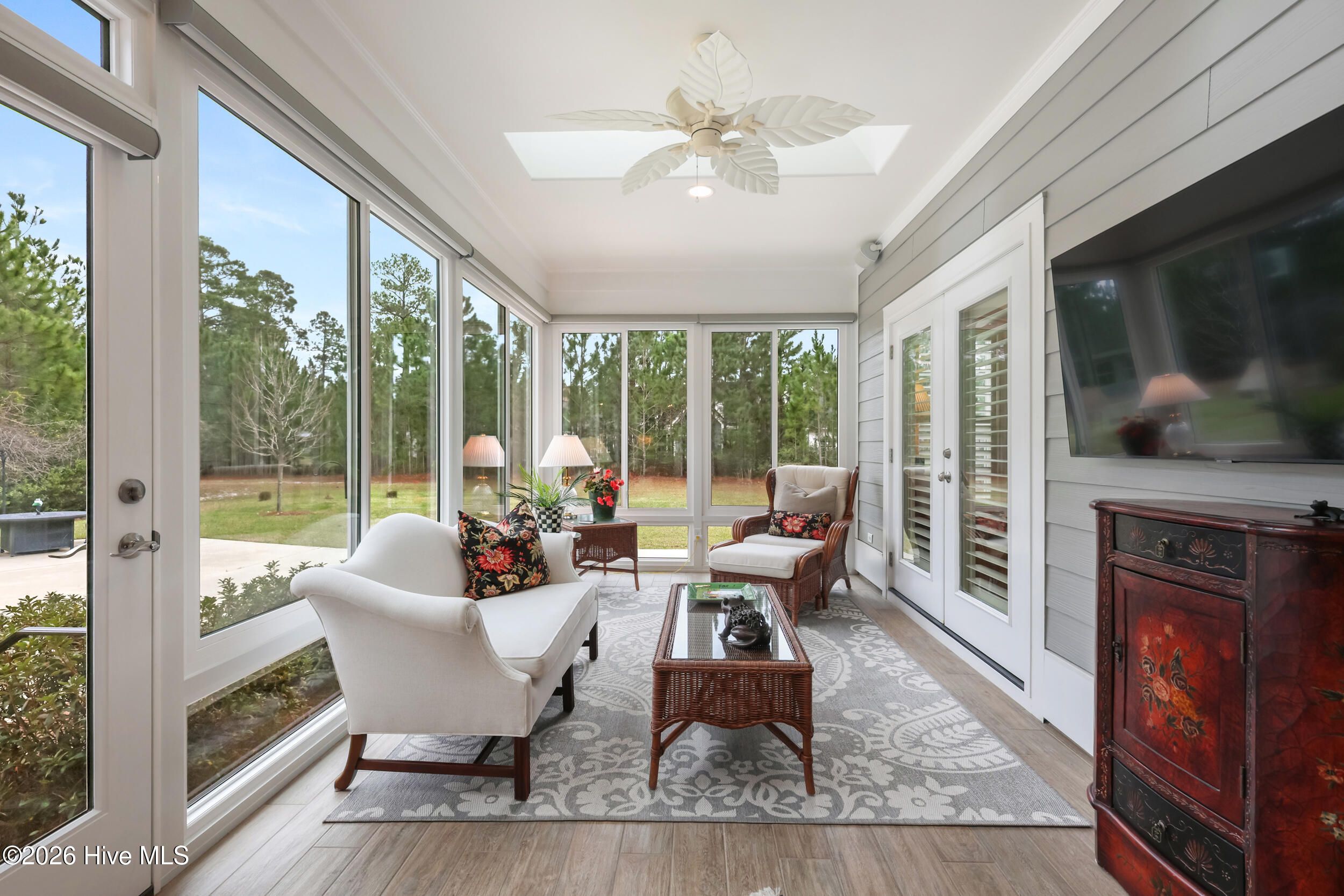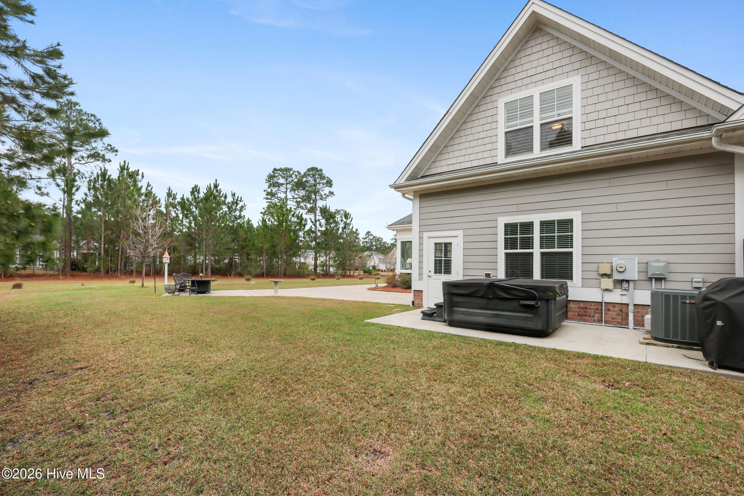 Beautifully maintained townhome by Trusst Builder Group, ideally located in the sought-after Shelmore neighborhood of Brunswick Forest. Enjoy a short stroll to Hammock Lake's fitness center, pool, and scenic lakefront beach. This rare homesite offers exceptional privacy with wooded views behind and no neighboring home on one side or directly across the street. A welcoming covered front porch leads into the foyer and open-concept Cedar Island II floor plan. The great room is both inviting and refined, featuring a gas fireplace flanked by custom built-ins, a coffered ceiling, and seamless access to a glass-enclosed sunroom (not heated/cooled) complete with remote-control sun shades -perfect for year-round enjoyment of the natural surroundings. The kitchen is designed for both everyday living and entertaining, offering abundant cabinetry, a center island with seating, subway tile backsplash, upgraded granite countertops, walk-in pantry, and stainless steel appliances. The dining area is accented with chair rail detailing and an illuminated tray ceiling. A dedicated office with glass French doors and a coffered ceiling provides an ideal work-from-home space. The primary suite is a private retreat with an illuminated tray ceiling, direct access to the lanai, and a luxurious ensuite bath featuring a quartz vanity, walk-in tiled shower, linen closet, and oversized walk-in closet. The main level also includes a secondary bedroom and full bath, spacious laundry room, and two-car garage. Upstairs, a versatile bonus room with walk-in attic access is complemented by a full bath - ideal for guests or additional living space. Additional highlights include hardwood flooring throughout the main living areas, plantation shutters, whole-house surge protection, generator, multi-zone HVAC, extended backyard patio, integrated sound system, and natural gas connections for the stove, fireplace, and water heater. HOA dues include full landscaping maintenance, master insurance, and select exterior building maintenance. Residents of Brunswick Forest enjoy exceptional amenities including multiple fitness centers, indoor and outdoor pools, tennis and pickleball courts, parks, trails, kayak/boat launch, playgrounds, and more.