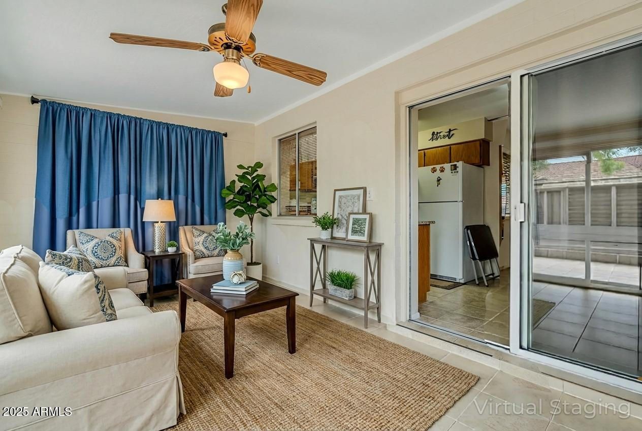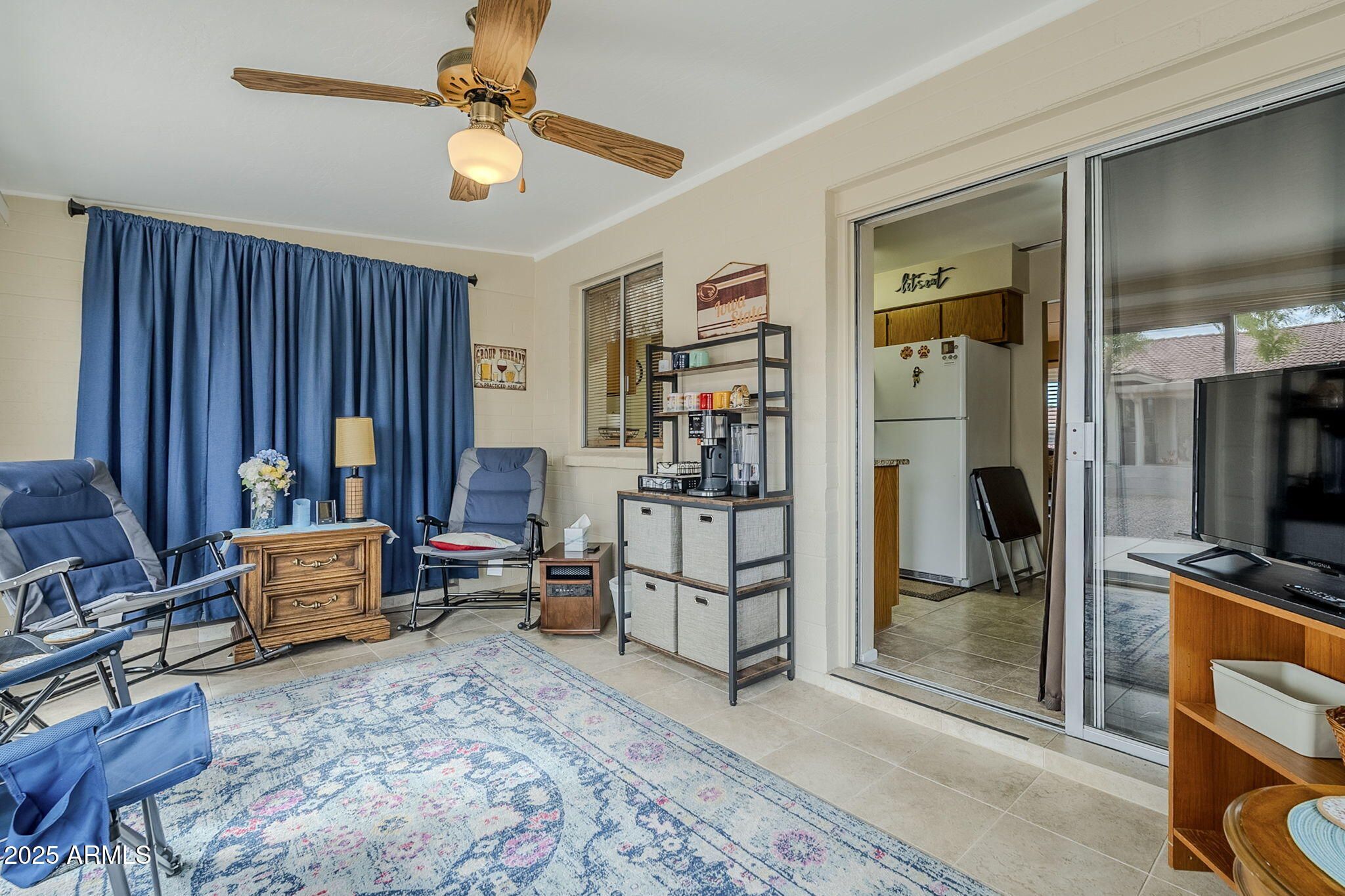 Don't let the square footage fool you—this charming 2-bedroom, 2-bath split floorplan home lives larger than expected with a thoughtfully designed layout and an additional 200 sq. ft. enclosed bonus room that brings light, versatility, and indoor-outdoor living. While not heated or cooled, this space is perfect for enjoying your morning coffee or unwinding with a breeze through the three screened sliding glass doors. This home offers the ultimate lock-and-leave, low-maintenance lifestyle—ideal for winter visitors or full-time residents alike. It has been meticulously cared for, with major updates that include a roof replacement in 2019, a full AC system replacement in 2022, a new water heater in 2023, and interior repainting along with the removal of popcorn ceilings. These are just a few of the many thoughtful improvements made throughout the home. Inside, you'll appreciate the vaulted ceilings in the living room, which features a bright west-facing window that fills the space with natural light. The cozy dining area sits just off the kitchen and flows seamlessly into the living space, creating a comfortable layout for everyday living or entertaining. The split-bedroom floorplan offers privacy, making it ideal for hosting guests. The spacious primary suite includes its own private bathroom and a walk-in closet, while the guest bedroom is conveniently located near the second full bathroom. The interior laundry room adds function and includes pantry-style shelving for added organization and storage. The east-facing backyard patio soaks up the morning sun and offers a peaceful retreat in the afternoons. The double garage includes built-in cabinets, a storage closet, and overhead storageperfect for tools, totes, and more. Located in Sunland Village East, one of the East Valley's most desirable 55+ communities, you'll have access to top-tier amenities: golf, pickleball, tennis, bocce ball, shuffleboard, pools, clubs, fitness center, and a vibrant social calendar.