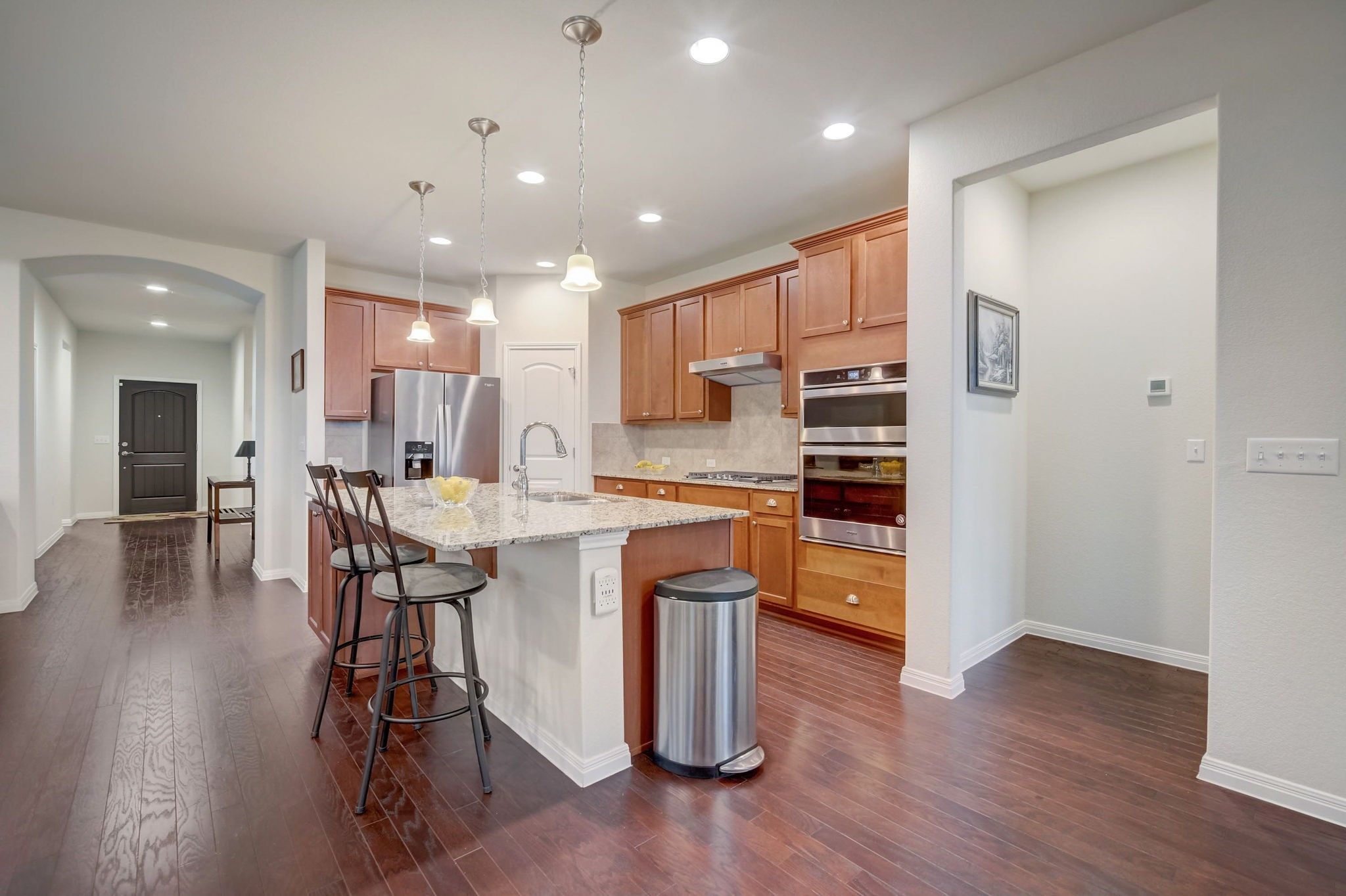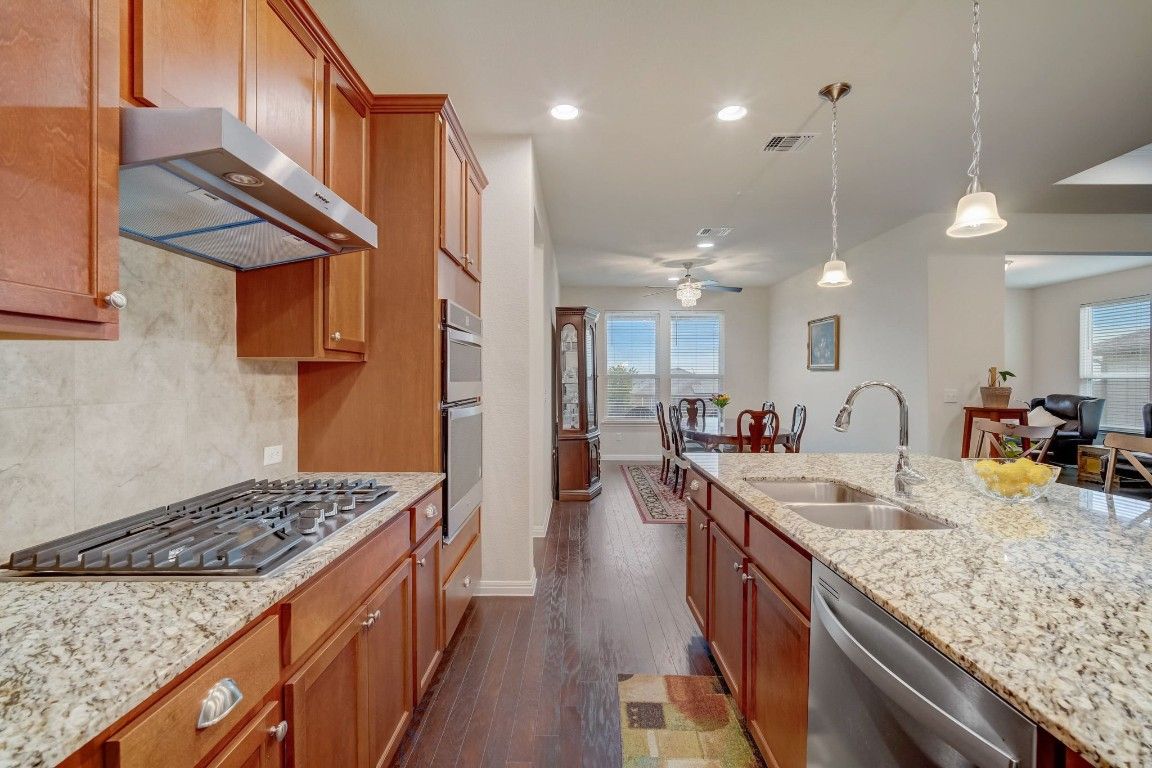 Gorgeous Sun City residence exuding exceptional curb appeal. The meticulously landscaped front yard boasts manicured flower beds and an oak tree, accentuated by charming brick landscape walls. Step inside to discover a seamlessly connected kitchen, complete with 42-inch cabinets and built-in stainless steel appliances, flowing into a spacious family room adorned with a tray ceiling and recessed lighting. Granite countertops grace both kitchen and bathrooms, while wood floors enhance the primary living spaces. Abundant living space includes a generously sized study with French doors and a cable TV outlet, along with a sunroom flooding the area with natural light. The primary bedroom offers a tray ceiling, walk-in closet, and a luxurious bathroom with dual vanity, large shower, and garden tub. A three-car tandem garage offers additional storage, including space for a golf cart. Outside, the backyard boasts an extended patio overlooking a lush greenbelt adorned with seasonal wildflowers, cacti, and trees. Equipped with gas and water lines, the back patio is ideal for outdoor cooking and entertaining. Conveniently located just minutes from the new North Point amenity center and all the numerous amenities Sun City has to offer.