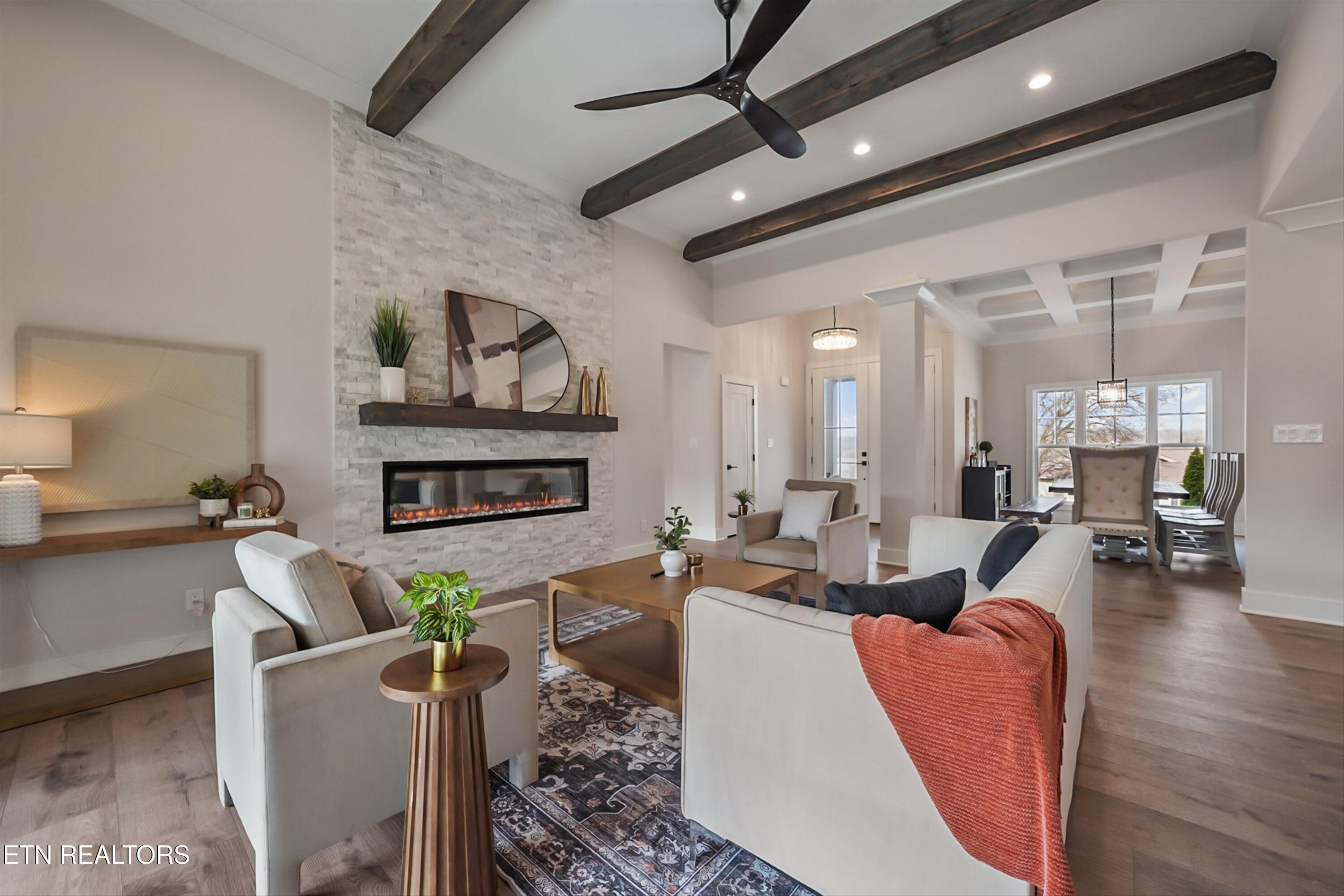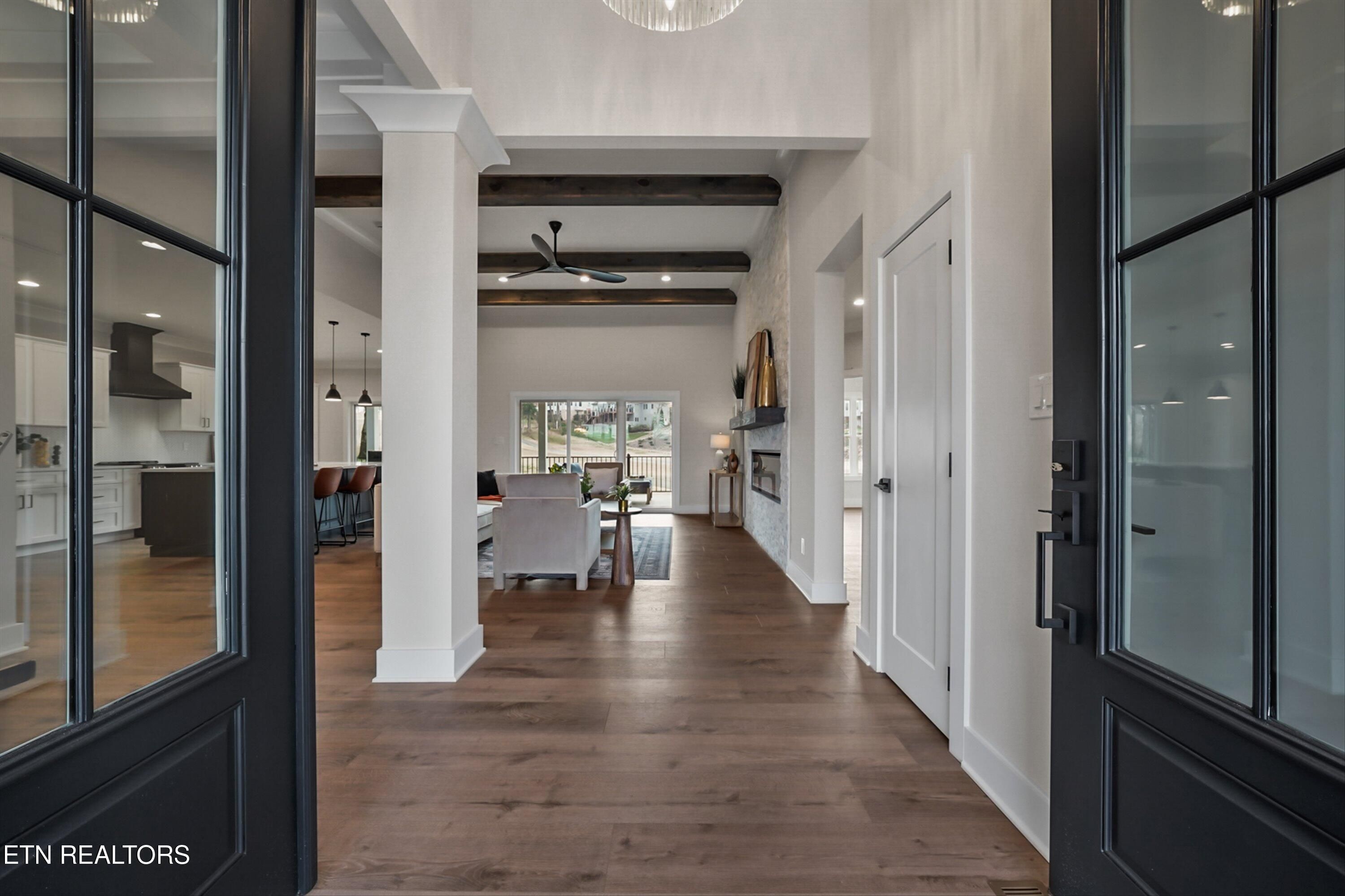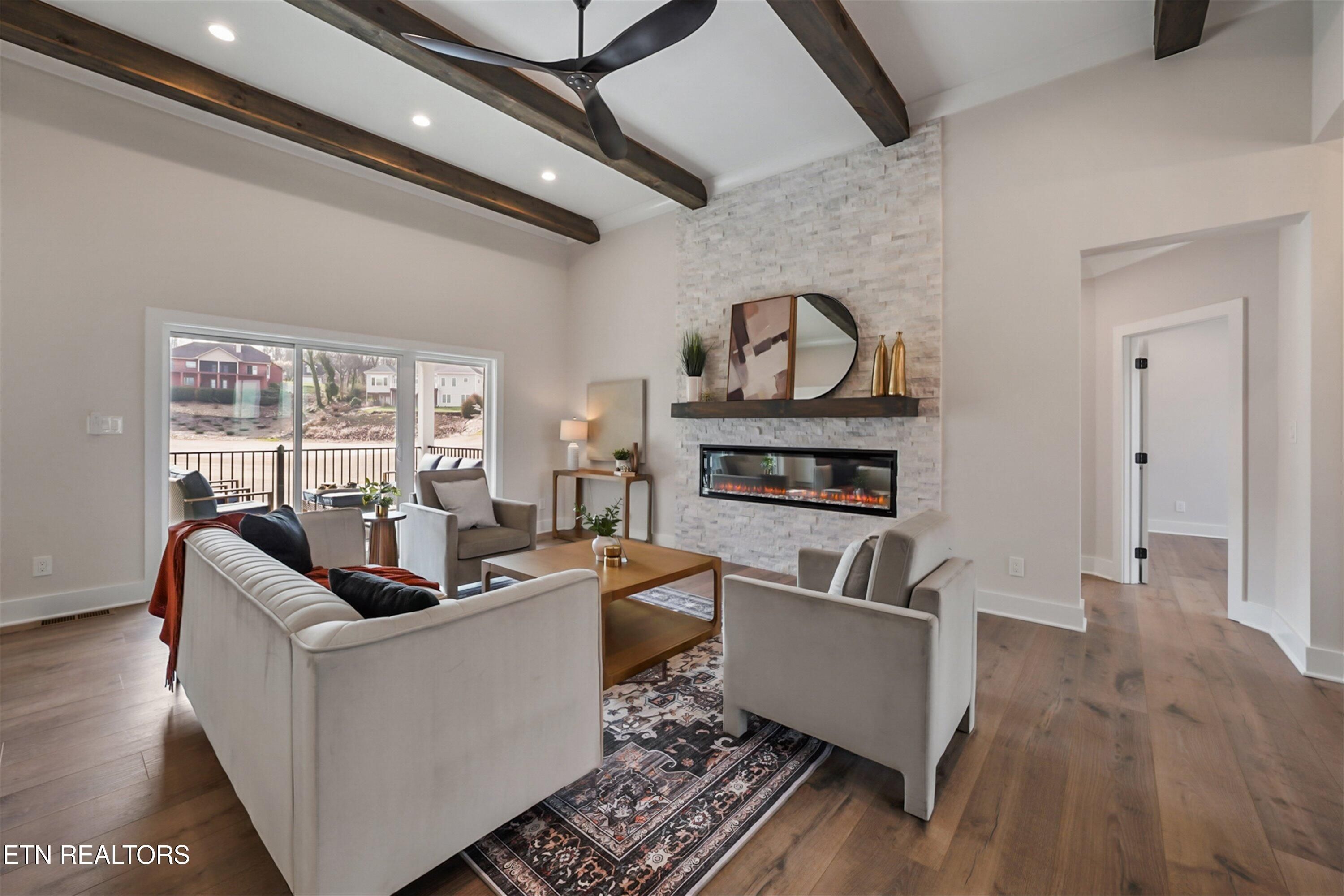 The last new home on Toqua Golf Course, ideally positioned on a quiet cul-de-sac with golf-front views and glimpses of Tellico Lake. Thoughtfully designed for main-level living, this 4BR/4.5BA residence features 12-ft ceilings with wood beams, hardwood floors, quartz countertops, and a GE Café appliance package. Expansive glass doors open to a 60-ft covered deck overlooking the course -- ideal for relaxed mornings or evening entertaining. The main-level primary suite offers 11-ft ceilings, a spa-inspired bath with oversized walk-in shower, and a generous walk-in closet. Downstairs includes an 850+ sq ft heated and cooled garage retreat with private safe room -- perfect for hobbies, storage, or secure space. A rare opportunity to own the final newly built home on Toqua Golf Course at a significantly improved price. Private showings available.