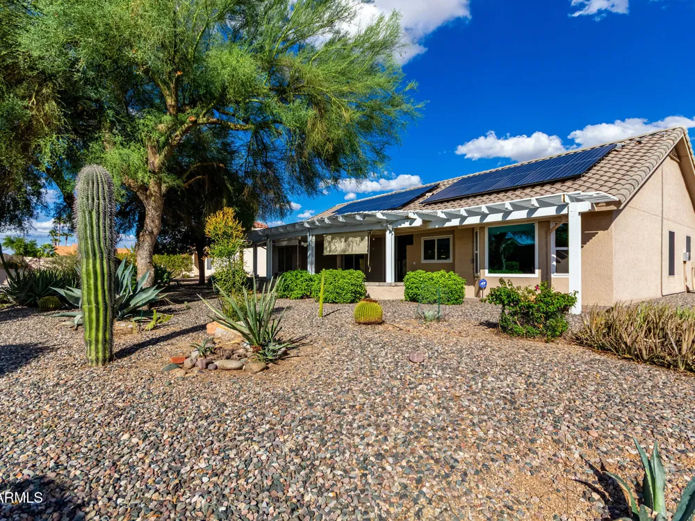 Beautiful 2,000 sq ft Cromwell floor plan built in 1992, featuring 2 split bedrooms, 2 bathrooms, and a separate den. Home has a GR/DR as well as a Family room and a Dinette. The open & spacious kitchen has a center island, granite counters, SS appliances, gas stove and newer cabinets. The home has large neutral tiled floors w/carpet in the bedrooms. Master bathroom is remodeled with a walk in shower, double sinks and private commode. Guest bath is partially upgraded and the huge indoor laundry room is upgraded w/granite counter & cabinets. All windows in the front as well as the Kitchen & Den are newer. APS-owned solar panels installed in 2016 with no lease payments. Situated on a large lot with block wall in the back, a large extended covered patio offers great AZ outdoor living.