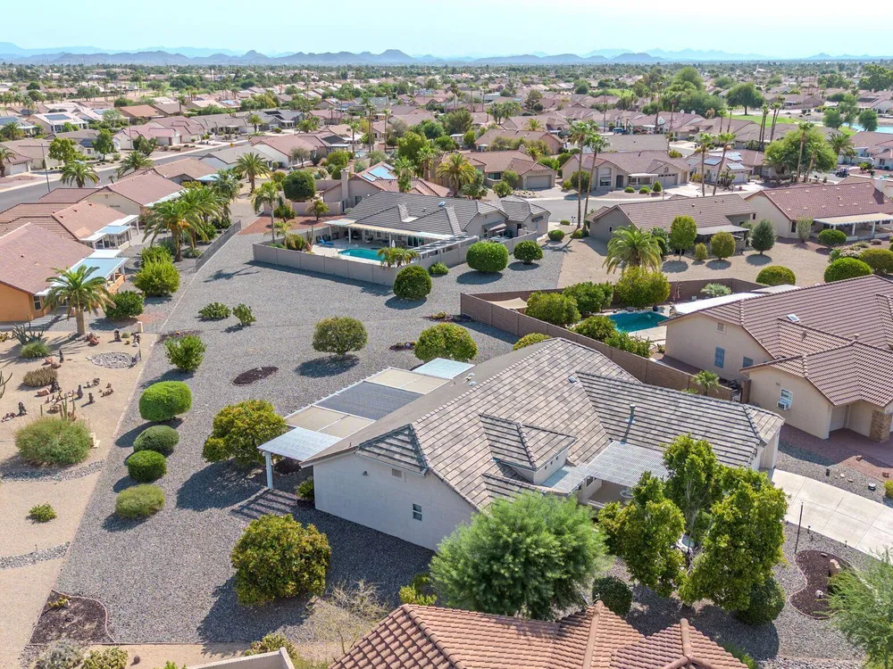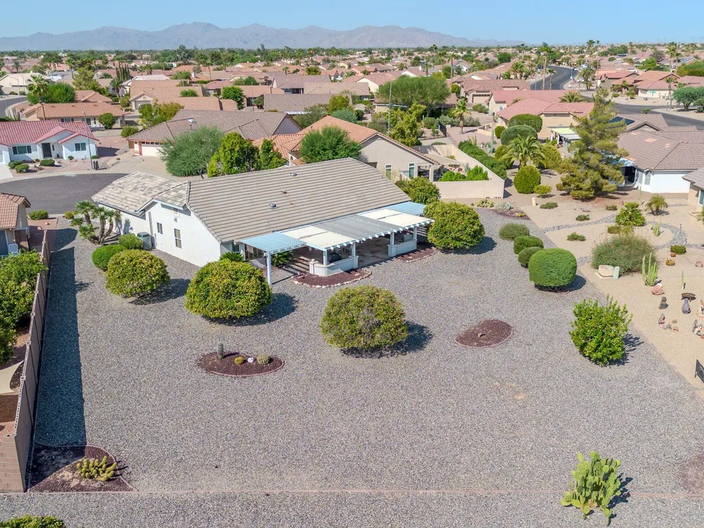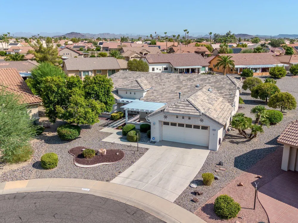 Beautiful Cromwell floor plan on an oversized cul-de-sac lot in Sun City West! Roof is only 6 years old and the AC is newer for peace of mind. This spacious home features soaring ceilings, plantation shutters, Corian counters, and a huge indoor laundry room. The versatile den/office can also serve as a bedroom. Step outside to the massive backyard with ample room for a pool and/or additional garage, plus covered patios in both front and back—perfect for relaxing or entertaining. Additional highlights include a whole-house water system loop and coated driveway. With thoughtful updates, curb appeal, and one of the community's most desirable layouts, this Cromwell is ideal for seasonal or year-round living.