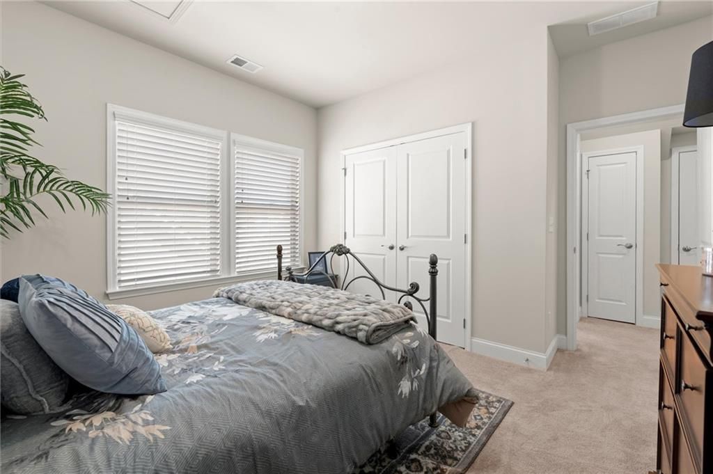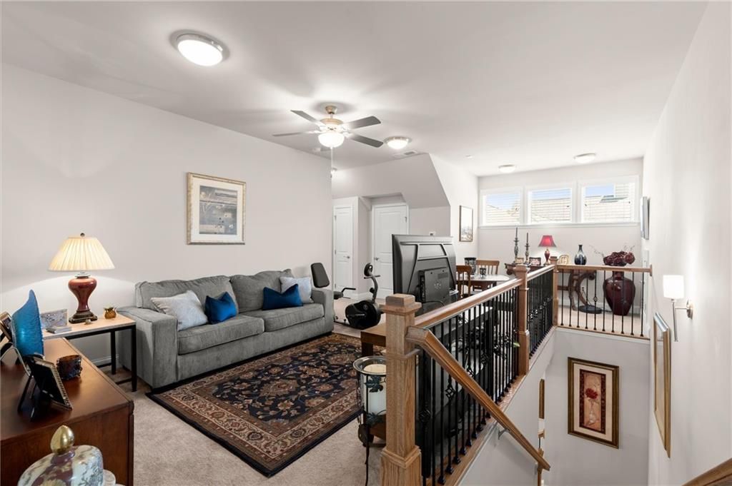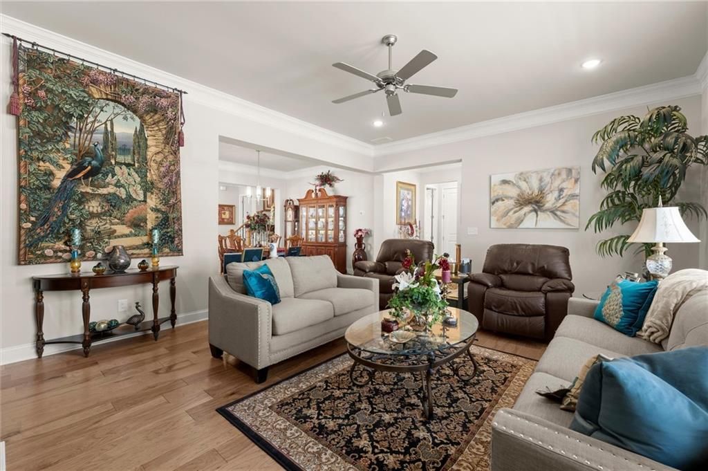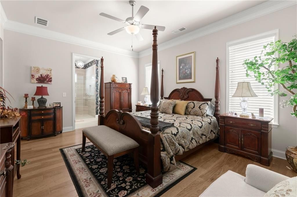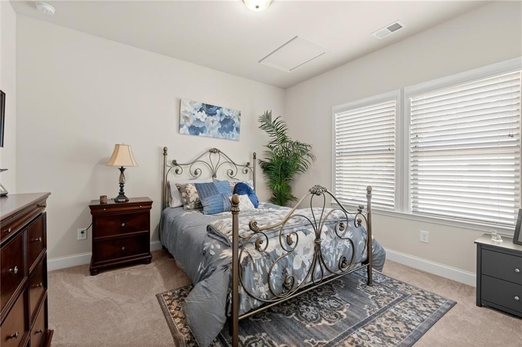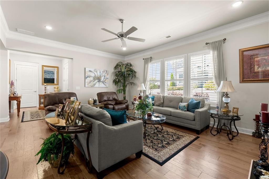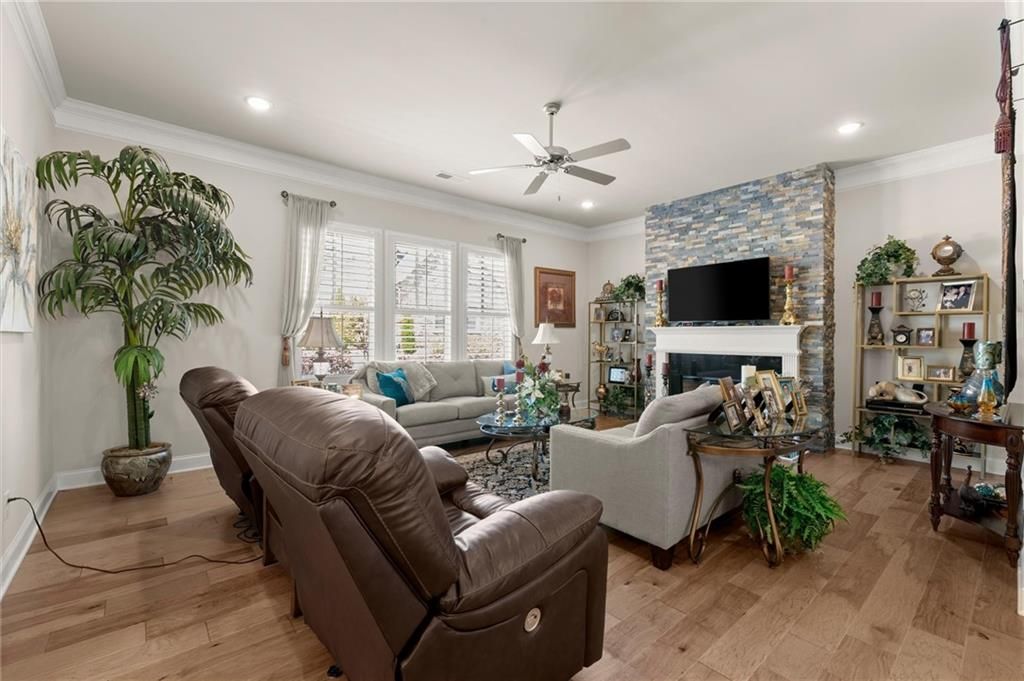 Welcome to maintenance-free living at Longleaf Battle Park, Marietta’s premier active adult gated community. This exquisite four-bedroom, three-bathroom home is defined by high-end upgrades (OVER $25K IN UPGRADES) and an open-concept layout designed for effortless entertaining. The gourmet kitchen serves as the home's centerpiece, featuring quartz countertops, under cabinet lighting, a five-burner gas cooktop with an upgraded hood vent, soft-close cabinetry, and a large walk-in pantry. Just off the kitchen, a screened-in porch offers a peaceful retreat that opens to a fenced yard finished with artificial turf, ensuring a lush view without the upkeep. The main level is highlighted by 10ft ceilings, custom plantation shutters, hardwood floors and custom crown molding that extend into the oversized primary suite. This private sanctuary includes a spa-like bathroom with a stepless entry shower, double vanities, and dual walk-in closets featuring custom shelving. The inviting living room is anchored by a custom stone gas fireplace, while the main floor also has an additional bedroom, full bathroom and a convenient laundry room complete with a sink. Upstairs, a spacious loft provides additional flexible living space alongside two large guest bedrooms and a full bathroom. The deep 2-car garage is complete with a durable Polyaspartic floor. Beyond the home, the Longleaf Battle Park lifestyle includes access to a clubhouse, swimming pool, gardening plots, and a walking trail. The HOA provides peace of mind by managing the landscaping, trash, exterior painting, and roof replacement, allowing you to fully enjoy the community's vibrant social calendar of weekly gatherings and social events. Ideally located near Kennesaw Mountain, Marietta Square, the Avenues of West Cobb, endless shopping and dining options and easy access to I-75, this property offers the perfect balance of luxury and convenience!