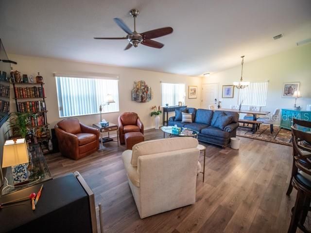 AN ASSUMABLE MORTGAGE AT JUST 5% IS AVAILABLE!!!—a rare and valuable opportunity in today’s market. Experience Premier Living in The Villages with a Smart Home Welcome to your dream home in the heart of The Villages! Situated on an oversized corner lot just minutes from Lake Sumter Landing, this exquisite three-bedroom, two-bathroom smart home effortlessly blends high-end comfort, sophisticated design, and resortstyle living. From the moment you arrive, you’ll be captivated by the immaculate curb appeal, featuring lush, professionally maintained landscaping and an inviting covered front porch—perfect for enjoying your morning coffee as the neighborhood comes to life. Step inside and be greeted by vaulted ceilings, an abundance of natural light, and luxury vinyl plank flooring that flows seamlessly throughout the main living areas. The open-concept living and dining area offers a spacious and elegant setting for both entertaining guests and enjoying quiet evenings at home. The chef-inspired eat-in kitchen is a standout, boasting granite countertops with matching backsplash, custom crown molding cabinetry with under- and over-cabinet lighting, pull-out shelving, and a breakfast bar. Premium stainless-steel appliances, including a new high-end DECO refrigerator, Bosch dishwasher, and upgraded garbage disposal, elevate the culinary experience. A ceiling fan and generous dining space add functionality and charm. The private primary suite is a tranquil retreat featuring a custom walk-in closet with built-ins, and an updated, ADA compliant en-suite bath with a quartz-topped vanity and luxurious tile walk-in shower complete with a foldable seat—ideal for comfort and accessibility. Two spacious guest bedrooms offer versatility for family, friends, or a home office, and share a beautifully appointed guest bathroom with a shower/tub combo and a sleek modern barn door. Indoor-outdoor living is at its finest in the temperature-controlled, fully enclosed Florida room with elegant tile flooring—perfect for year-round enjoyment. Step outside to your private backyard oasis, complete with a trellis-covered patio and pergola, ideal for al fresco dining, entertaining, or simply relaxing in the Florida sunshine. The oversized two-car garage includes an extended driveway, a mud sink, cabinetry, and a dedicated laundry area. Additional upgrades include a whole-house RainSoft water softener and filtration system, Wi-Fi-enabled irrigation system, Wi-Fi thermostat, updated exterior lighting, and ceiling fans throughout. The entire home is app-controlled, offering ultimate convenience and smart living. For peace of mind and enhanced value, a fire hydrant on the property may reduce insurance premiums. The roof is just 11 years old, & the home is move-in ready—furnishings are available for purchase, making your transition effortless. The community pool is just a quick two-minute golf cart ride away, & nearby amenities include Mallory Square, the Havana Country Club & Championship Golf Course, and all the dining, shopping, and entertainment Lake Sumter Landing has to offer. This is more than a home— it’s a lifestyle. Discover the elegance, convenience, & community that only The Villages can offer.