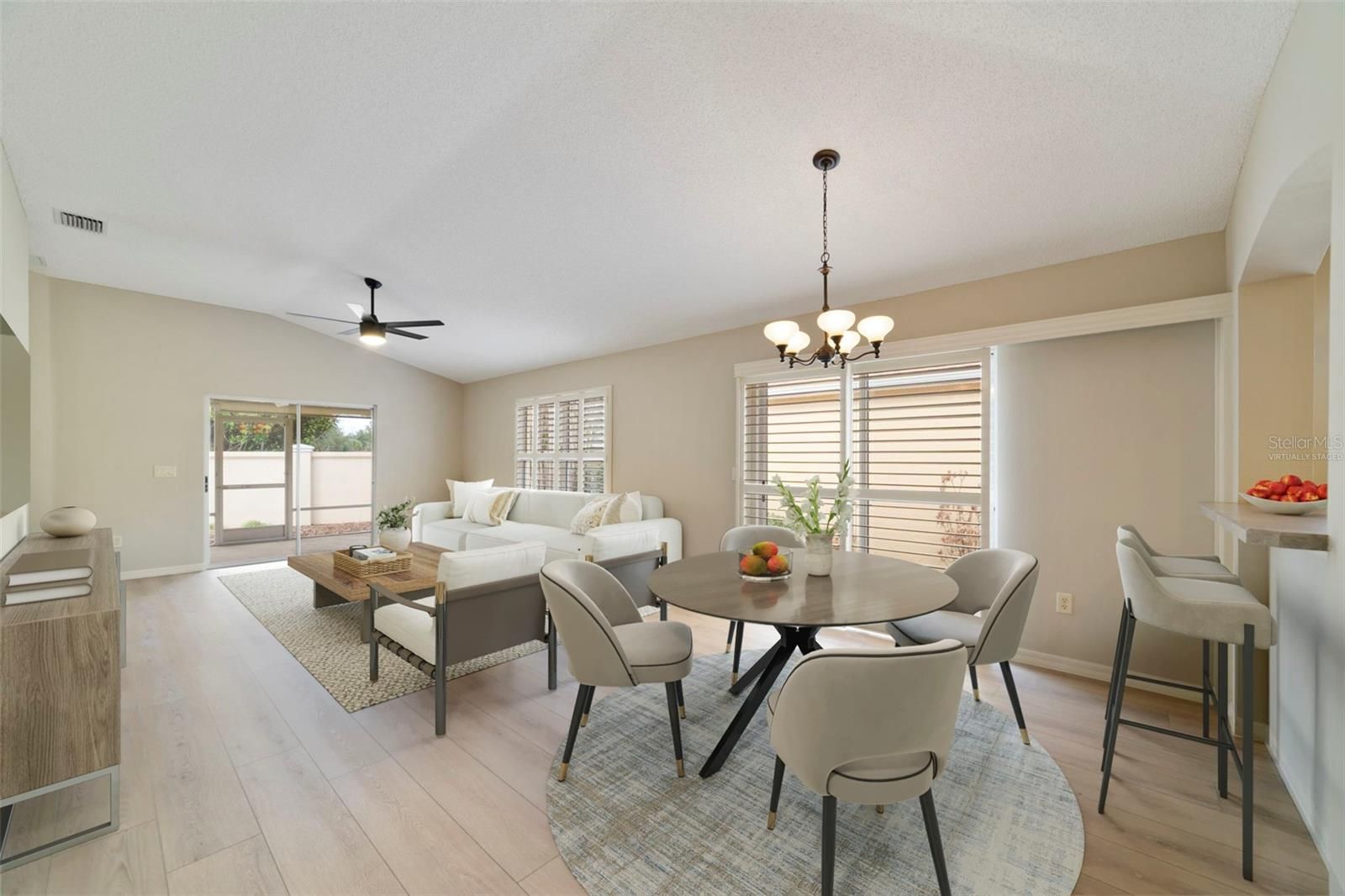 One or more photo(s) has been virtually staged. Major updates just completed in 2025 make this low-maintenance villa in the sought-after Village of Tall Trees truly move-in ready! Recent improvements include NEW LUXURY VINYL PLANK FLOORING THROUGHOUT (2025), NEW STAINLESS STEEL APPLIANCES (2025), FRESH INTERIOR PAINT (2025), and NEW CEILING FANS (2025), complemented by a NEW ROOF (2023) for added peace of mind. With a LOW BOND BALANCE of only $3,500 remaining, this home offers both comfort and long-term value in one of The Villages’ most desirable locations! Step inside to a light and bright, OPEN CONCEPT layout featuring spacious living and dining areas that flow seamlessly into a comfortable eat-in kitchen designed for everyday living and easy entertaining. The kitchen offers quality cabinetry, ample storage, a breakfast bar passthrough, and brand-new stainless steel appliances, keeping the home chef connected to the heart of the home. Plantation shutters add timeless charm, while sliding glass doors lead to a SCREENED LANAI perfect for enjoying Florida’s INDOOR/OUTDOOR LIFESTYLE year-round. The desirable SPLIT BEDROOM floor plan provides privacy for both suites - with the PRIMARY SUITE perfectly situated at the back of the home with vaulted ceilings, direct lanai access, a WALK-IN CLOSET, and a private en-suite bath. The second bedroom sits off the foyer with its own en-suite – ideal for guests or seasonal visitors. Outside, the FULLY FENCED ~ NO MAINTENANCE YARD creates a private and easy care outdoor space, and the OVERSIZED 1-CAR GARAGE offers room for both your vehicle and golf cart. A second open air patio off the dining area adds another spot to relax or entertain. Located just minutes from Lake Sumter Landing Market Square, you will enjoy convenient access to dining, shopping, entertainment, golf courses, and the unmatched lifestyle amenities that make The Villages so popular. Whether you are downsizing, investing in a seasonal retreat, or ready to embrace Florida living full time, this updated villa delivers comfort, convenience, and effortless living all in a prime location! **Seller may consider buyer concessions if made in an offer**