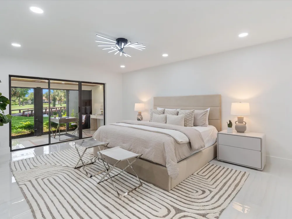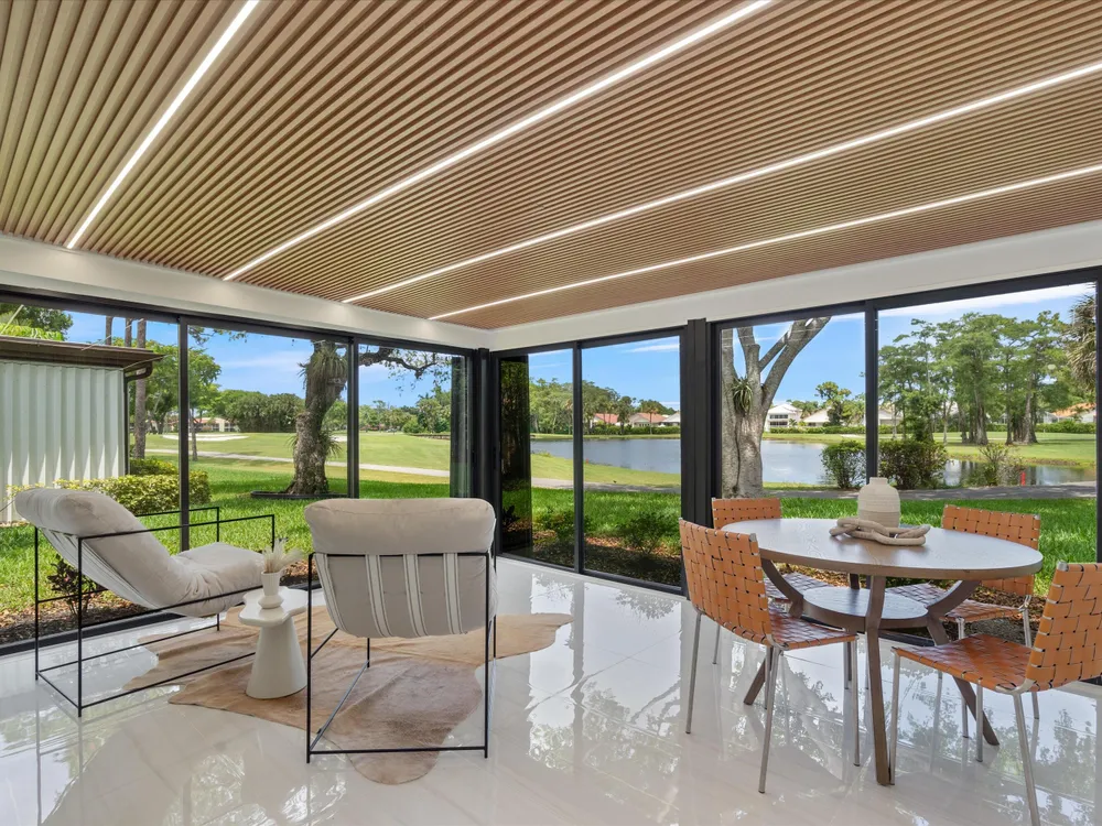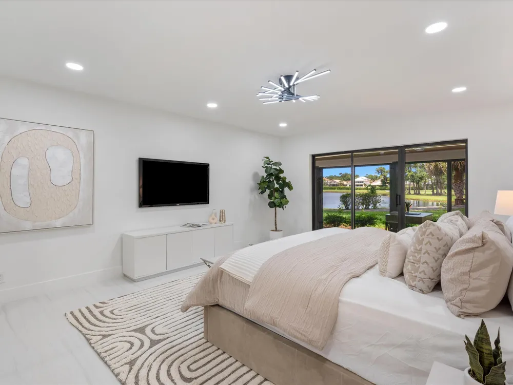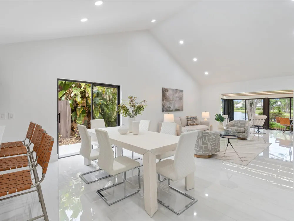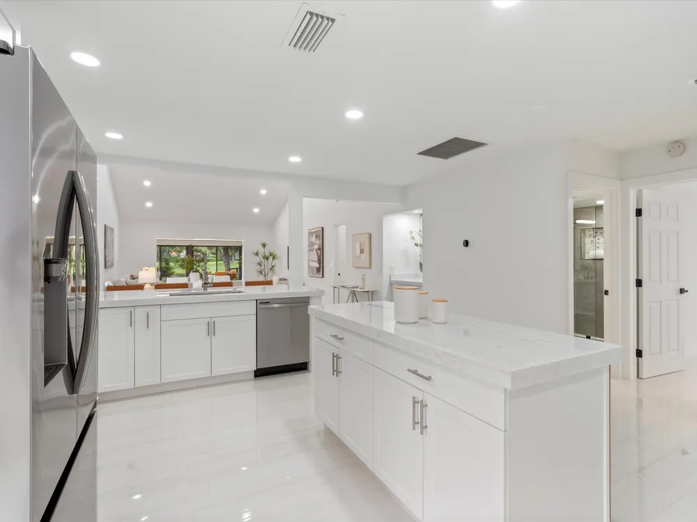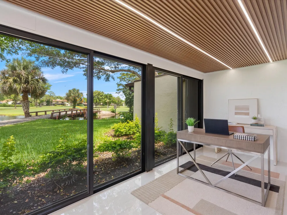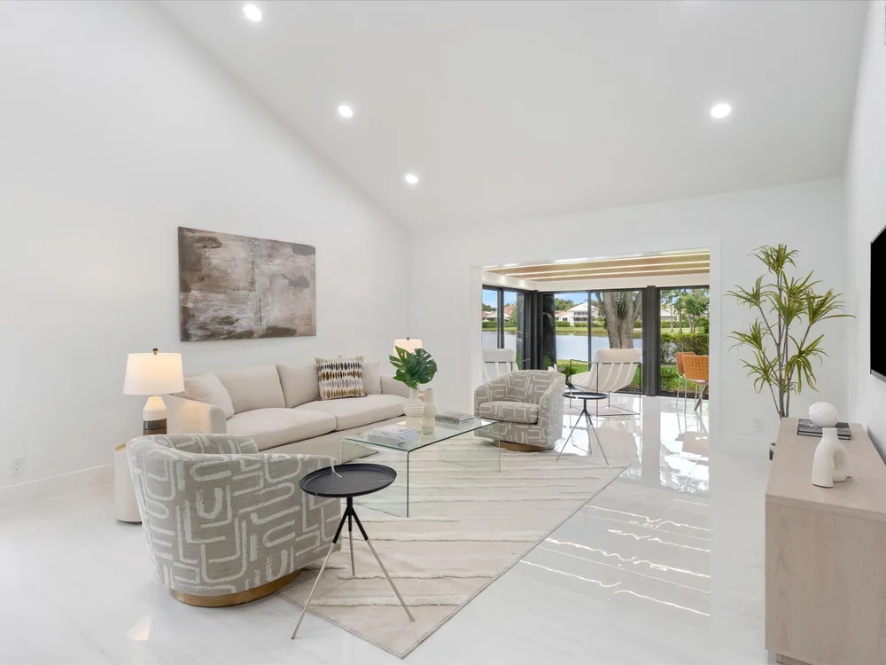 Recently updated and remodeled villa on the lake in Boca Lago. Come see one of the best views in the community! Delightfully decorated the highlight of this home is the massive enclosed patio with LED lighting in the ceiling overlooking the golf course, lake and footbridge. The roof was replaced in 2022 followed by adding new kitchen with stainless appliances, full porcelain tile throughout, ship lack accents, new bathrooms, new lighting, and so much more. This home is sure to please even the most picky buyer.