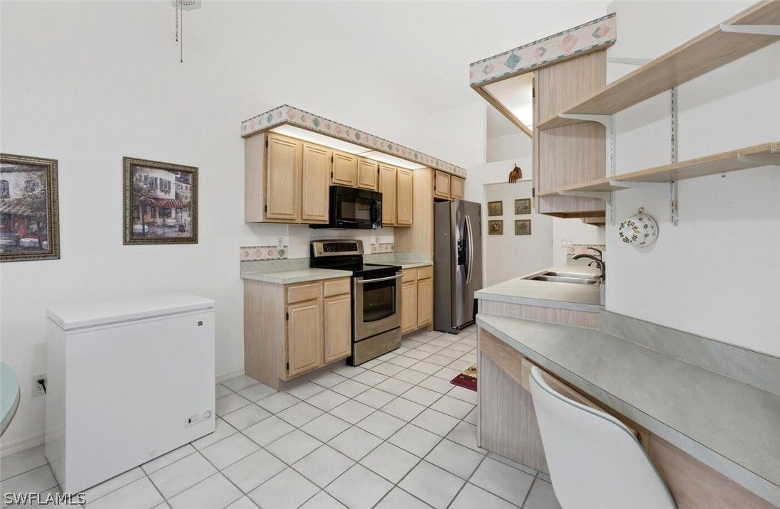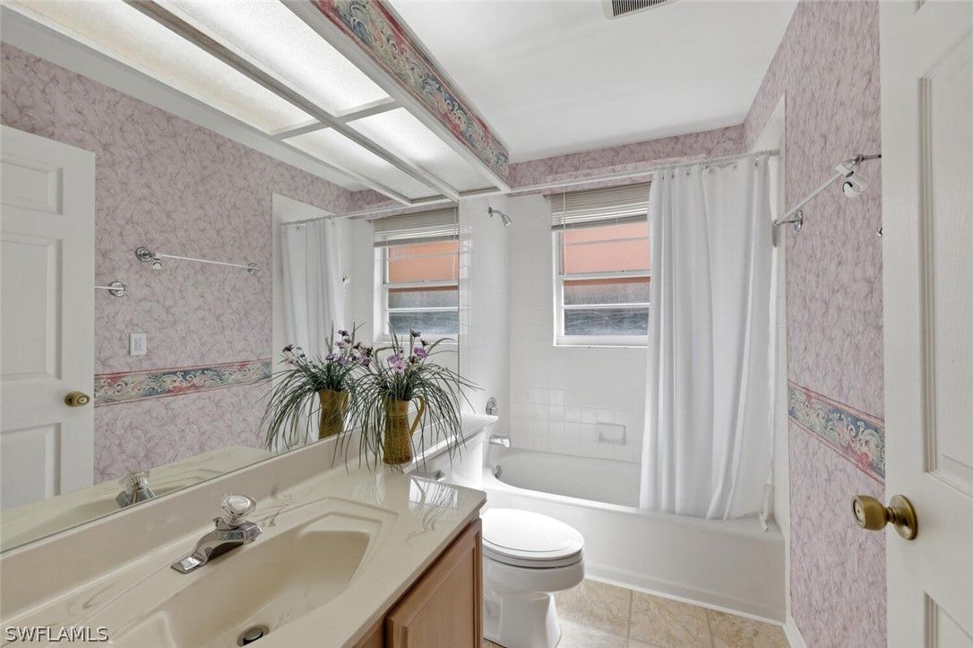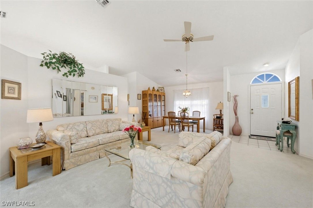 This spacious home with tremendous curb appeal is being sold Turnkey! The split floor plan is ideal for hosting guests, while the cathedral and tray ceilings lend an open, airy feel throughout. With skylights in the large Florida room, the home has natural light throughout the day and the open, landscaped space behind the home offers incredible sunsets at night. The primary suite is a true retreat, featuring a bay window with an inset seating nook and a walk-in closet. The Master BA has dual sinks and a large walk-in shower. Two independently controlled A/C units mean both partners can stay comfortable without compromise. Other features include a newer water heater (2023), solar-powered roof exhaust vents, a well for lawn irrigation, and metal storm shutters for the windows. The garage comes equipped with 2 workbenches, perfect for hobbyists. Riviera Golf Estates is a quiet and friendly 55+ community. Amenities include a newer heated saltwater pool with lap lanes, tennis/pickleball/shuffleboard courts, exercise room, bocce, billiards room, and a large clubhouse where many fun social events are held. All of this and the HOA fee is only $144 per month, and that includes your basic internet! Riviera is just a short drive to the beach (eight miles) and the restaurants on 5th Ave, making this property an exceptional opportunity for those seeking the best of Paradise Coast living.