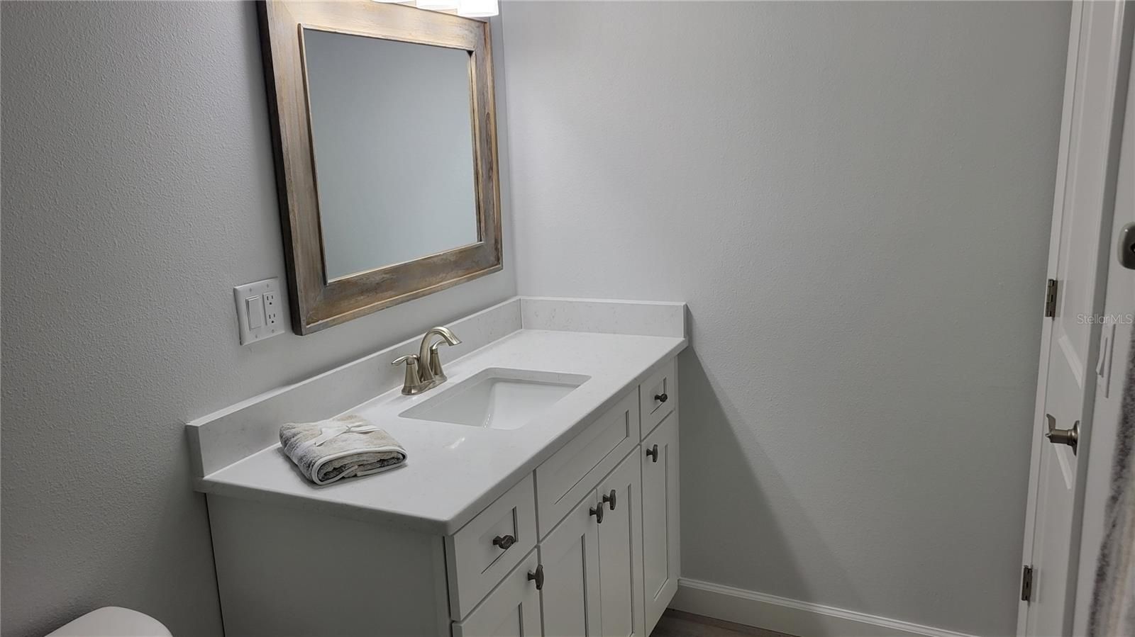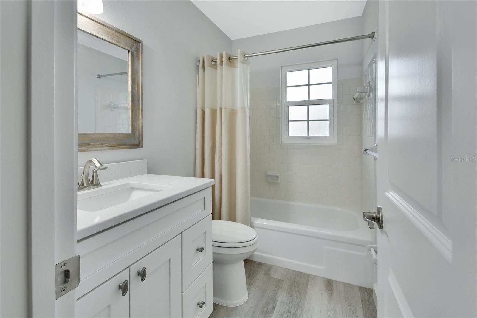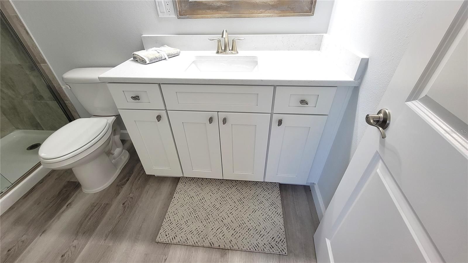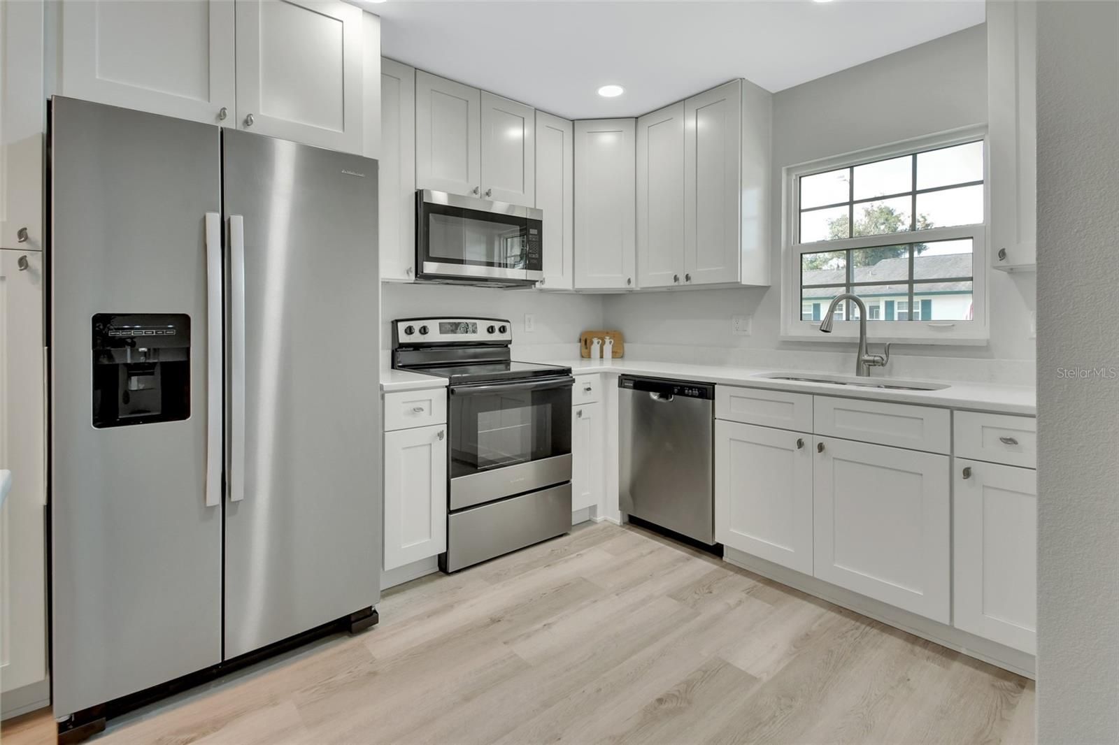 One or more photo(s) has been virtually staged. All new interior that gives an effective date of 2024 to this home. It's like a new build. Beautifully updated condominium completely remodeling, and energy efficient. Move-in-ready. Natural light flows through the new energy efficient windows and doors. New HVAC units inside and out & all new air ducts, new hot water tank, electrical work including new light fixtures and ceiling fans in every room. Open concept living featuring; crown molding, luxury vinyl plank flooring for a seamless flow throughout the home, timeless light elegant soft close 42" cabinets, a pantry cabinet, quartz counter tops and a convenient movable island for entertaining and more counter space, and all new appliances. The master bedroom features a full wall of closets, a master bathroom with beautiful warm tone porcelain tiled walk-in shower with a frameless glass door, new toilet, light quarts counter and vanity. The hallway has ample storage space with one large closet and a linen closet, tub and shower combo in full bathroom number 2, new toilet, vanity and fixtures. Bedroom number two is bright and spacious with large closet. At the back door to your outdoor space is a large laundry/utility room with extra storage. No fussing with the lawn because the grounds maintenance is all taken care of by the association, along with exterior insurance, maintenance and trash. Out back you have a patio area, and out in front is your parking. Simply a couple miles to Downtown Deland's award winning Mainstreet full of shops, restaurants and entertainment, seasonal festivities and celebrations throughout the year. Beaches are just a short 25 miles East, nearby easy access to I-4 heading south to major attractions, and the newly updated SunRail and Amtrak station is not far away. Imagine yourself living in this Beautiful 55+ Condominium, care free to enjoy life! Possible exceptions to the 55+ rule *All information is intended to be correct and must be verified by agents and buyers*