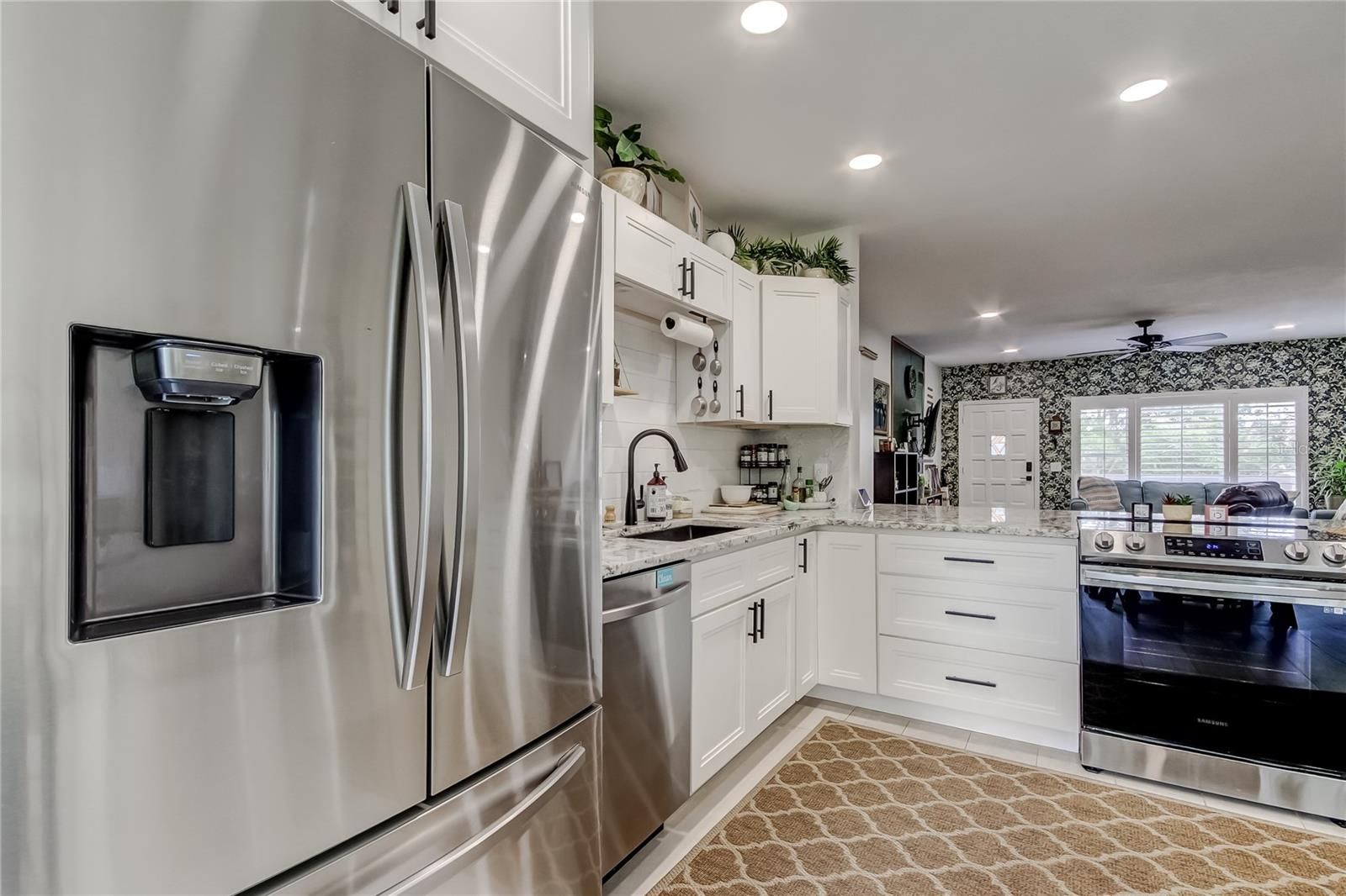 - Ceiling Fan(s), Eat-in Kitchen, Kitchen/Family Room Combo, Living/Dining Room, Open Floorplan, Main Level Primary, Solid Surface Counters, Split Bedrooms, Stone Counters, Thermostat, Window Treatments