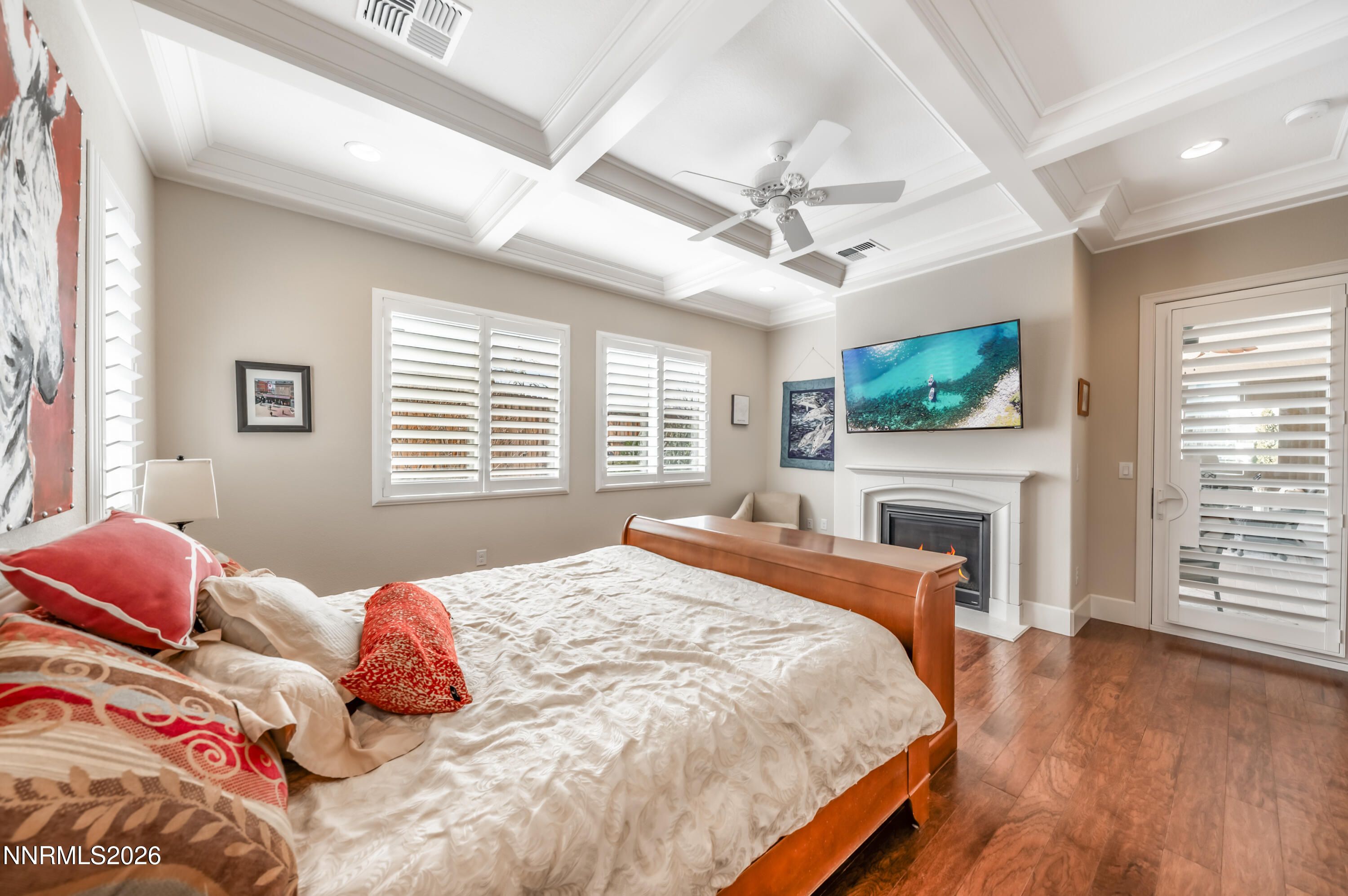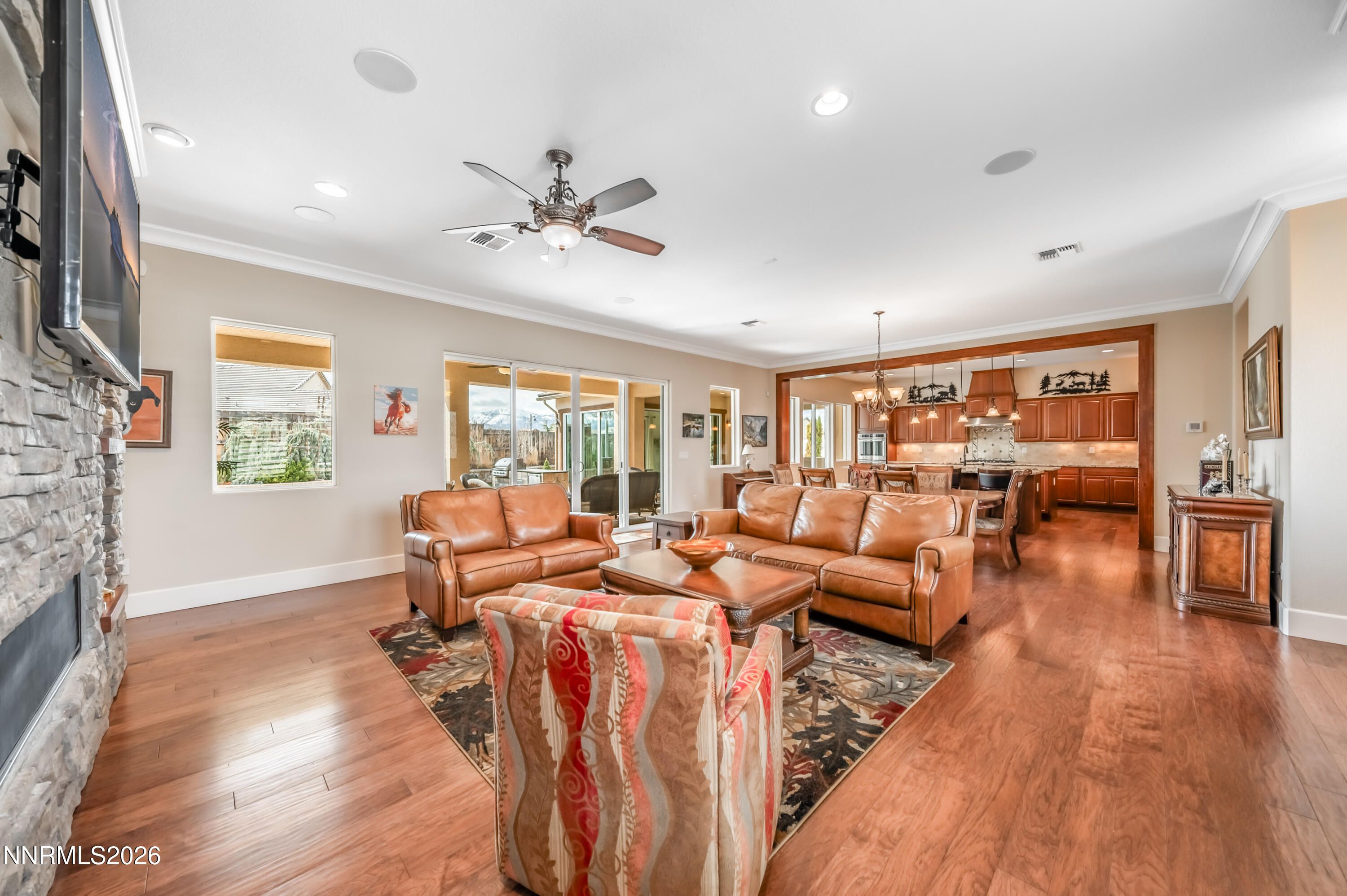 Open House this Sunday 11-3. Highly upgraded home in the gated 55+ community with beautiful Mt. Rose views. Situated on a premium corner lot with gorgeous landscaping, this home shows like a model and offers a thoughtfully designed floorplan for comfortable living and entertaining. The open layout features a spacious great room and dining area that flow into a expanded covered patio, creating seamless indoor-outdoor living. The chef's kitchen with 2 large islands and breakfast bar opens directly to the main living space. Wood floors, crown molding The flexible floorplan includes 2 bedrooms, 2.5 baths, and a detached flex room, perfect for a home office, hobby room, movie room or additional guest space. The private primary suite features a spacious bath, expansive shower, his & hers vanities and dual walk-in closets. Additional features include a custom tray ceiling w/ crown molding , fireplace and french door that leads to the covered patio. Additional highlights include wood floors, crown molding, plantation shutters. All this combined with a rare 3-car garage, overhead storage and man door to the side yard. Residents enjoy resort-style amenities including an 18,000 sq. ft. clubhouse with indoor pool and spa, fitness center, aerobics studio, game room, tennis, pickleball and bocce courts, and walking and biking trails throughout the community. Regency homeowners also have access to the Presidio clubhouse and outdoor pool within the Damonte Ranch master-planned community.