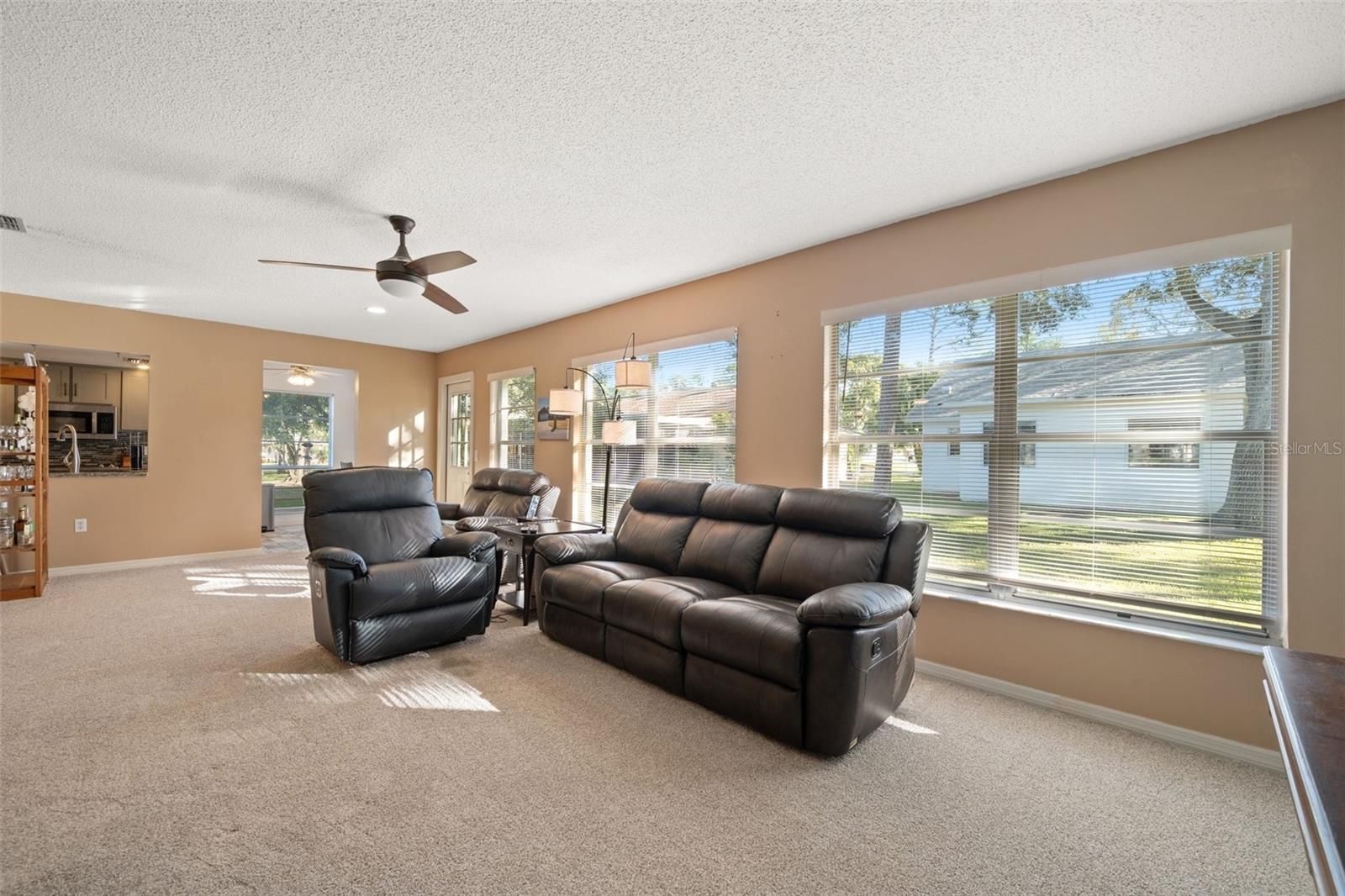 - Ceiling Fan(s), Eat-in Kitchen, Kitchen/Family Room Combo, Living/Dining Room, Open Floorplan, Main Level Primary, Stone Counters, Walk-In Closet(s), Window Treatments