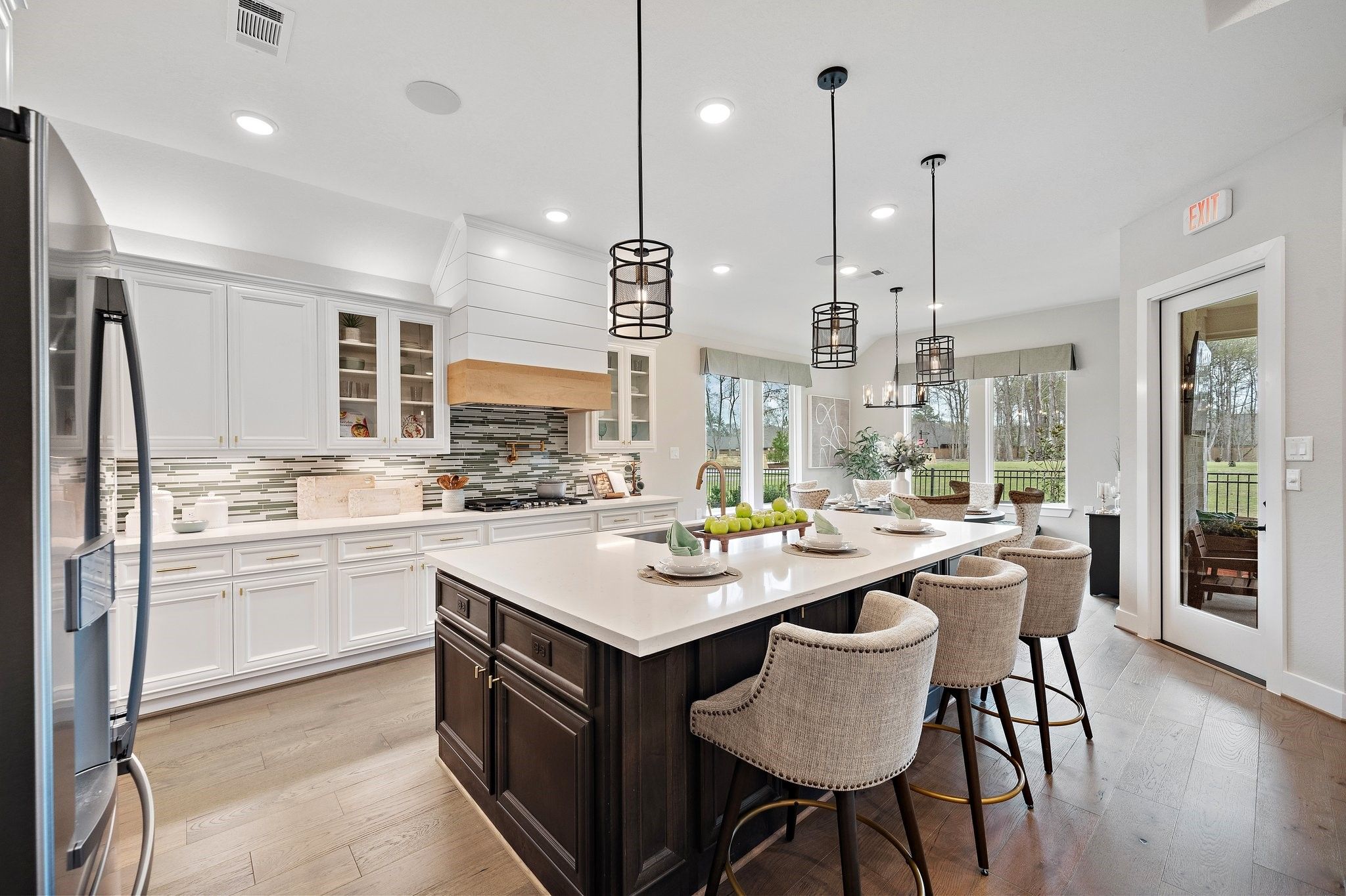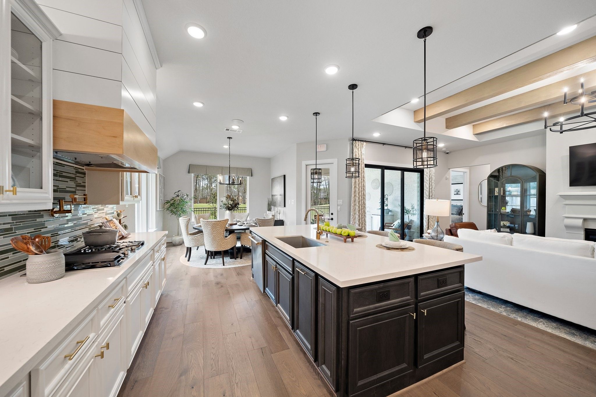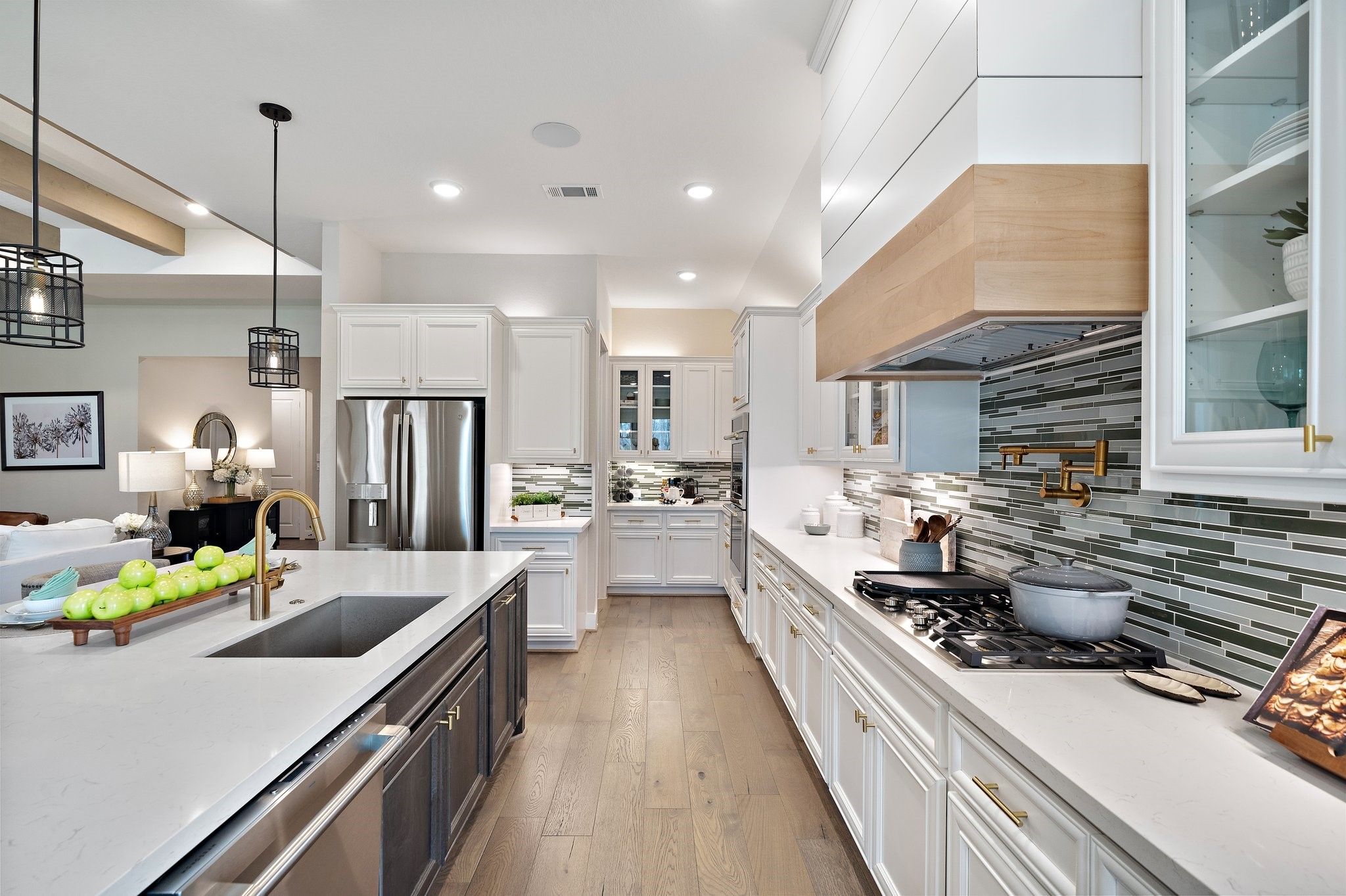- High Ceilings, Kitchen Island, Kitchen/Family Room Combo, Pantry, Pot Filler Faucet, Quartz Countertops, Self-closing Cabinet Doors, Self-closing Drawers, Walk-In Pantry, Wired for Sound, Window Treatments, Ceiling Fan(s)