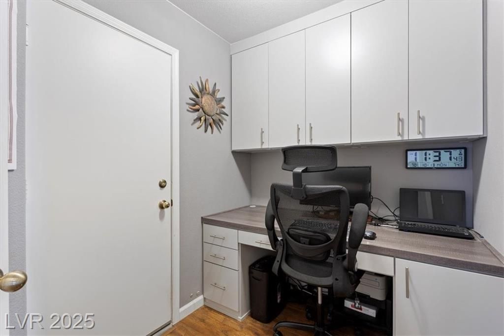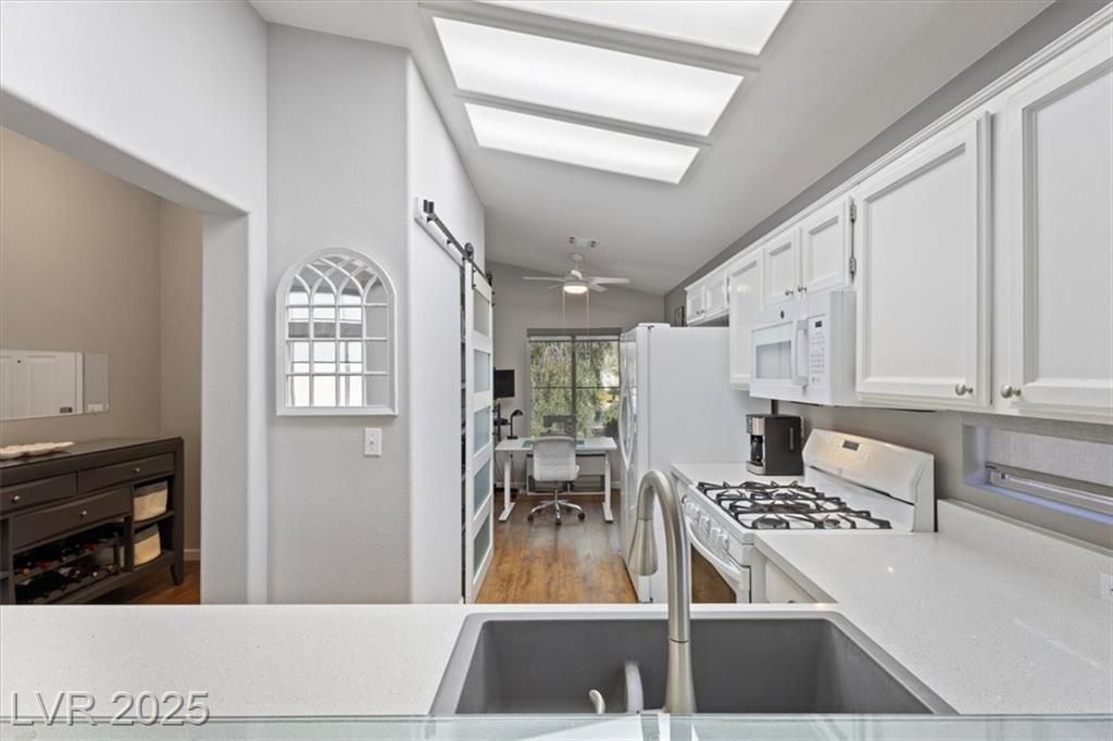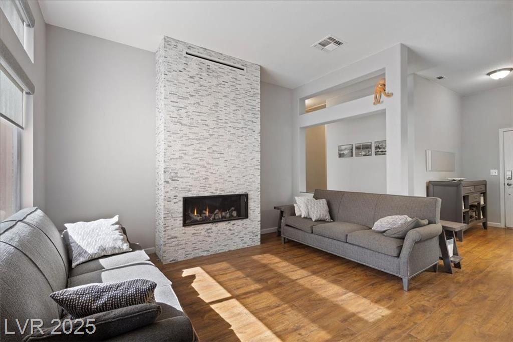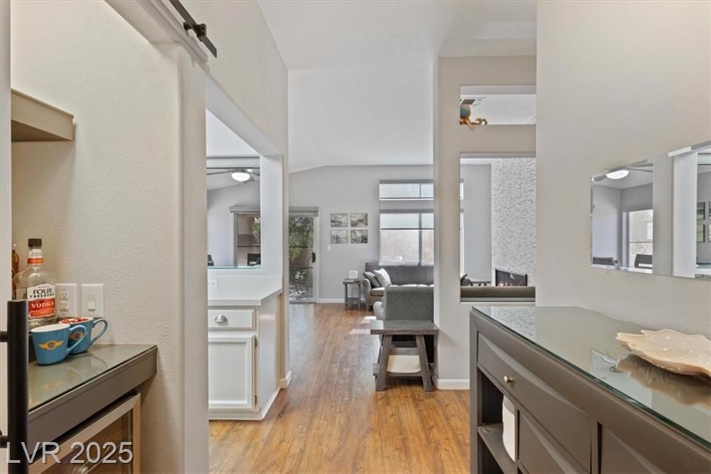 Upgraded! Front door wifi video doorbell and cypher lock. Inside, discover a stunning floor-to-ceiling fireplace. The home exudes pride of ownership! From modern barn doors covering a welcome beverage station and expanded pantry, to the fresh interior paint with a tasteful two-tone palette, model home-like features abound! Besides the energy efficient exterior solar screens, each window has a new interior covering and a complementing, selectable barrier between kitchen and dining areas. Both baths totally revitalized to meet expectations of a discerning owner. A definite “WOW”! To maximize the efficient layout, the included home office is built-in with a large desk and cabinetry. HVAC replaced in 2022 and hot water heater replaced within 4 years Ask about the subtle upgrades. Included are unseen security film, backyard fencing enhancements, private lush backyard, and more. This home is located close to the many community amenities. Come home to the best of resort-style living.