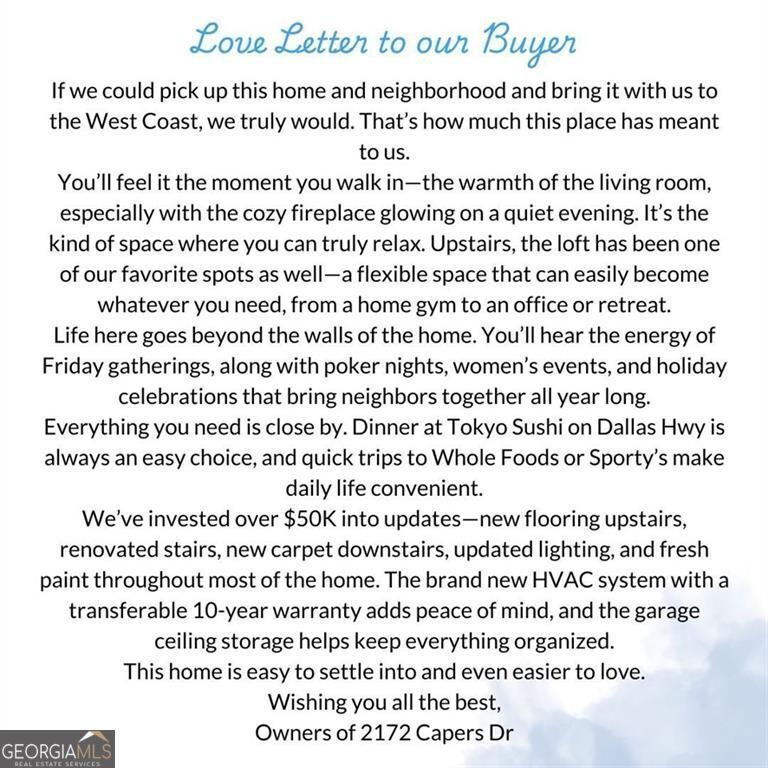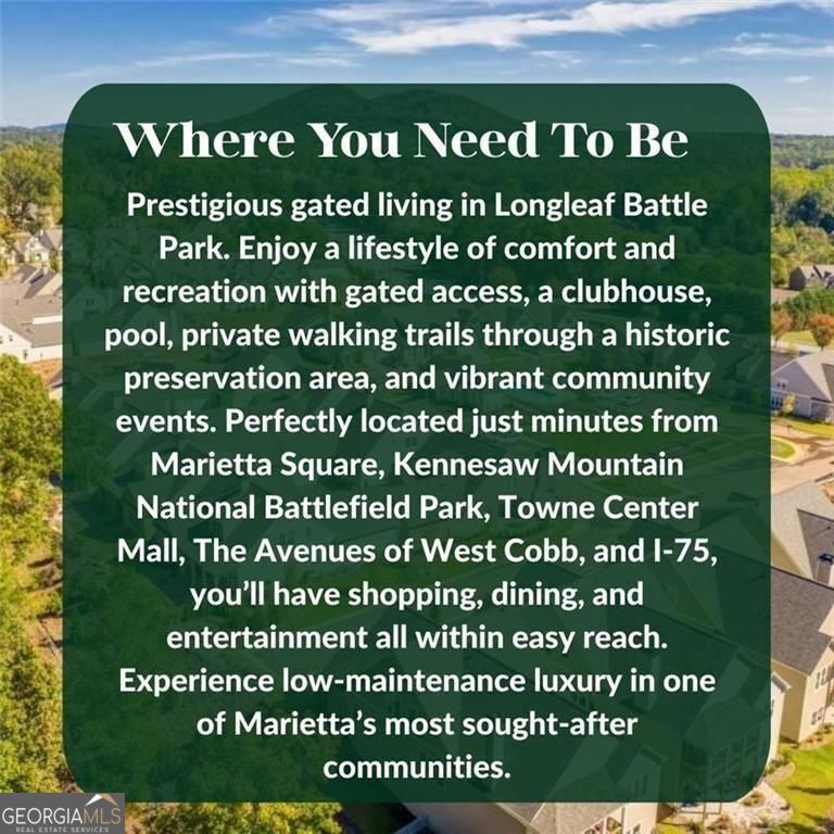 PREMIER GATED 55+ COMMUNITY WITH PRIMARY ON MAIN, $50K IN RECENT IMPROVEMENTS, AND BRAND NEW HVAC (2025) IN A LOW-MAINTENANCE, ACTIVE NEIGHBORHOOD WITH LIMITED AVAILABILITY. FROM THE OWNERS Living here has been about comfort, simplicity, and connection. From the moment you walk in, the home feels calm and easy to live in, with a layout that just works for everyday life. The primary suite on the main level has been one of our favorite features. It's spacious, quiet, and makes daily living feel convenient without having to think about stairs. At the same time, the upstairs provides the flexibility to have guests, hobbies, or additional space when needed. Inside, the home feels bright and welcoming with hardwood floors, updated lighting, and a natural flow between the kitchen, dining, and living areas. The kitchen has been a great gathering space, opening easily into the main living areas so no one feels disconnected. The primary suite also includes his and hers closets, which has made storage simple and practical. We've made thoughtful updates throughout the home, including new flooring upstairs, stair improvements, lighting, and interior paint. The new HVAC system installed in 2025 has also given us peace of mind knowing a major system has already been taken care of. The community is truly what makes this home special. There is always something happening - weekly gatherings, clubs, and events - and it's easy to get involved or simply enjoy being part of it. It's a friendly, welcoming environment where neighbors know each other and spend time together. The location has also been incredibly convenient. Being just minutes from Kennesaw Mountain and a short drive to Marietta Square makes it easy to enjoy both outdoor activities and great dining and shopping. This home has been easy to live in, easy to maintain, and full of great experiences, and we hope the next owner enjoys it just as much. FROM THE LISTING AGENT This home is positioned at the higher end of the community based on a combination of condition, updates, and overall ownership experience. Built in 2019, it offers newer construction along with approximately $50,000 in recent improvements, including updated flooring, lighting, interior paint, stair renovation, and added storage. The installation of a brand new HVAC system in 2025 with a transferable warranty removes one of the most significant near-term replacement costs for a buyer. The primary-on-main floorplan adds long-term functionality, particularly within a 55+ community where ease of living is a priority. In addition, the HOA covers landscaping, roof, and exterior painting, reducing ongoing maintenance responsibilities and creating a more predictable ownership experience. Inventory within this gated community remains limited, and homes with this level of updates, layout, and condition are not frequently available. The pricing reflects the combination of newer construction, completed improvements, reduced future expenses, and the overall lifestyle offered within the community. A compiled "Life at 2172 Capers Dr" property summary is available for review and includes the owner's perspective, documented improvements and maintenance history, neighborhood insights, and answers to KEY BUYER QUESTIONS designed to help buyers evaluate the home with clarity and confidence.