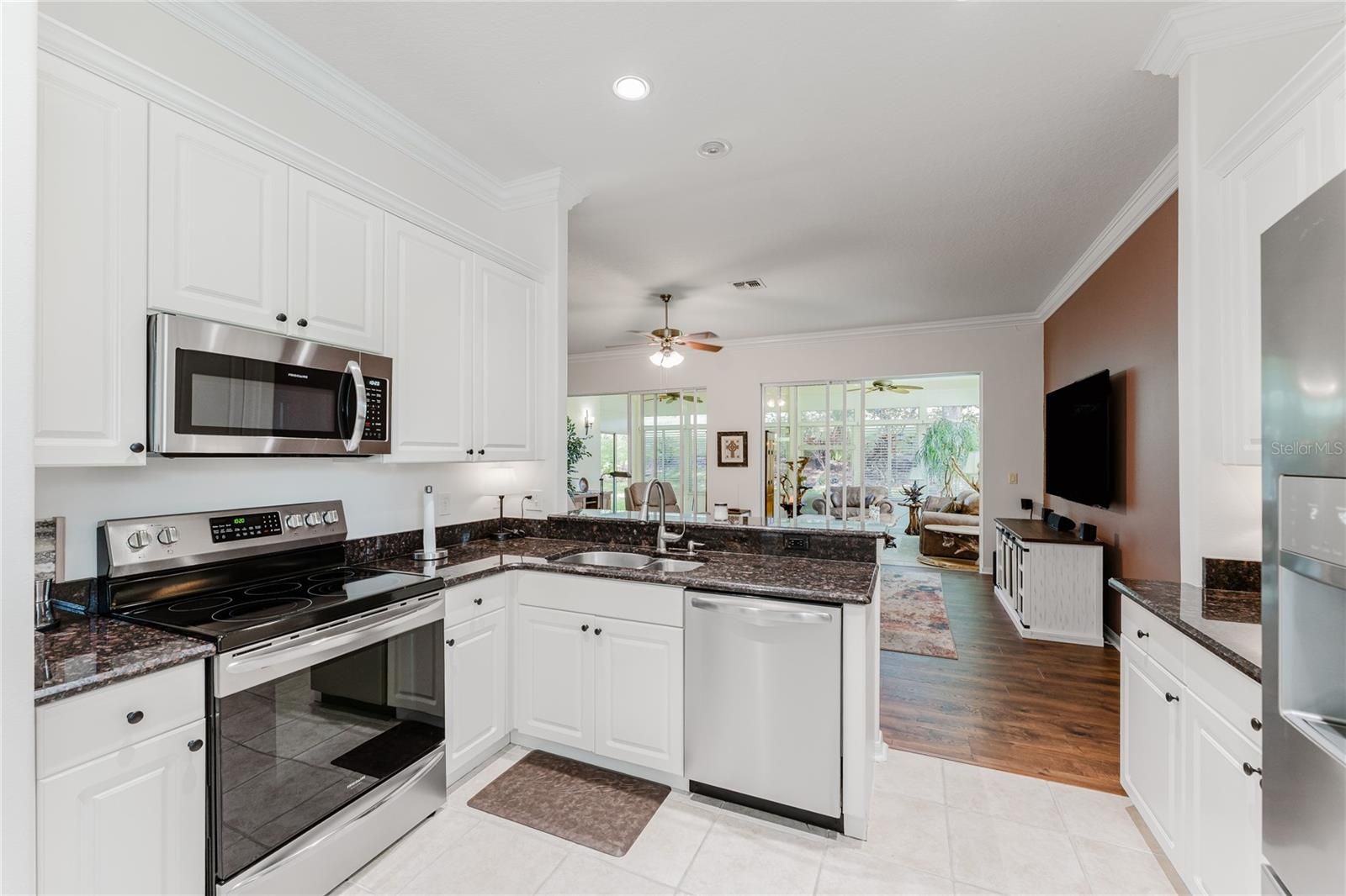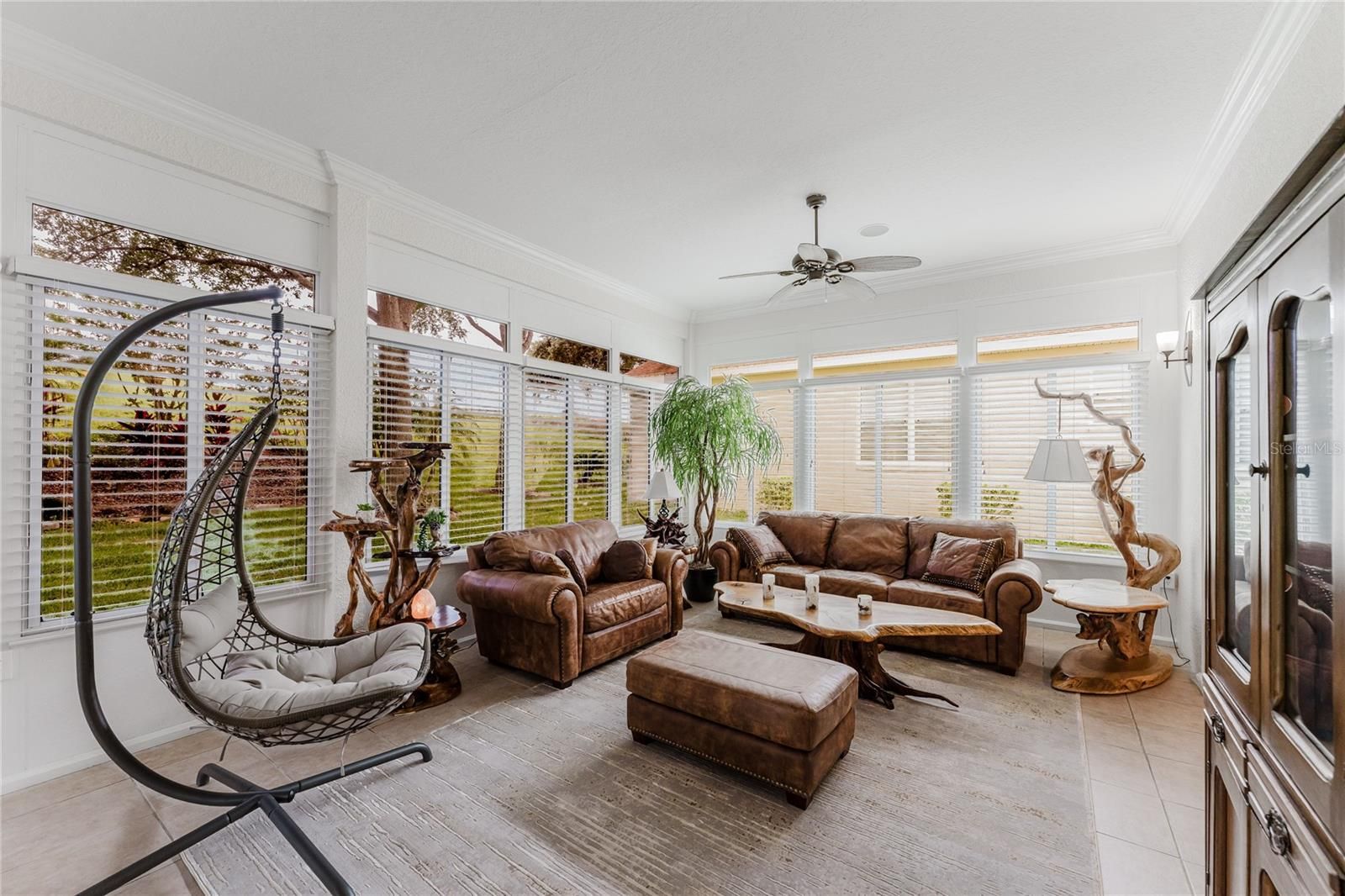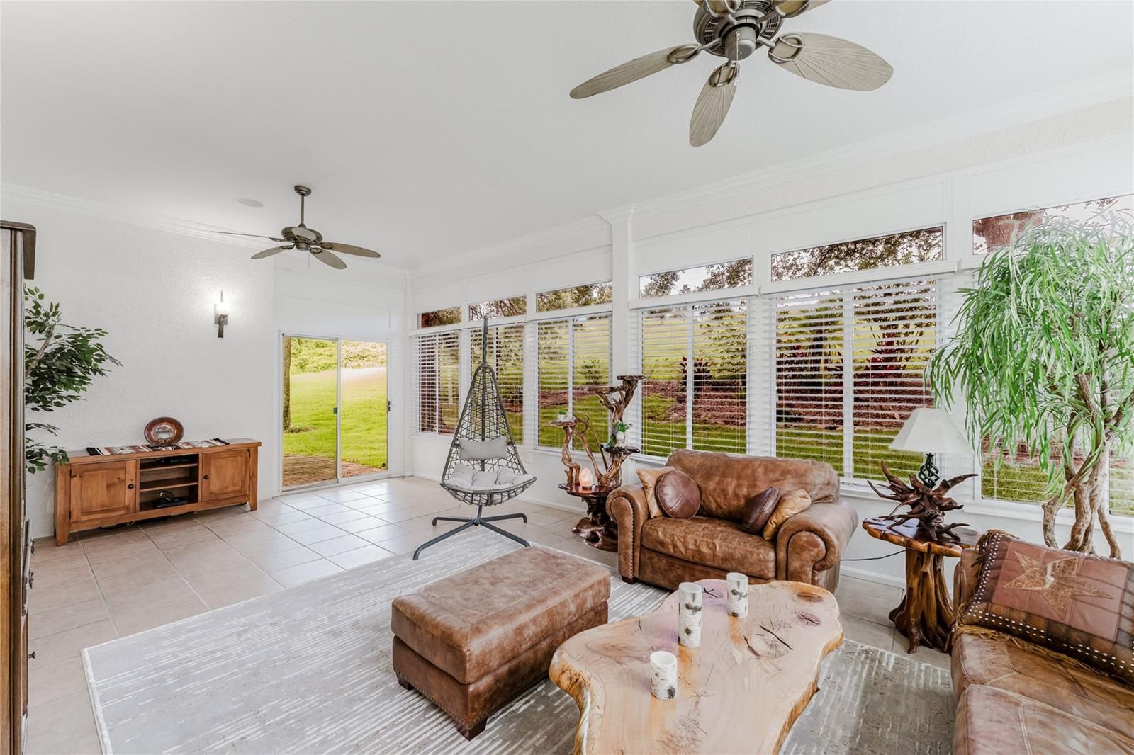 Discover HIGH-VALUE, WORRY-FREE living in this beautifully maintained 3-BEDROOM, 2-BATH home offering 1,886 square feet of OPEN-CONCEPT living space—plus 364 ADDITIONAL SQUARE FEET in the FINISHED THREE-SEASON SUNROOM overlooking a lush, landscaped backyard with NO REAR NEIGHBORS for maximum privacy. Enjoy seamless indoor-outdoor living by opening the trio of sliding glass doors to take in the tranquil views, or begin your day on the screened front porch (with no-see-um mesh) ideal for your morning coffee and watching the sunrise. Located on a QUIET, LOW-TRAFFIC CUL-DE-SAC, this home provides peace of mind with a BRAND-NEW ROOF AND GUTTERING (June 2025), a high-efficiency A/C and furnace, and newer stainless steel Whirlpool appliances—including refrigerator, stove, microwave, and dishwasher. Stylish design upgrades include granite countertops, rounded corners, architectural arches, large ceramic tile, laminate flooring throughout—no carpet!—and crown molding accenting the entire home. The spacious open floor plan is perfect for entertaining or relaxed living. The HOA includes yard mowing, shrub trimming, expanded TV, and high-speed internet, offering true low-maintenance convenience. Located in Summit Greens, a gated 55+ community with 24-HOUR SECURITY, residents enjoy a wide range of amenities: clubhouse with classes and social activities, indoor/outdoor pools, sauna, hot tub, billiard room, ballroom, tennis, shuffleboard, and pickleball courts. Adjacent to the Clermont National Golf Course, enjoy access to The View—a modern venue with state-of-the-art driving range, restaurant, and outdoor food court with live music, big screen TVs, and panoramic views of Central Florida. This is active 55+ living at its best—schedule your private showing today!