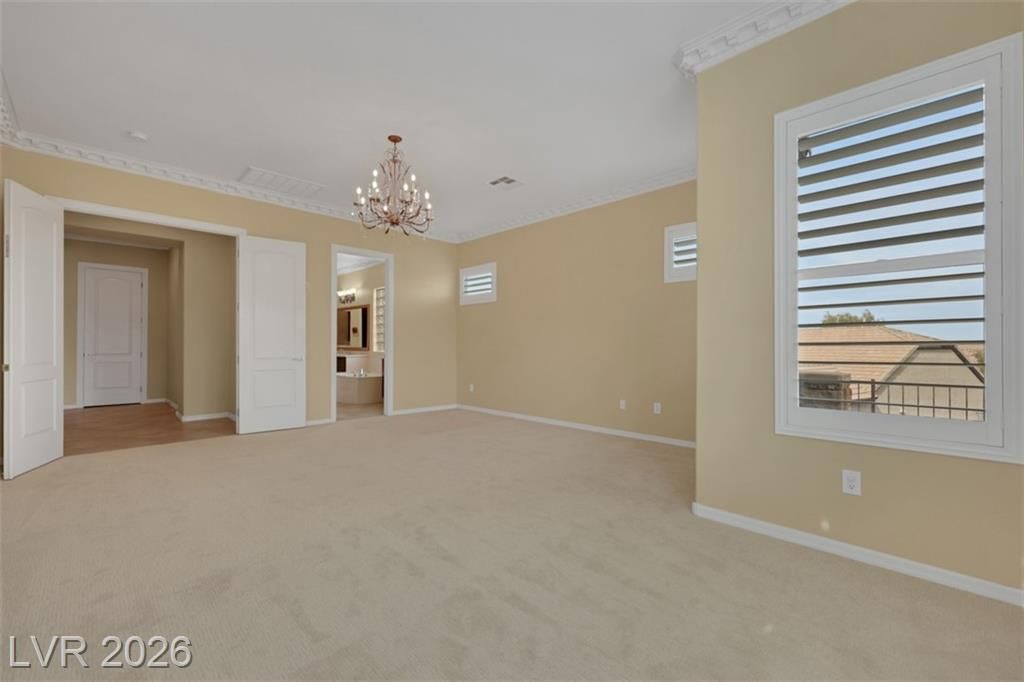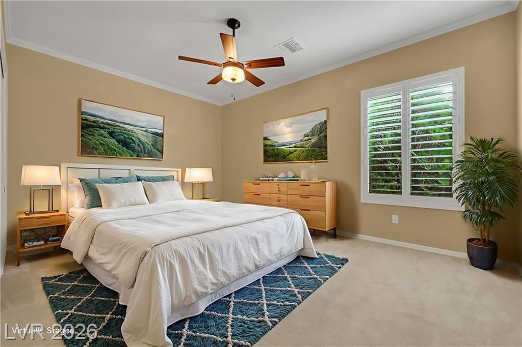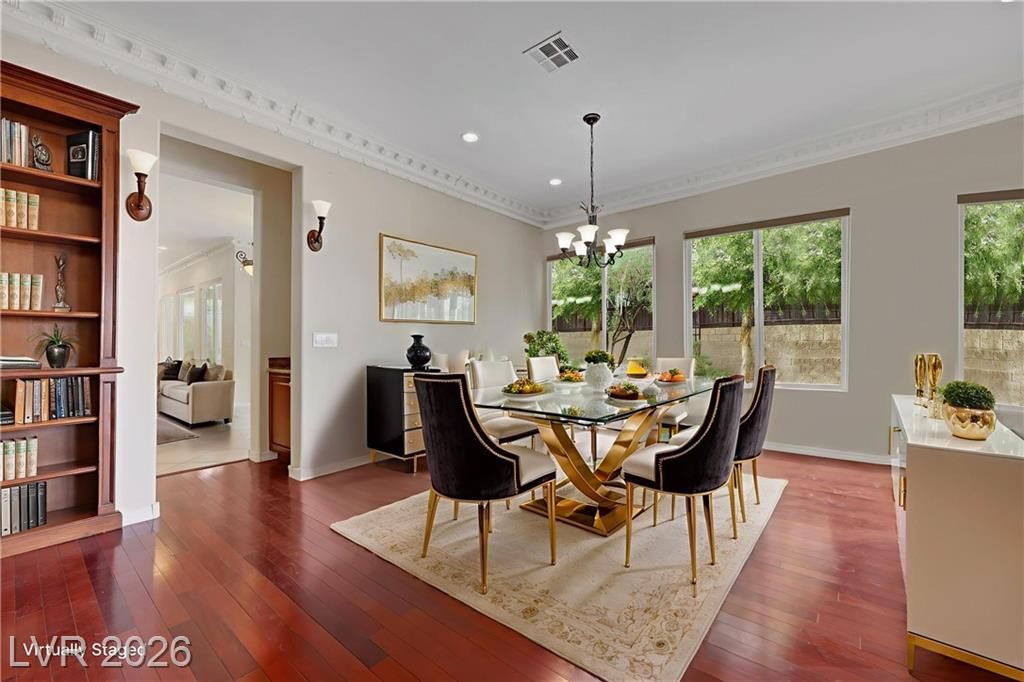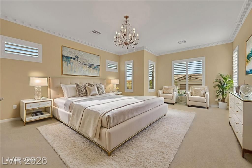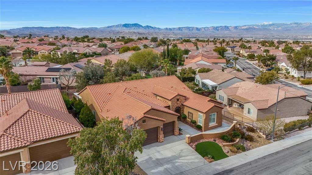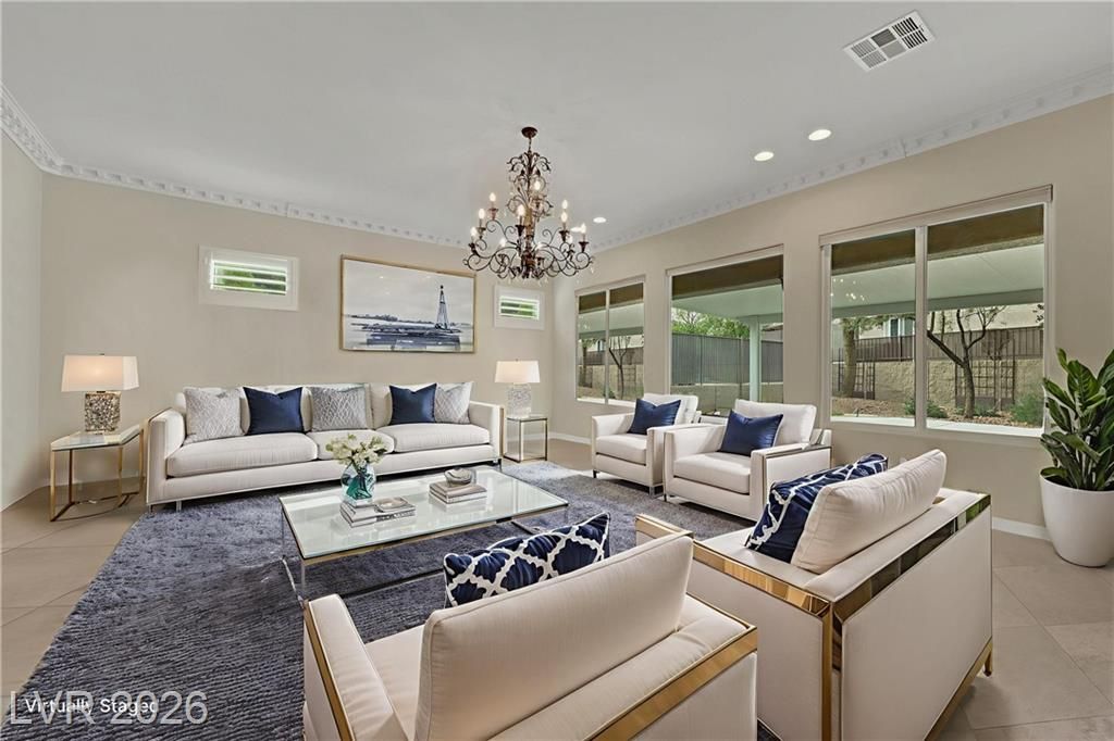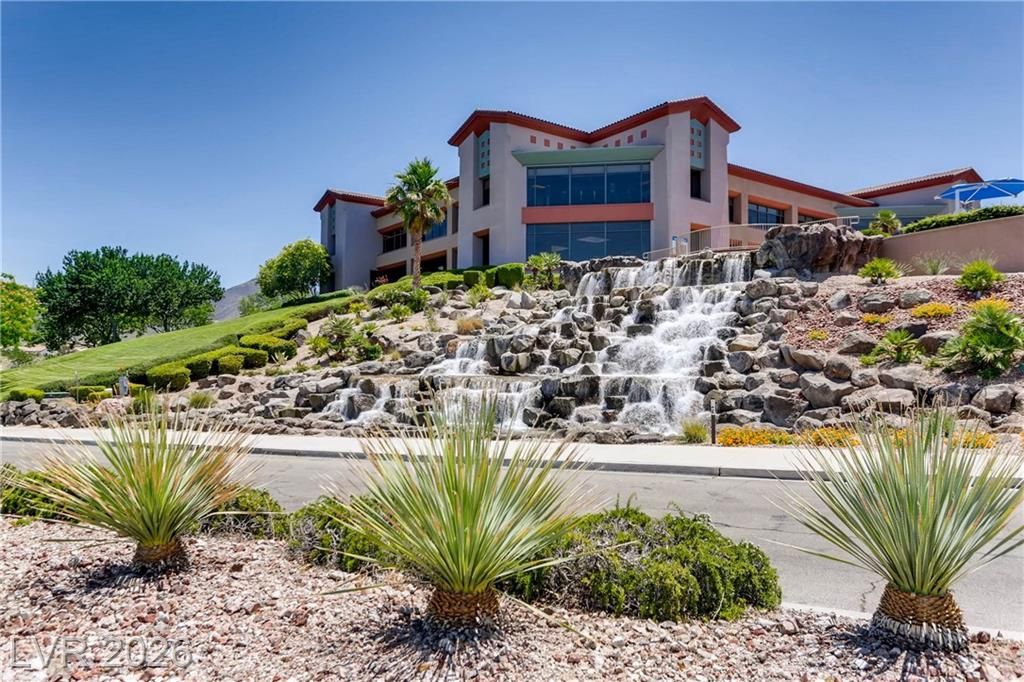 Pristine Charleston model,2 ensuites,den,2.5 baths,3 car grg. An elegant stone waterfall sets a relaxing tone as you unlock the custom iron gate to the double glass door entry! Great room features dining area,wet bar,Designer Doors & Majestic VIEWS of Mount Charleston! Family room/kitchen/breakfast area features granite countertops,stacked stone Island and backsplash,SS GE profile appliances,LG refrigerator,under mount lighting.Walk in pantry & bright Breakfast Nook lead out to shady patio! Spacious laundry room w SS washer/dryer,custom cabinets and sink.Plantation shutters,blinds & Crown moulding are extras! Patio w extended solid patio cover, Rolladen Shutters & sitting platforms add to this designer park-like backyard. VIEWS of the LAS VEGAS STRIP can enjoyed from your ELEVATED front courtyard! A short walk to the Liberty Center or the Anthem Center you find indoor/outdoor pools,fitness center,classes,golf,tennis,pickle ball,over 60 clubs,a theater,billards,wood shop & NEW friends!