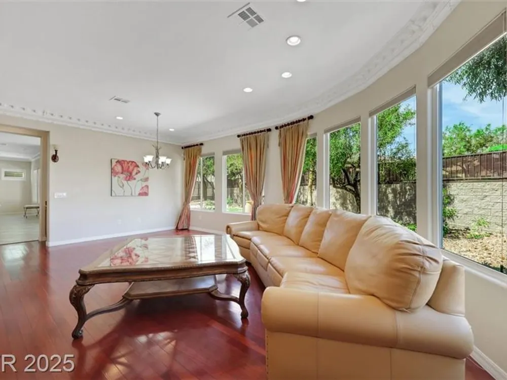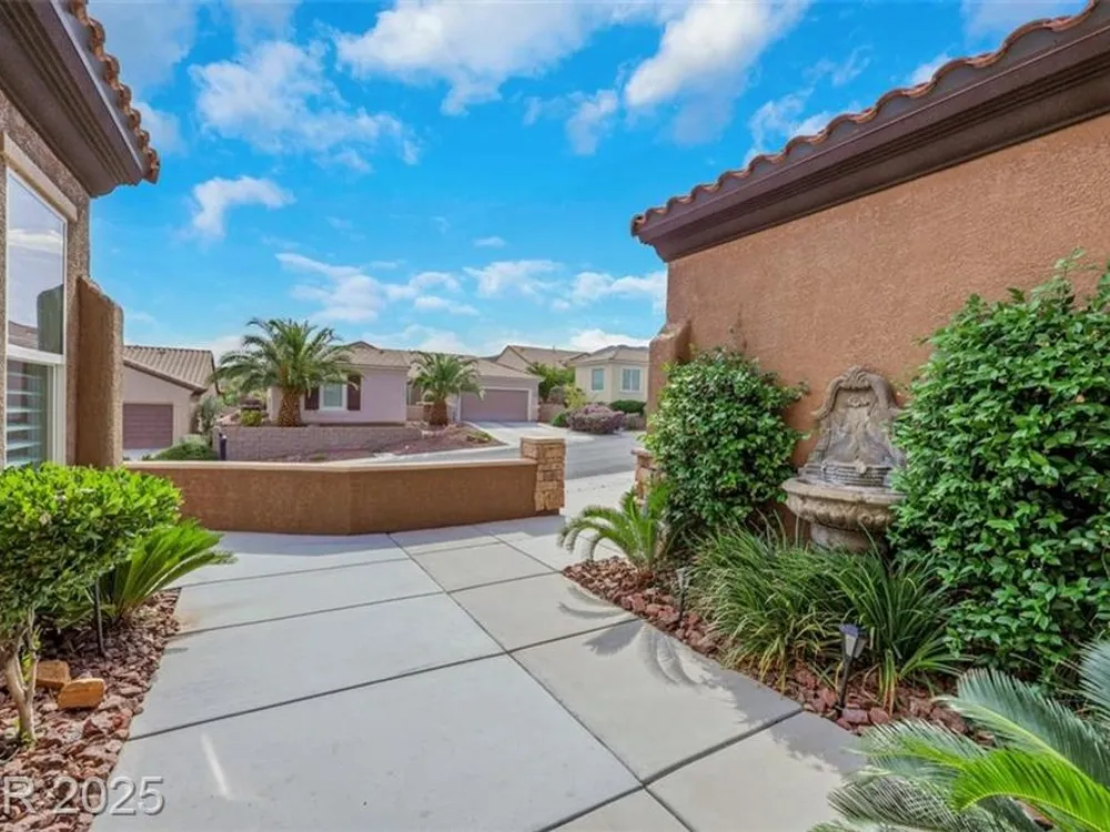Stunning 2 Bd + Den, 2.5 Ba (3172 sq ft) Charleston model on a quiet interior street in the heart of Sun City Anthem (55+) just blocks away from both Community Centers. Perched on a 9000+ sq ft lot, this home has been beautifully maintained inside & out. Curb appeals starts w/turf & desert landscapes, new exterior paint, front courtyard w/Strip views, water feature, custom glass entry doors & iron security gate. Interior features lots of relaxation, entertainment & dining options w/many designer touches. 10 ft ceilings, custom wooden doors, new paint, built-in bookcases, lighted crown moulding, high-end window coverings, rock & tile backsplash kitchen features, upgraded light/plumbing/fan fixtures, custom closets, SS appliances, custom mirrors. 2nd bedroom has in-suite full bath. Large interior laundry room leads to large 3-car garage. Rear yard is peaceful, private & well shaded w/large patio areas & mature landscaping. Home is completely move-in ready & has low taxes & low HOA fees.