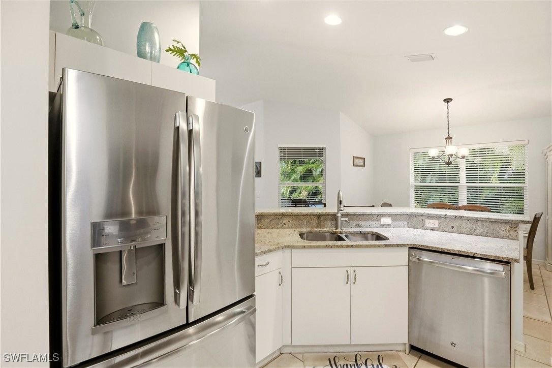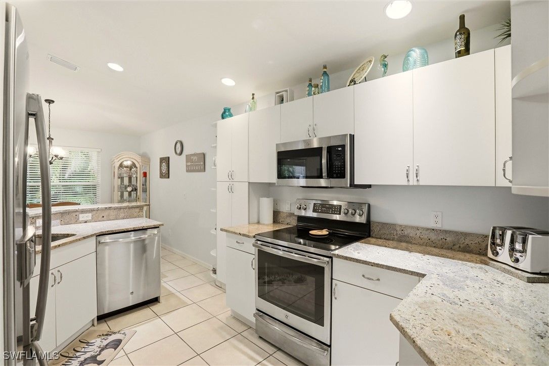 Seller says bring offers. This comfortable and well maintained 3 bedroom, 2 bath home in Riviera Golf Estates, a desirable and very active 55+ community, is offered turnkey and truly move in ready. With 1,419 square feet under air and vaulted ceilings, the home feels open and spacious, making it ideal for everyday living and entertaining. The kitchen features granite countertops, stainless steel appliances, and updated fixtures. Tile flooring runs through the main living areas, while Dream Weaver carpet adds comfort in the bedrooms. Major updates include a new roof and new HVAC system installed within the past year, offering peace of mind for years to come. Impact shutters are installed on all windows and doors. A private well for lawn irrigation helps keep water costs low. There is nothing to update or purchase. Simply bring your swimsuit, golf clubs, and pickleball paddle and start enjoying the Naples lifestyle. Riviera Golf Estates is a vibrant and very active 55+ community offering a heated community pool, tennis courts, pickleball, and an exercise room, along with a full calendar of social activities for residents. The community is conveniently located close to downtown Naples, beaches, shopping, and fine dining. Best of all, the HOA fees are among the lowest in town and include basic cable. If you are looking for easy, low maintenance living that is ready from day one, this home checks all the boxes.